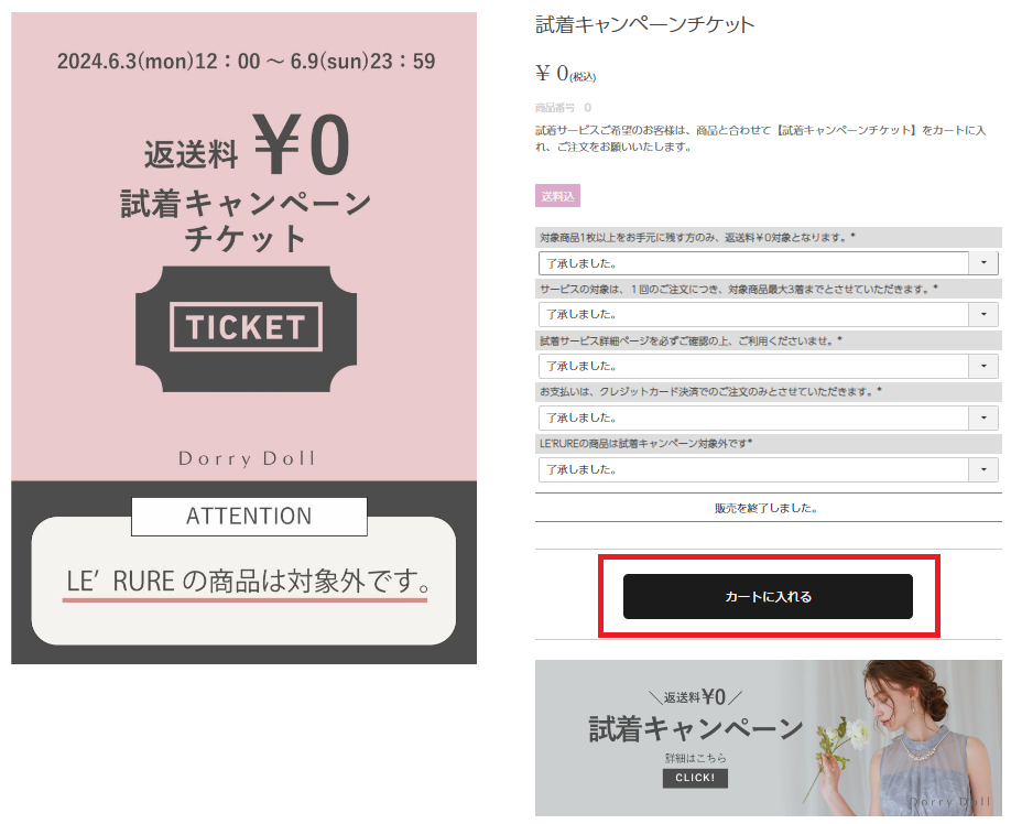 申し訳ございませんが、チケットを入れ忘れてしまった場合、試着キャンペーン対象外とさせていただいております。 予めご了承ください。