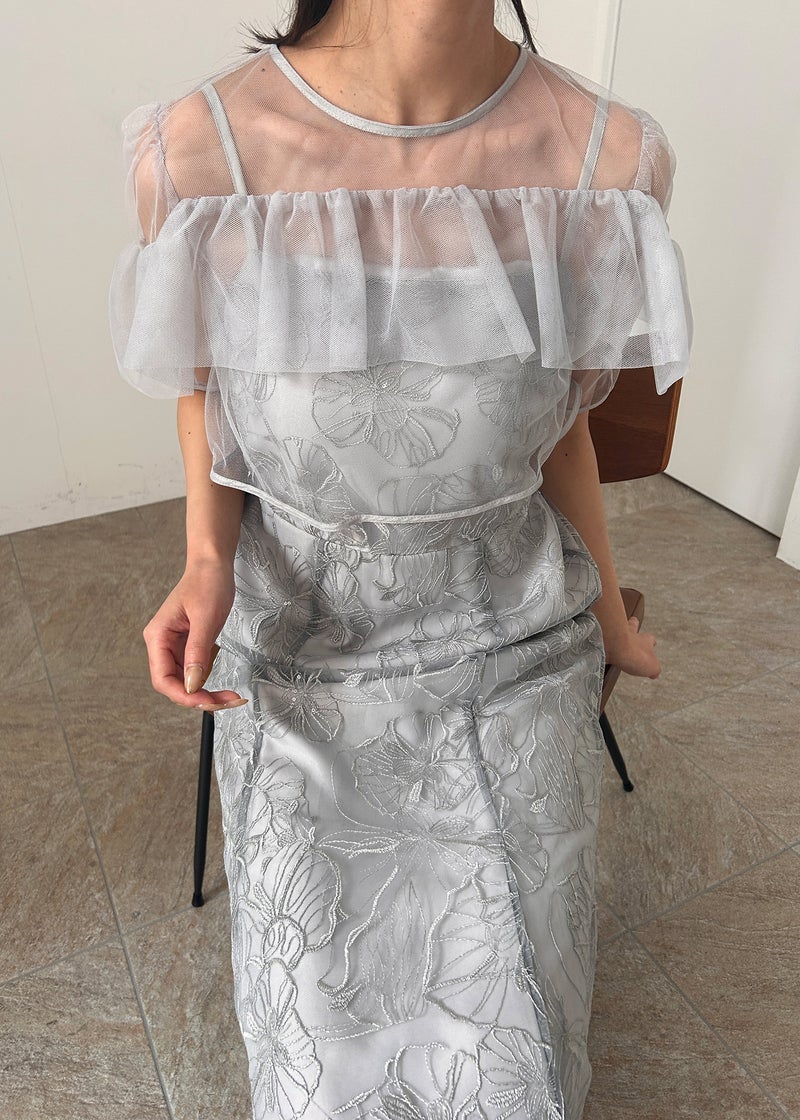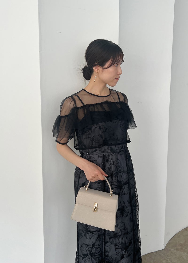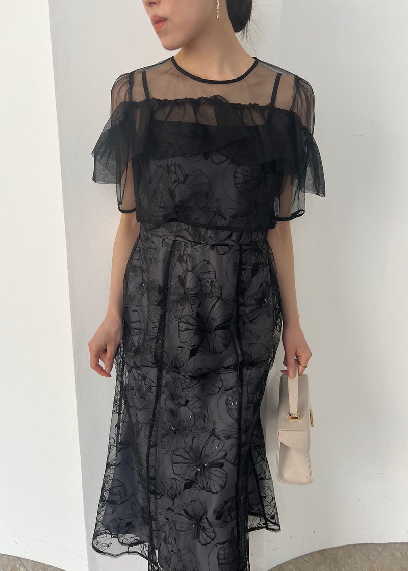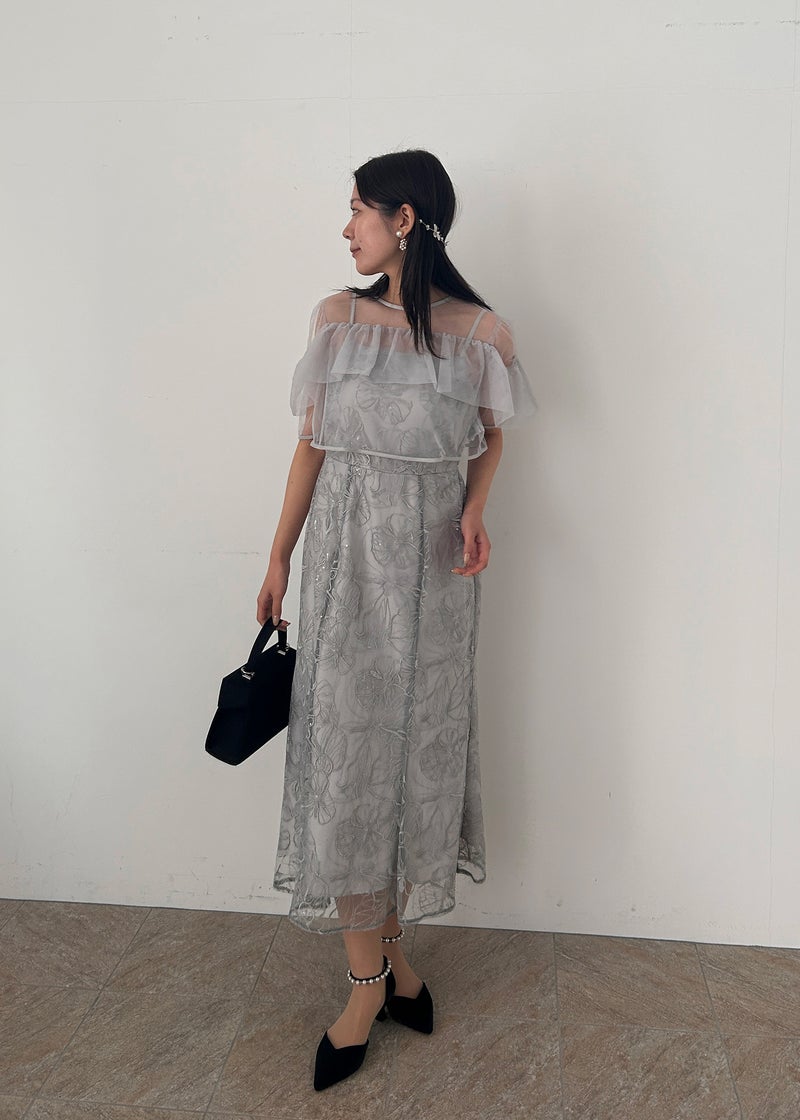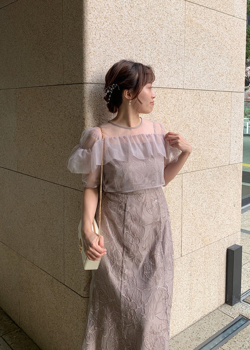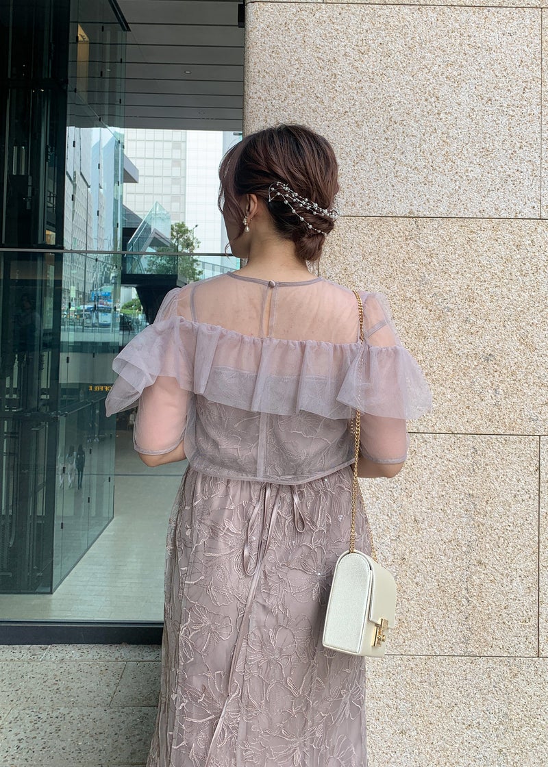 エアリーな透け感と繊細なレース生地が、上品なフェミニンさを醸し出すセットタイプのお呼ばれドレスです。 デコルテには軽やかなシアー素材を使用したヨークフリルを施し、顔まわりを華やかに演出。 無地のシアーボレロにしたことで、程よい抜け感ある雰囲気がポイントです! キャミワンピには、さりげなくきらめくスパンコールを織り交ぜたフラワーレースを使用し動くたびに上品な輝きをプラス。 甘さのあるディテールながら、くすみカラーで大人っぽく着こなせる一着に仕上げました。 タイト過ぎないIラインデザインでスタイルアップ効果もあり、アジャスター付きのロング丈が縦のラインを美しく引き立てます。 ※商品画像は光の当たり具合や端末など、閲覧環境により、 実際の色味と異なって見える場合がございます。予めご了承ください。