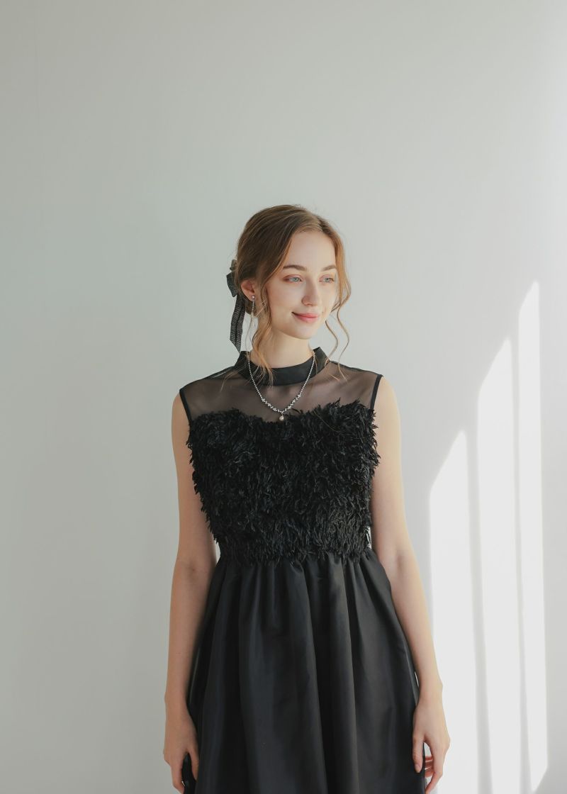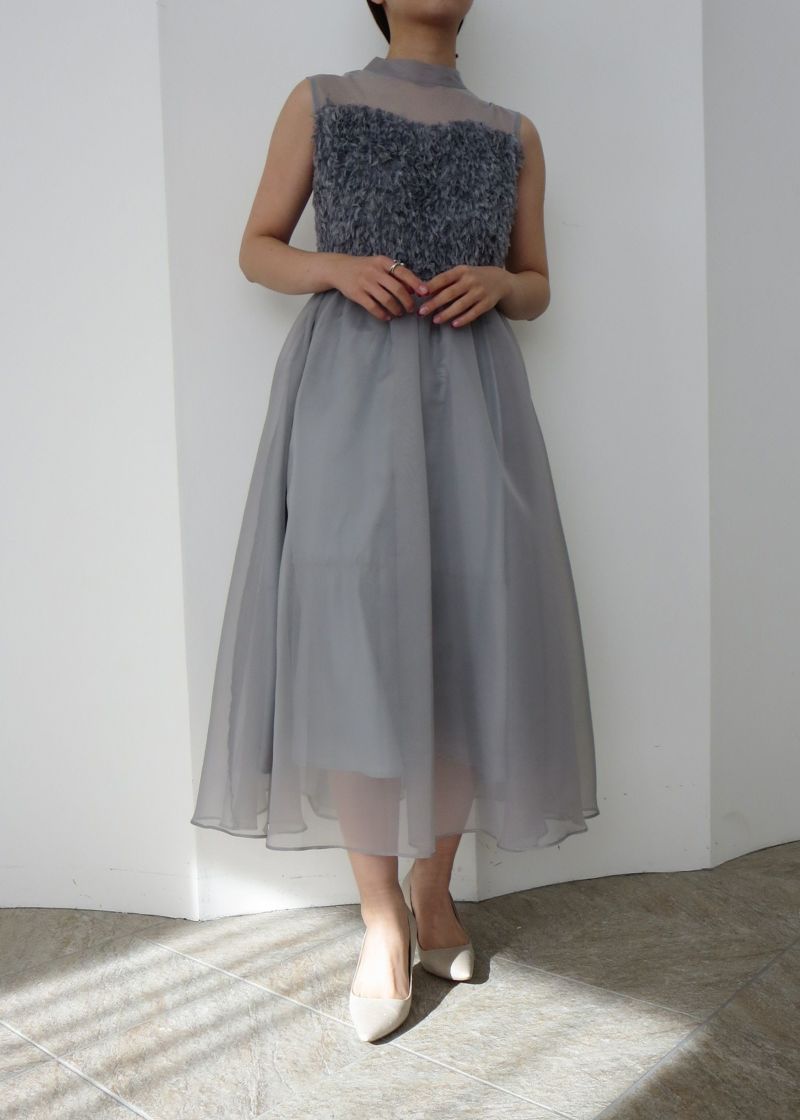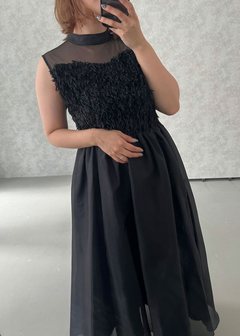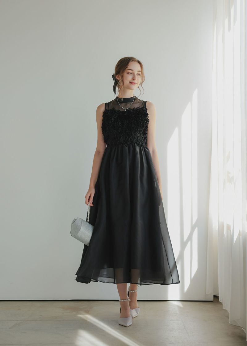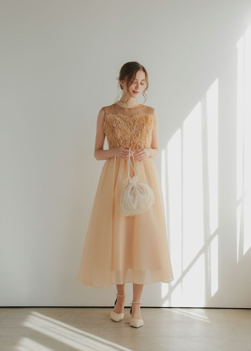 胸元にあしらったフリンジデザインが目を惹くドレス。