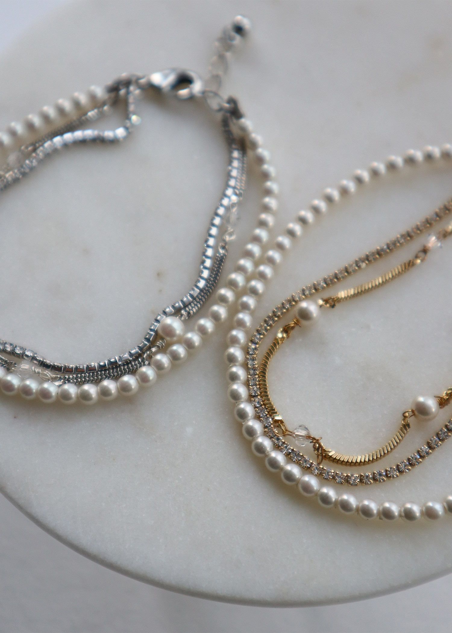 パールとラインストーンを3連にしたパーティーブレスレット。