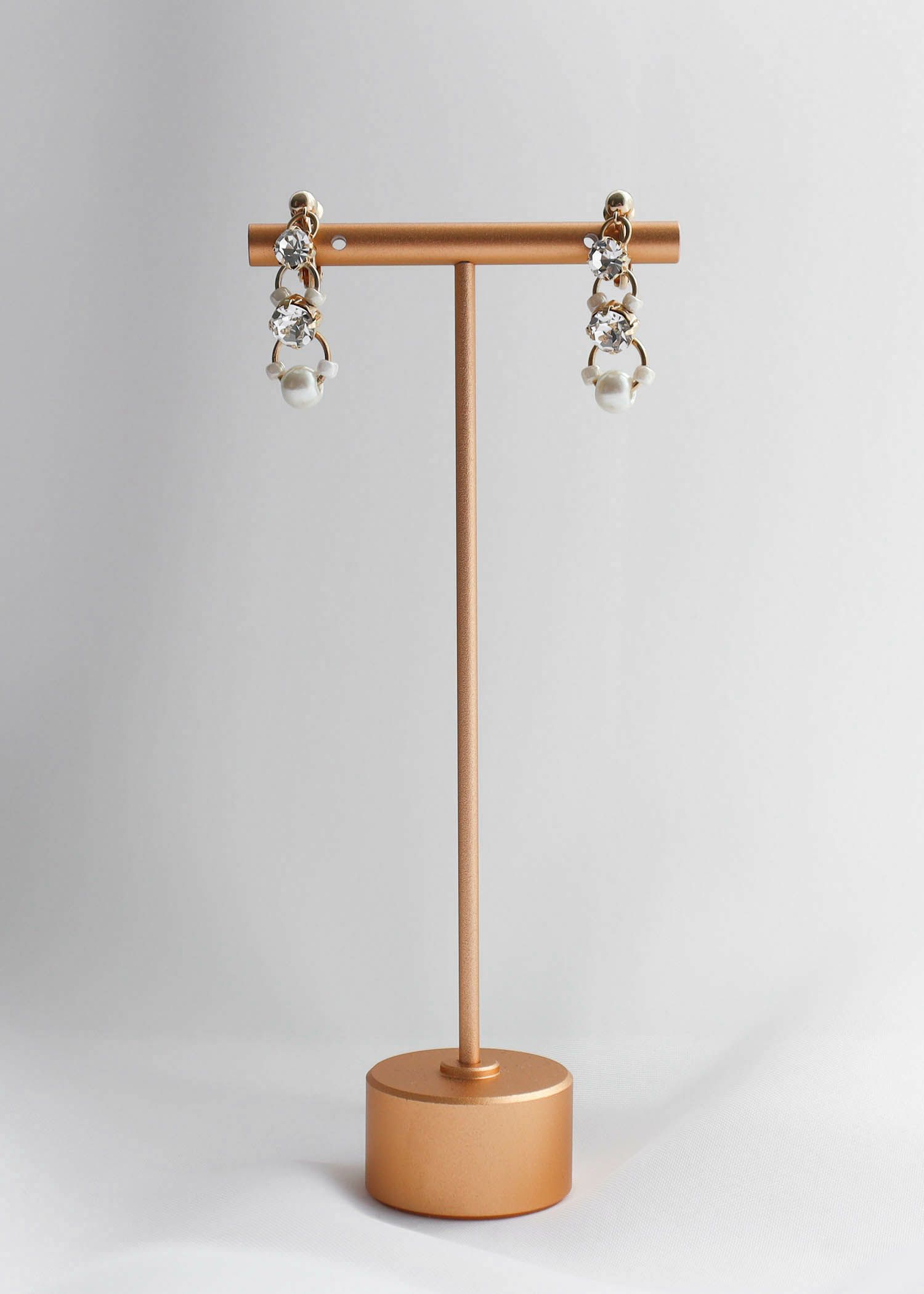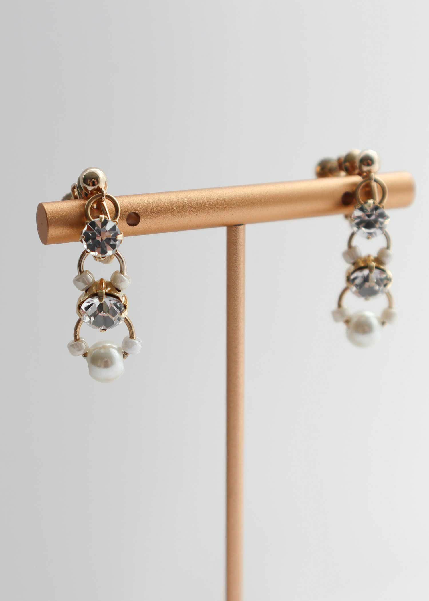 輝きのあるストーンとパールにミニリングを合わせた目を惹くイヤリング。