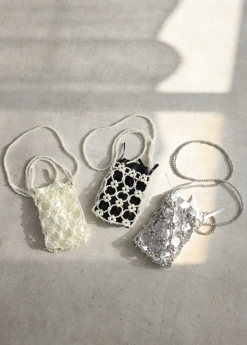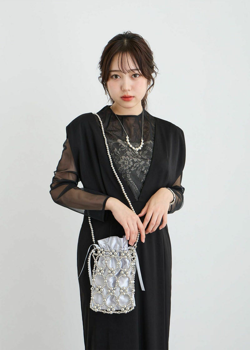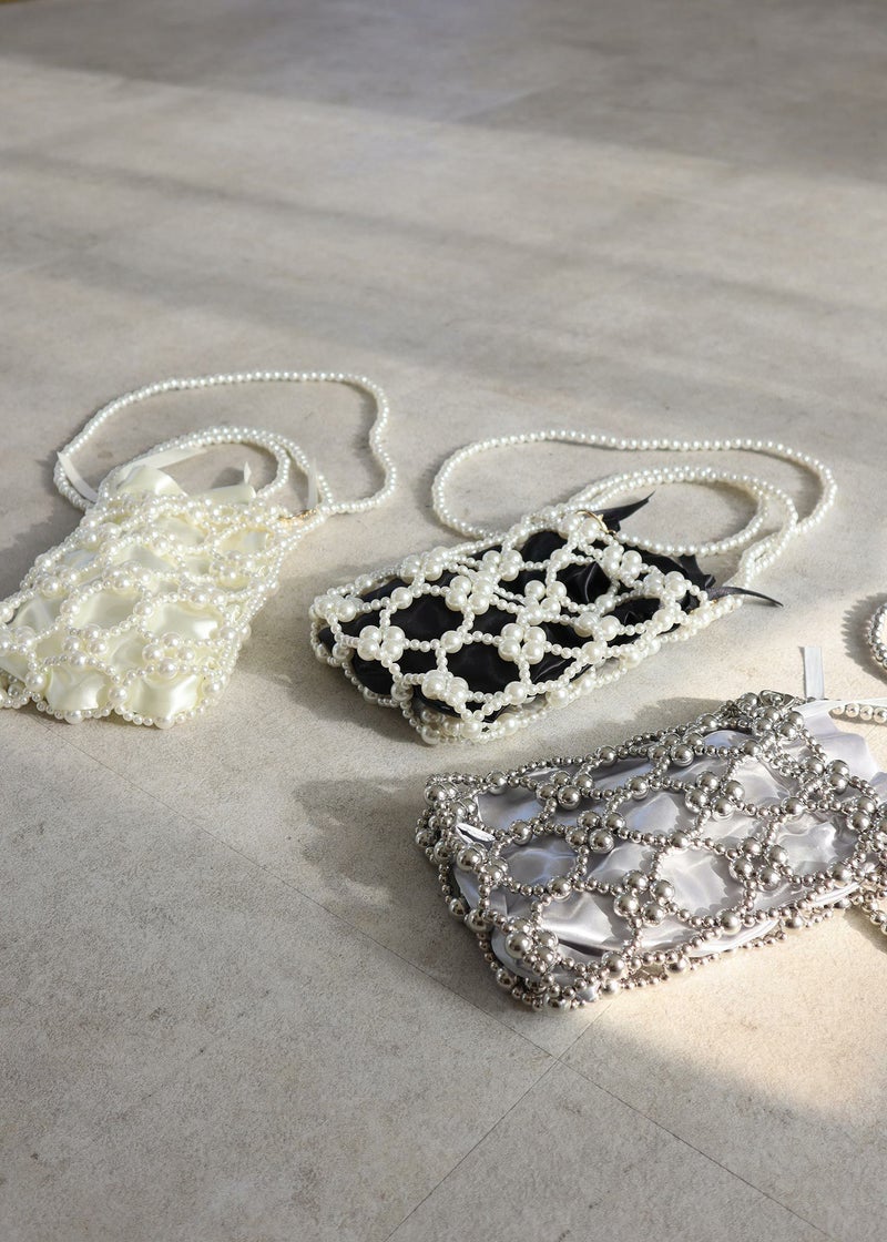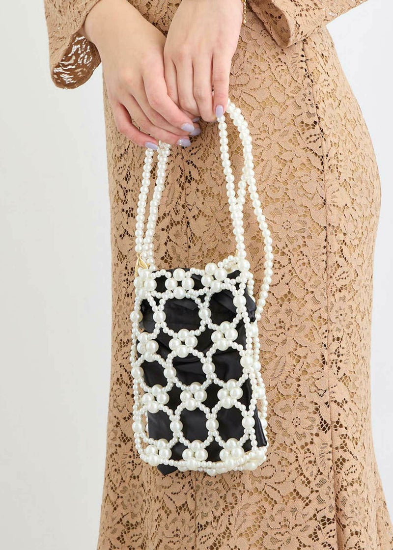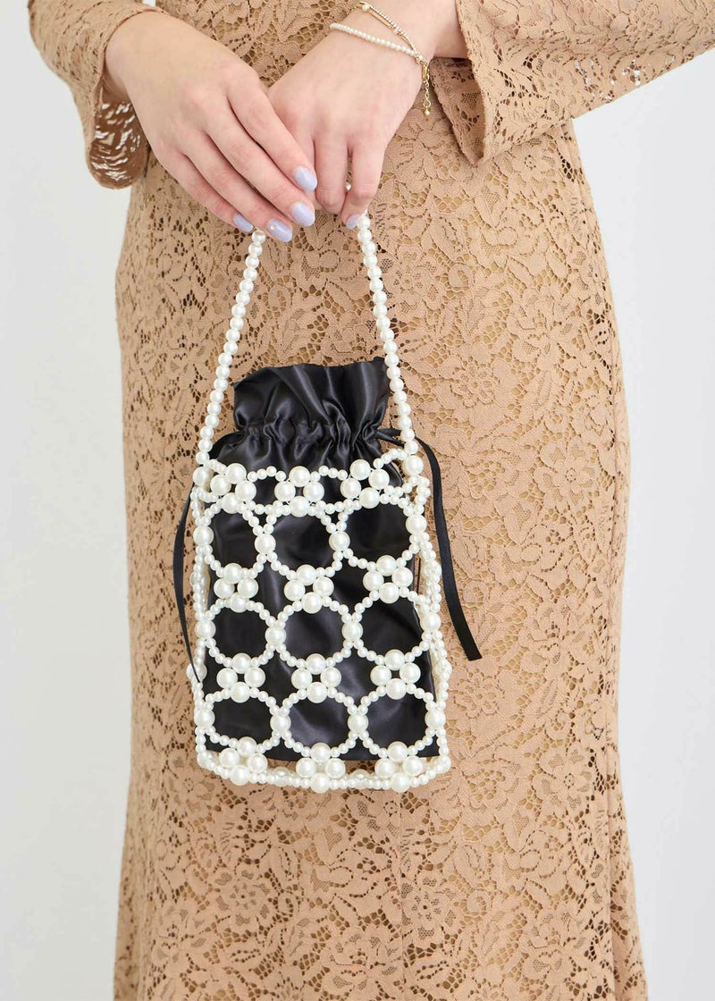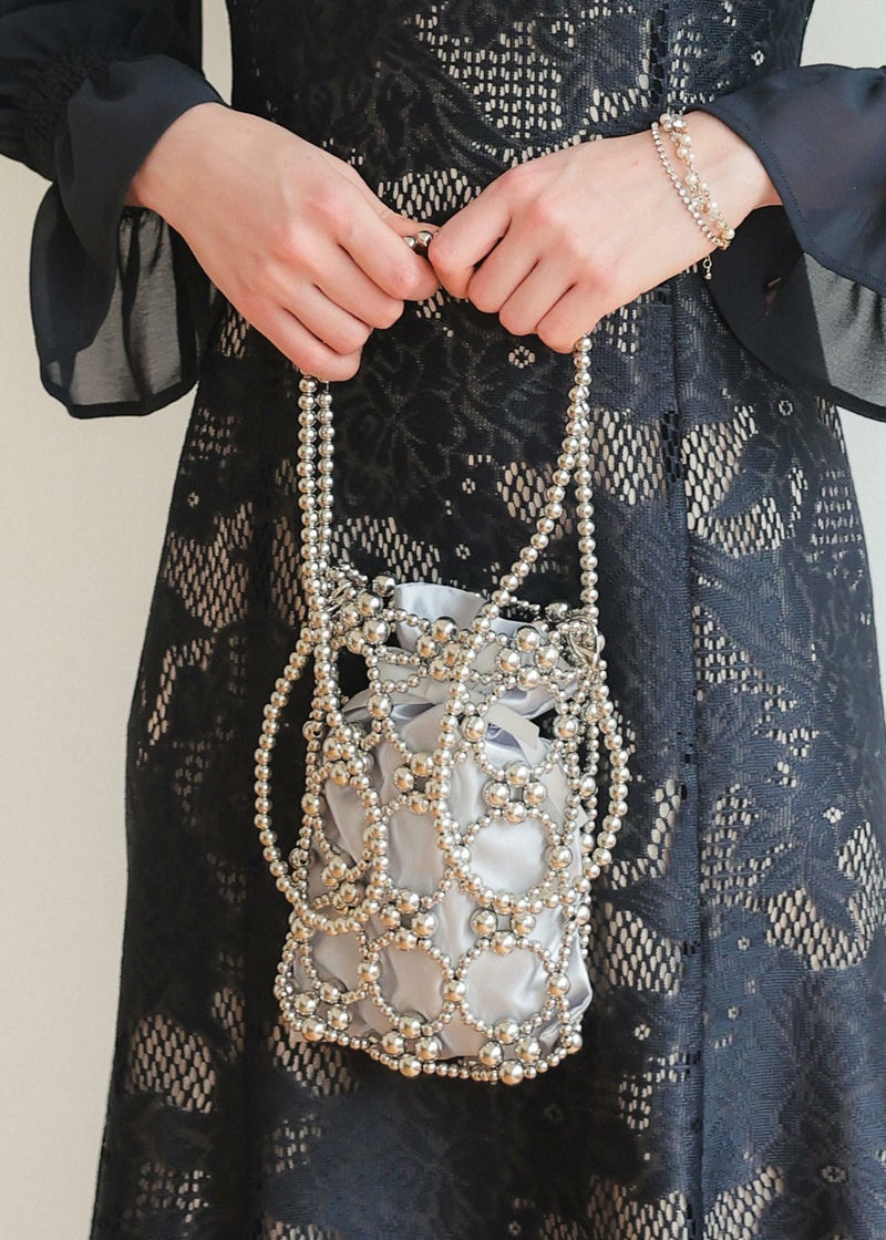 《結婚式・お呼ばれ対応・ハンドバッグ》 パールで編み曲げた華やかなバッグ アクセサリー感覚で持てる、印象的なアイテムです。 サテンの巾着が付いているので、荷物が透けて見えることなくをすっきりと収納できます。 ロングのショルダーチェーンは取り外し可能なので、コーデに合わせて持ち方を変えられます。 結婚式などの華やかなパーティーシーンにはもちろんの事、カジュアルなスタイルにアクセントとして合わせて頂くのもおすすめな1点です。 オケージョンシーンを華やかに彩るアイテムです。 ※商品画像は、光の当たり具合やパソコンなどの閲覧環境により、実際の色味と異なって見える場合がございます。予めご了承ください。