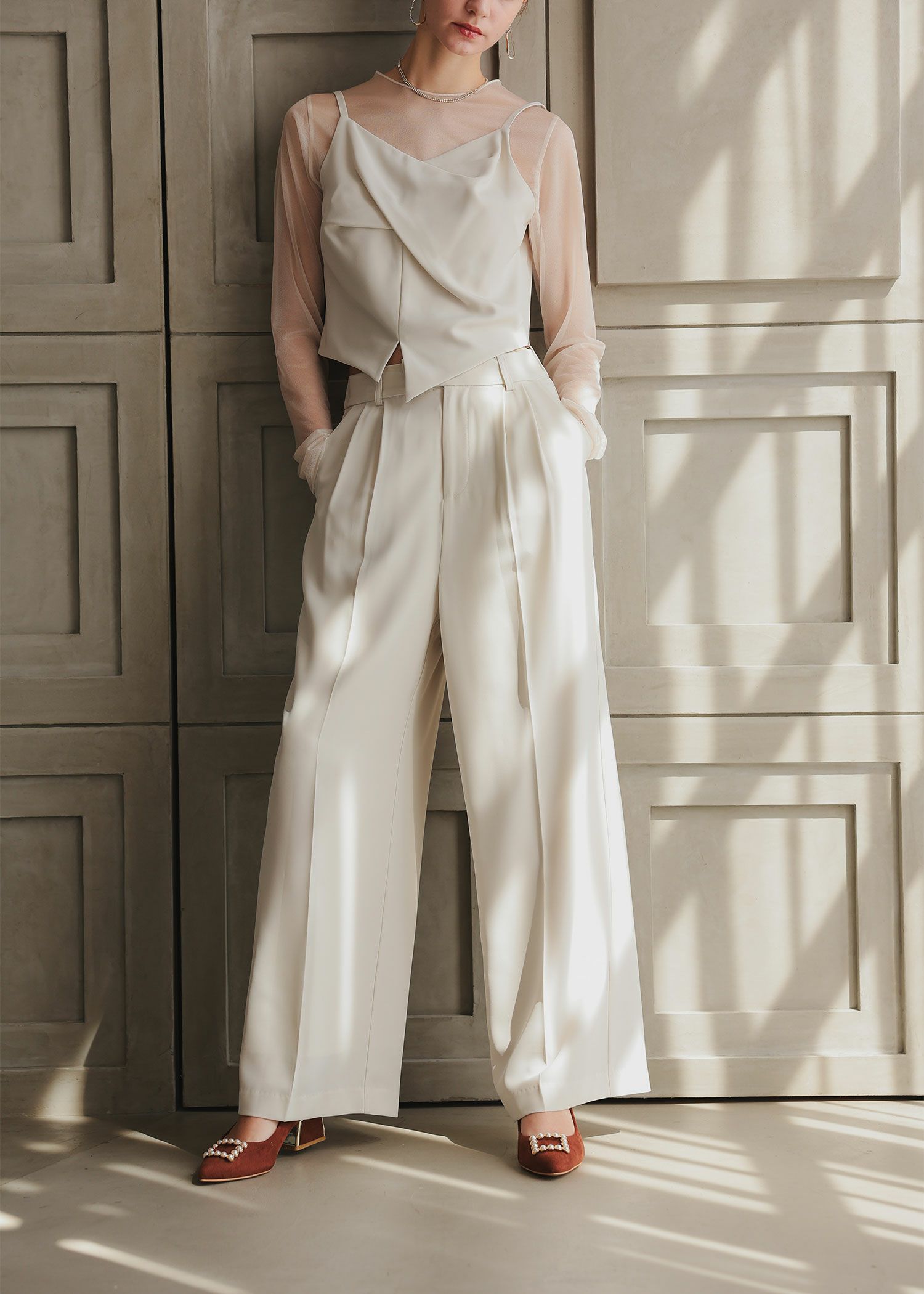 商品説明 ドレッシーにもデイリーにも幅広く対応してくれるワイドパンツ 素材は落ち感と程よいツヤ感のあるものを使用し、 オケージョンシーンにぴったりな女性らしいワイドパンツに仕上げました。 下半身の体形カバーもしつつ、足長効果も◎ サスペンダー付きなのもおしゃれなポイントです。 セットアップ対応のジャケット(商品番号:24331)をインしても コンビネゾンのような着こなしが出来て、モードなスタイリングに。 サスペンダーは長さ調節もでき、普通のパンツとして着用したい時は取り外しも可能です。 【Short】サイズの展開もある為、低身長の方にもおすすめです! 結婚式のおよばれにはもちろんの事、 オフィスシーンやディナー、お子様の行事、デイリー使いにも 幅広いシーンに活躍する事間違いなしです! 【セットアップ対応】 ・ダブルテーラードジャケット(24331) ・2WAYサスペンダーワイドパンツ(24332) ※エクリュは白っぽいお色味のため、結婚式のおよばれ以外のシーンにおすすめです。 ※ハンガー掛けの商品画像が実際の商品のお色味に近くなっております。 ※商品画像は、光の当たり具合やパソコンなどの閲覧環境により、 実際の色味と異なって見える場合がございます。予めご了承ください。 おすすめのシーン カジュアルな結婚式・二次会・お呼ばれ・成人式・同窓会・ 女子会・謝恩会 お食事会・普段使いなど多様なシーンのコーディネートに使えます。 商品詳細 【備考】 ・裏地なし ・伸縮性なし ・前中心ファスナー使用 ・後ろウエストゴム入り 洗濯方法:クリーニング店にご相談ください。 ※その他お取り扱いに関しましては、商品に付属のアテンションタグをご覧ください。 原産国:中国 model 174cm/Mlongサイズ staff 153㎝/ブラウン,エクリュ,ブラック/Mlongサイズ staff 153㎝/チャコール/Mshortサイズ staff 158㎝/ブラウン Mlongサイズ
