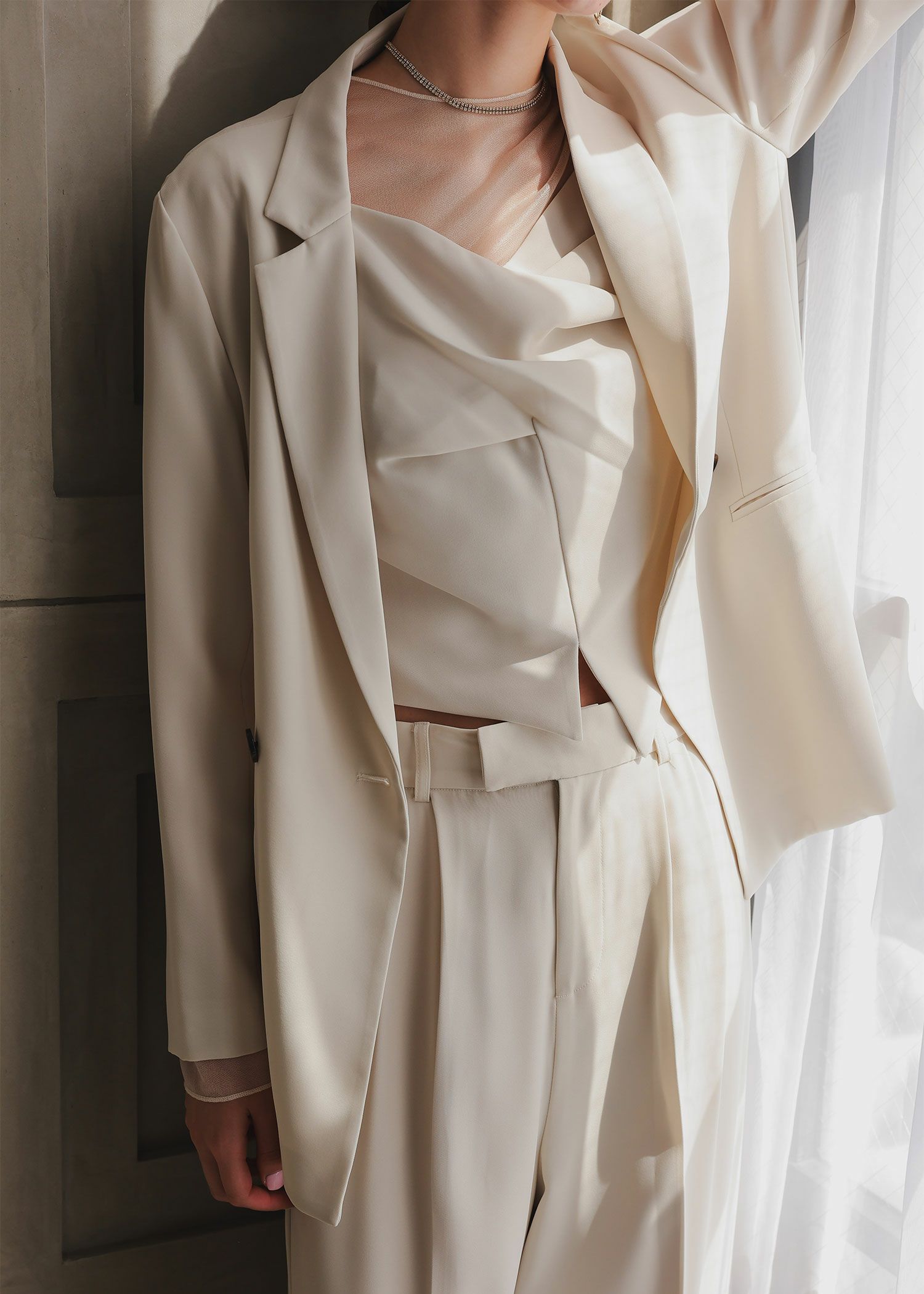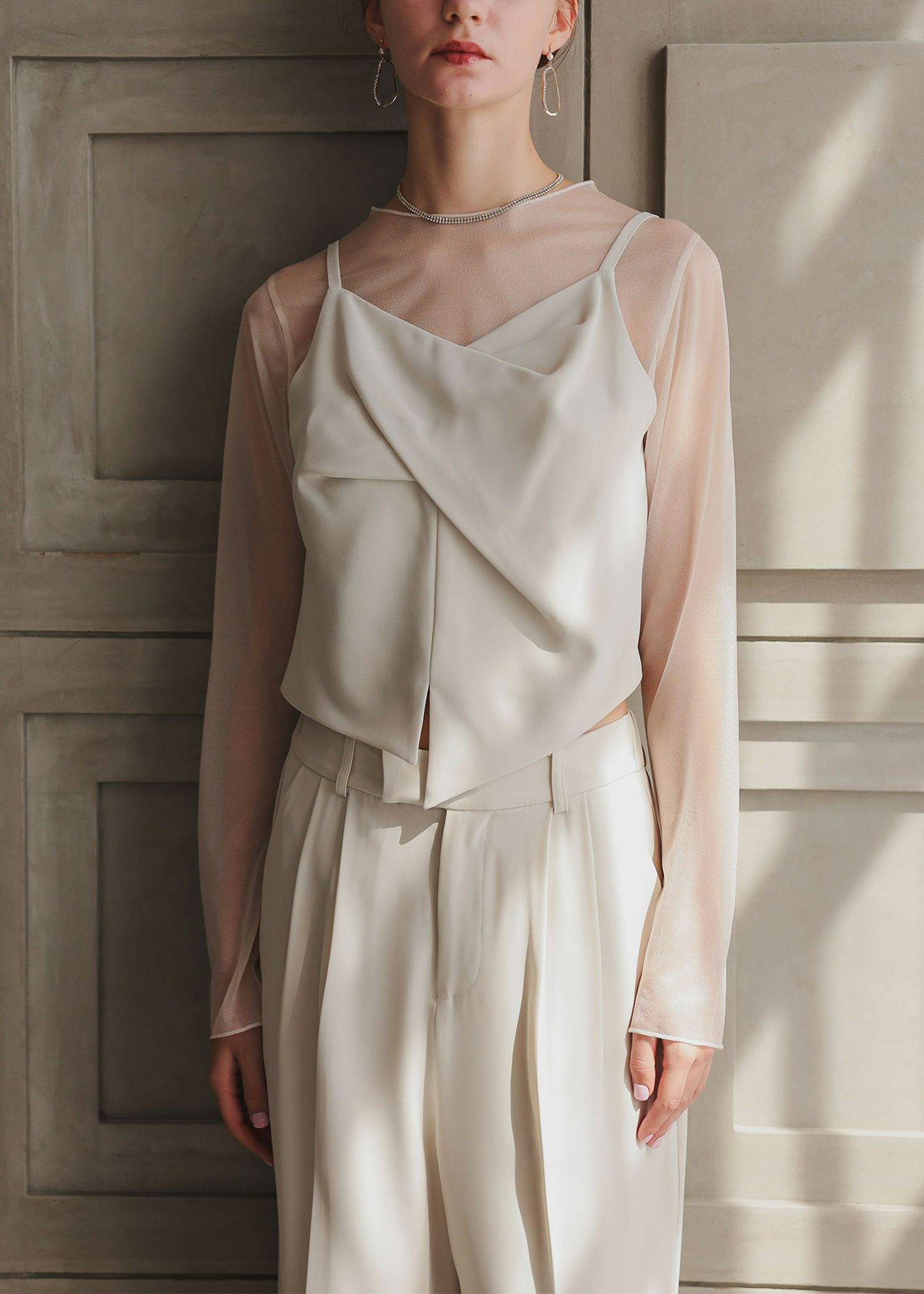 商品説明 1枚さらっと着るだけでコーデがまとまるビスチェデザインのトップス シアー部分はグロッシーなラメ感があり ラグジュアリーな質感。 ビスチェは胸元にツイストをあしらい、目を惹くポイントに。 裾部分はイレギュラーなラインで、モード感あふれる他には無いデザインです。 シアー部分とビスチェはドッキングされているので、 1枚でさらっと着るだけで、レイヤード風のスタイルが完成します。 ショート丈でスタイルアップ効果も◎ 低身長の方でもバランスよく着こなしていただける丈感です。 バックスタイルはクルミボタンを飾り、後ろ姿までおしゃれなトップスです。 ファスナーが、後ろ中心、脇の2か所に付いているので 着脱もらくらく。 【セットアップ対応】 ・ダブルテーラードジャケット(24331) ・2WAYサスペンダーワイドパンツ(24332) ※エクリュは白っぽいお色味のため、結婚式のおよばれ以外のシーンにおすすめです。 ※ハンガー掛けの商品画像が実際の商品のお色味に近くなっております。 ※商品画像は、光の当たり具合やパソコンなどの閲覧環境により、 実際の色味と異なって見える場合がございます。予めご了承ください。 モデル着用サイズ 174cm/Mサイズ おすすめのシーン カジュアルな結婚式・二次会・お呼ばれ・成人式・同窓会・ 女子会・謝恩会 お食事会・普段使いなど多様なシーンのコーディネートに使えます。 商品詳細 【備考】 ・伸縮性なし ・裏地付き ・ファスナー付き(背中心・脇部分 計2か所) 洗濯方法:クリーニング店にご相談ください。 ※その他お取り扱いに関しましては、商品に付属のアテンションタグをご覧ください。 原産国:中国 お問い合わせ品番:25172 着用モデル身長--cm