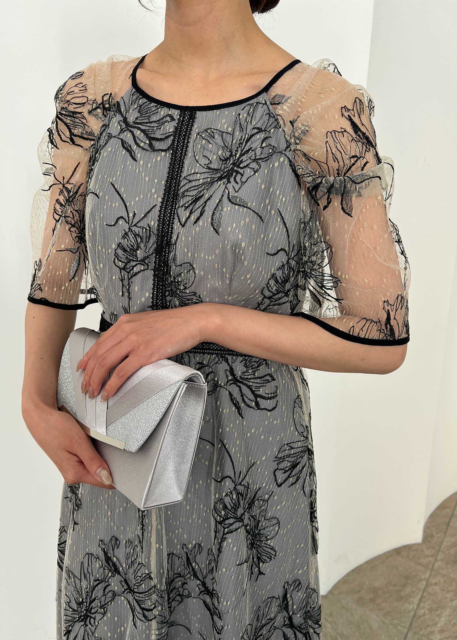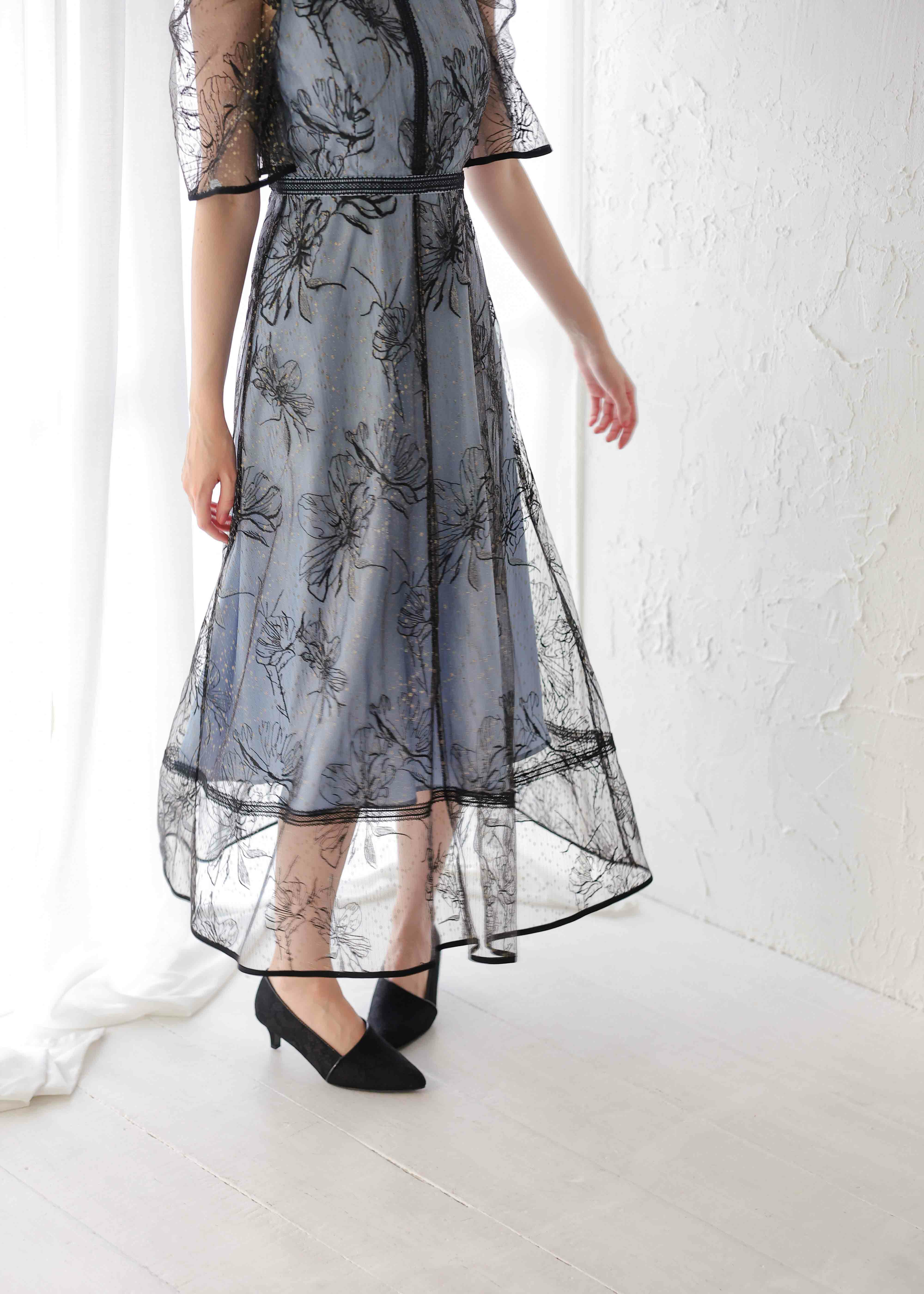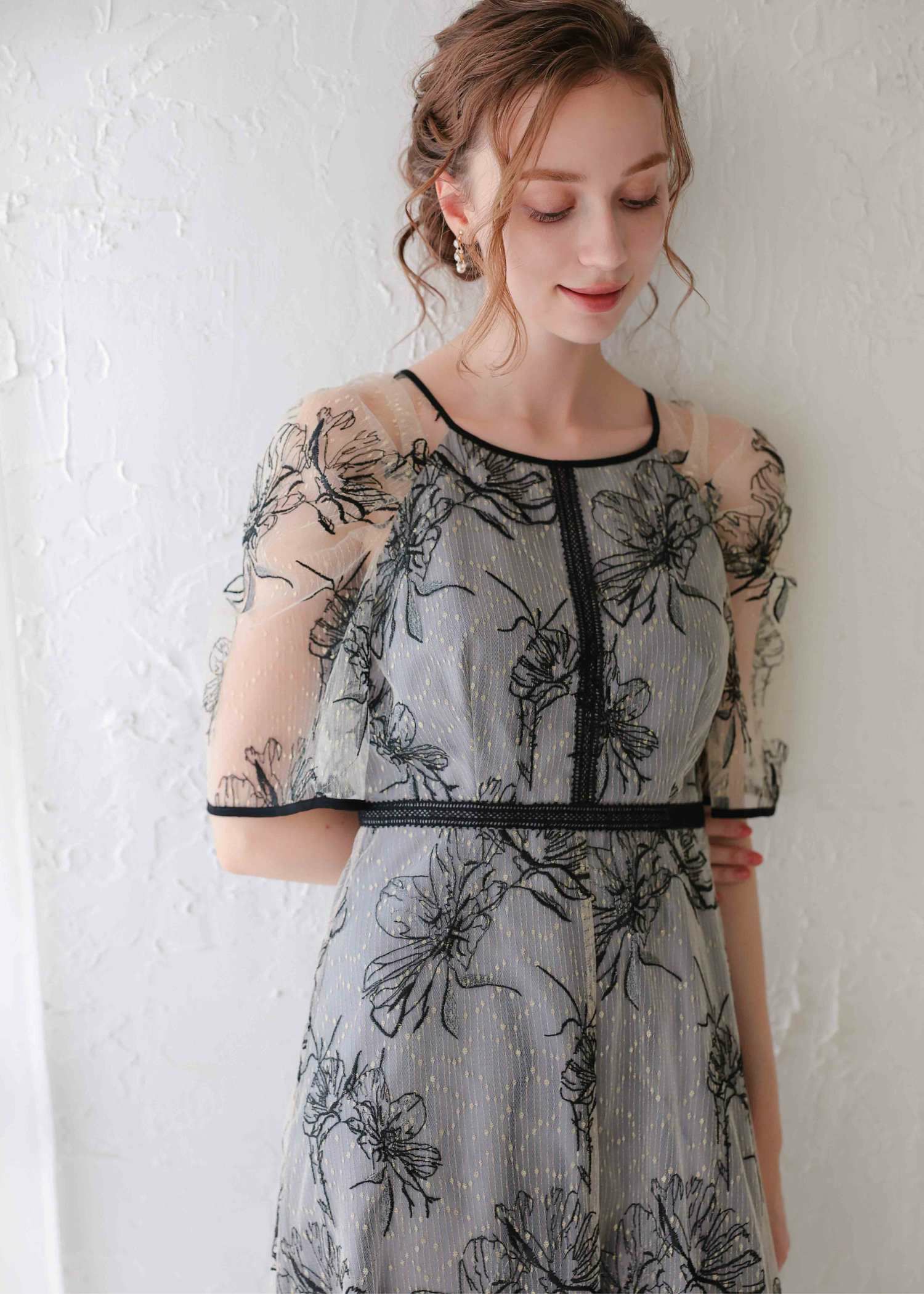全体に施された繊細な線画フラワー刺繍がアクセントとなり