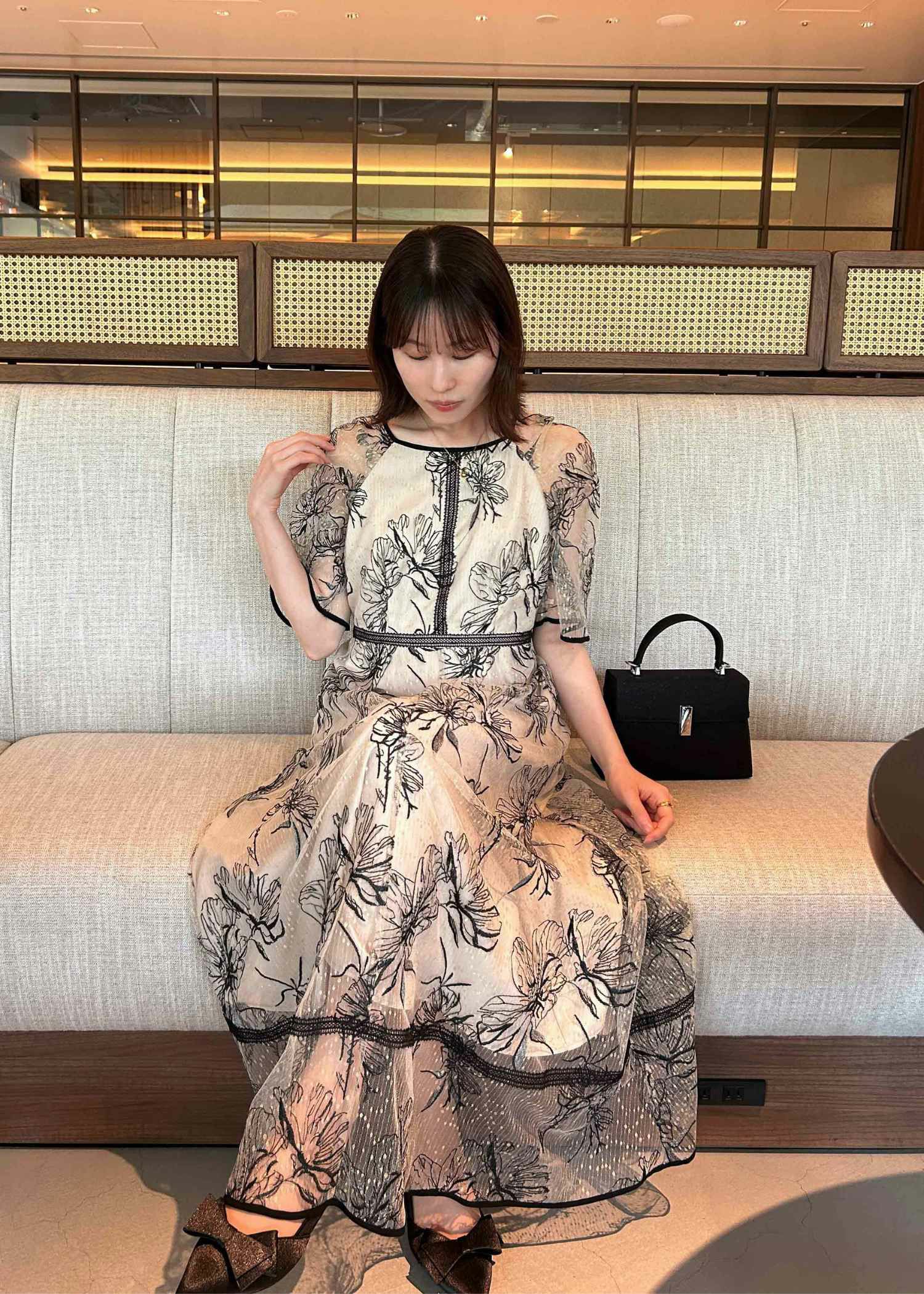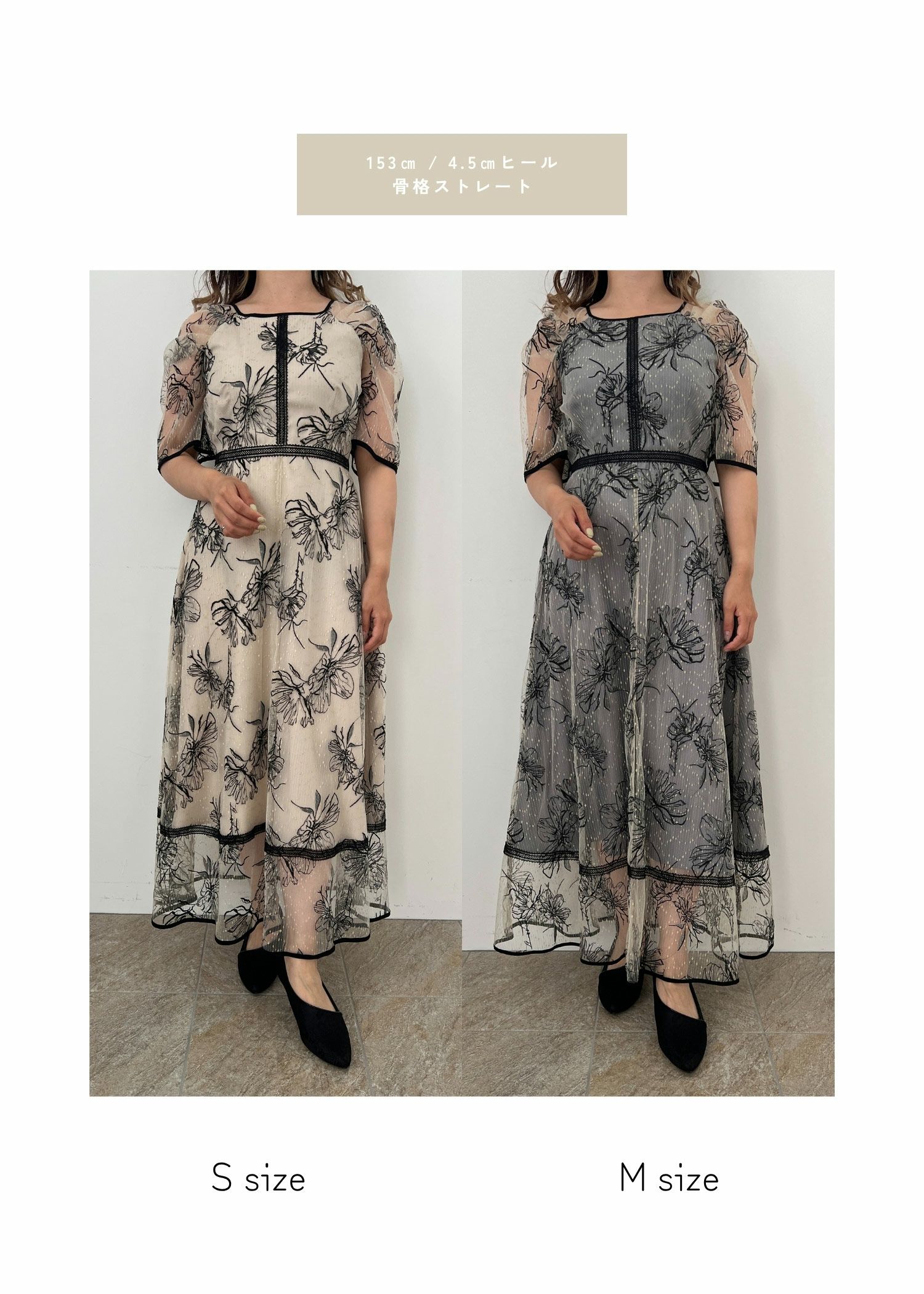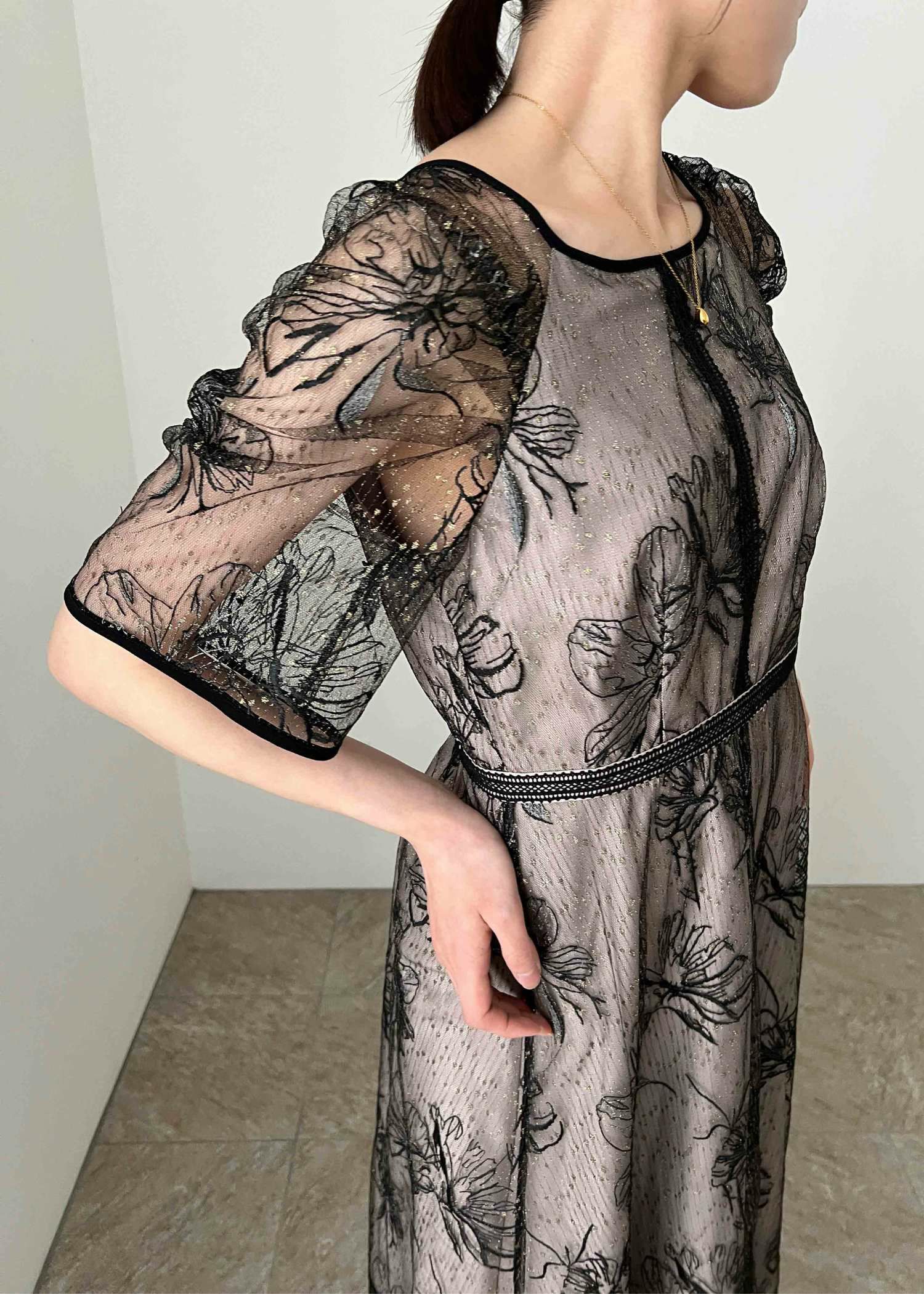 全体に施された繊細な線画フラワー刺繍がアクセントとなり