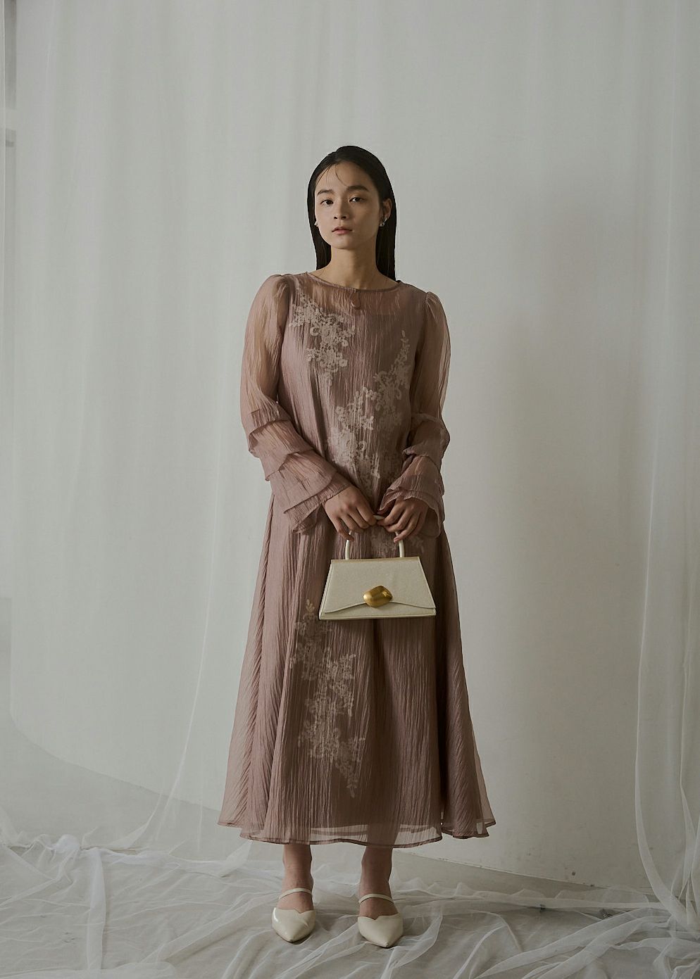 モチーフレースをあしらったシアーワンピース。