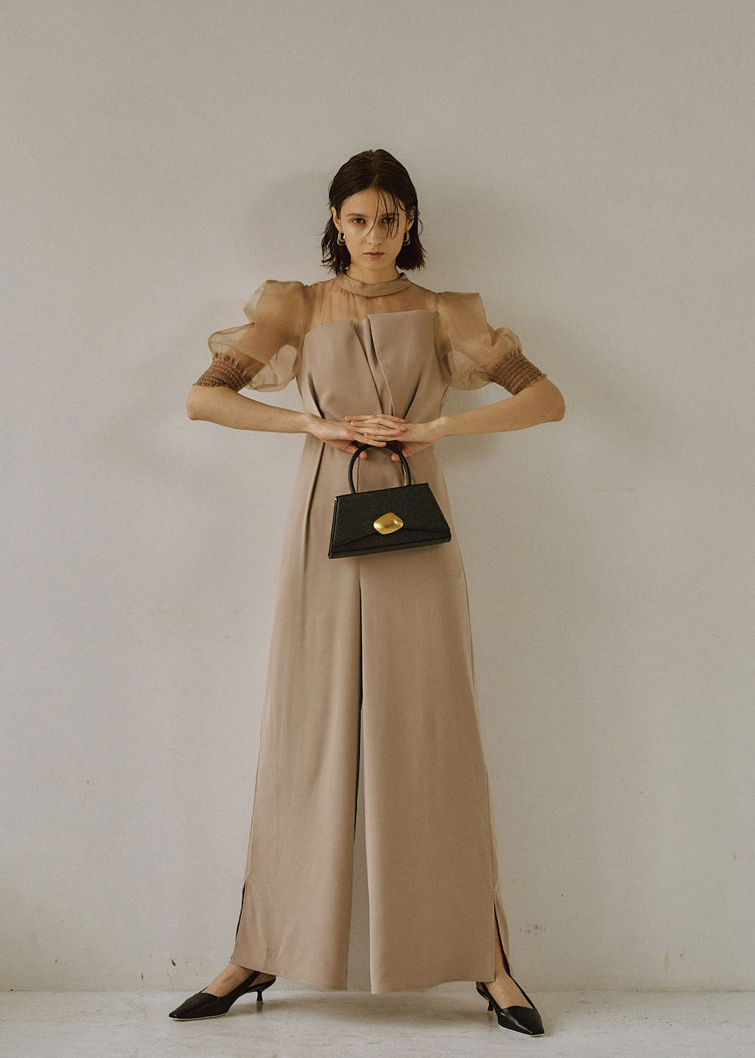 商品説明 フロントのイレギュラーカットデザインが 都会的モードなコンビネゾン。 他にない一癖あるボックススリーブのデザインは、 オーガンジー素材を使用しているので 強くなりすぎず、こなれた雰囲気で着ていただけます。 デコルテのシアー感と、ハイウエスト位置の切り替えが レディな印象とスタイルアップ効果を与えてくれます。 ボトム部分はゆったりとしたワイドシルエットで サイドにはスリットを。 抜け感を出しつつ、軽やかで ブラッシュアップされた、着心地の良い一着に仕上げました。 ※商品画像は、光の当たり具合や端末等の閲覧環境によって、 実際の色味と異なって見える場合がございます。予めご了承ください。 ※画像の商品はサンプルの為、実際の商品とサイズ感が異なっています。 予めご了承ください。 おすすめのシーン 結婚式・二次会・披露宴・成人式・同窓会・ 2次会謝恩会・パーティー・デート・演奏会・お食事会など多様なシーンのコーディネートに使えます。 商品詳細 【備考】 ・裏地あり ・デコルテ・お袖 部分透け感あり ・ウエストゴム仕様 ・バックファスナー仕様 ・ポケット付き 洗濯方法:クリーニング店にご相談ください。 ※その他お取り扱いに関しましては、商品に付属のアテンションタグをご覧ください。 原産国:MADE IN CHINA お問い合わせ品番:9424 着用モデル身長175cm 着丈バストウエストヒップ肩幅袖丈 short:127.5887210232.535.5 Middle:132.5907210232.536.5 M:137.5907210232.537.5 単位(cm) 商品画像後方の身長別SNAPをご確認くださいませ。 【身長別 オススメサイズ】 ・shortサイズ 140cm台(7cmヒール)~153cm以下の低身長の方 ・Middleサイズ 身長153cm~159cm以下 4cm前後のローヒールでロング丈でのご着用ご希望の方 ・Mサイズ 160cm以上の高身長の方、または158cm前後5~7cmヒール着用で ロング丈ご希望の方 着用モデル身長175cm/Model size着用 お問い合わせ品番:9424 REVIEW レビュー
