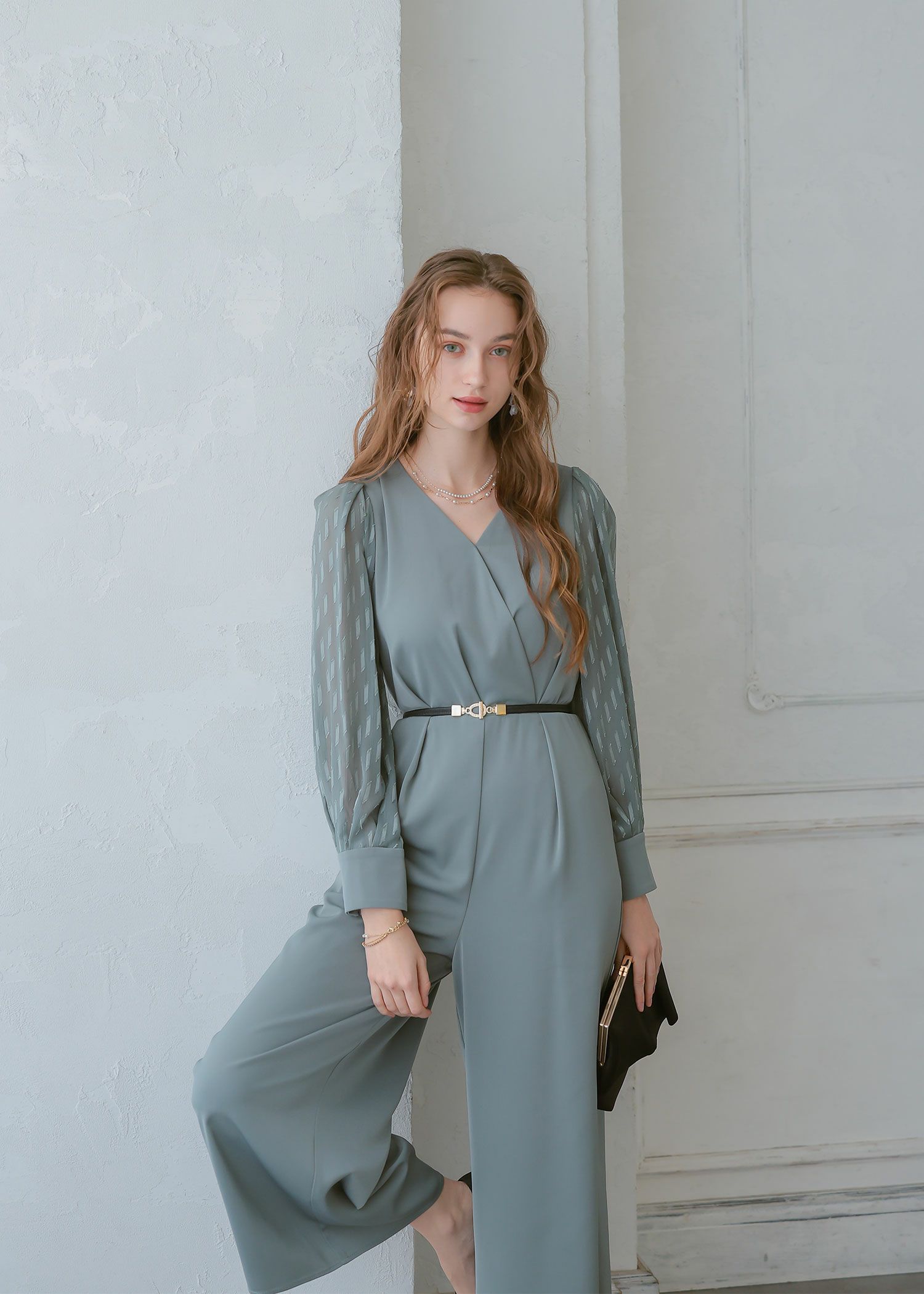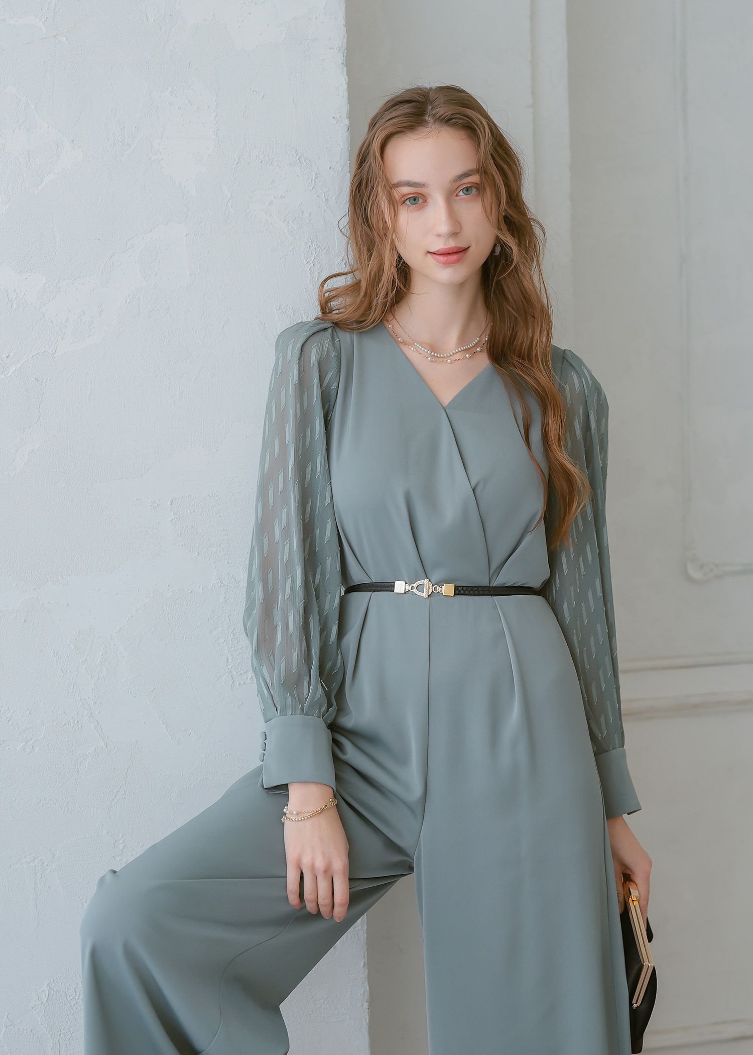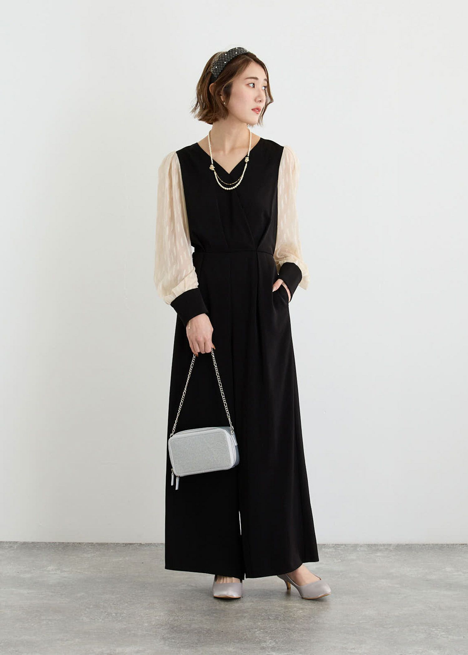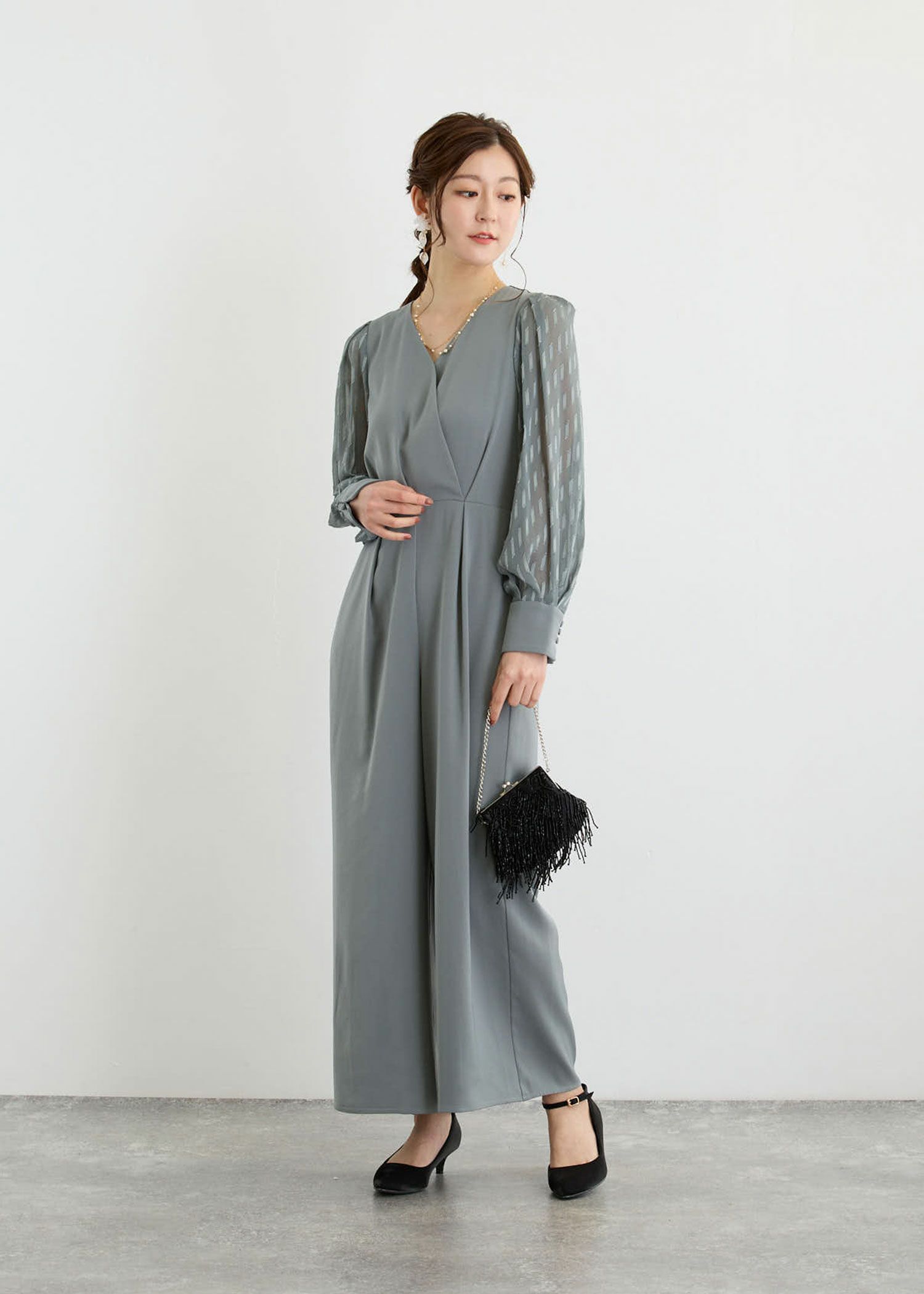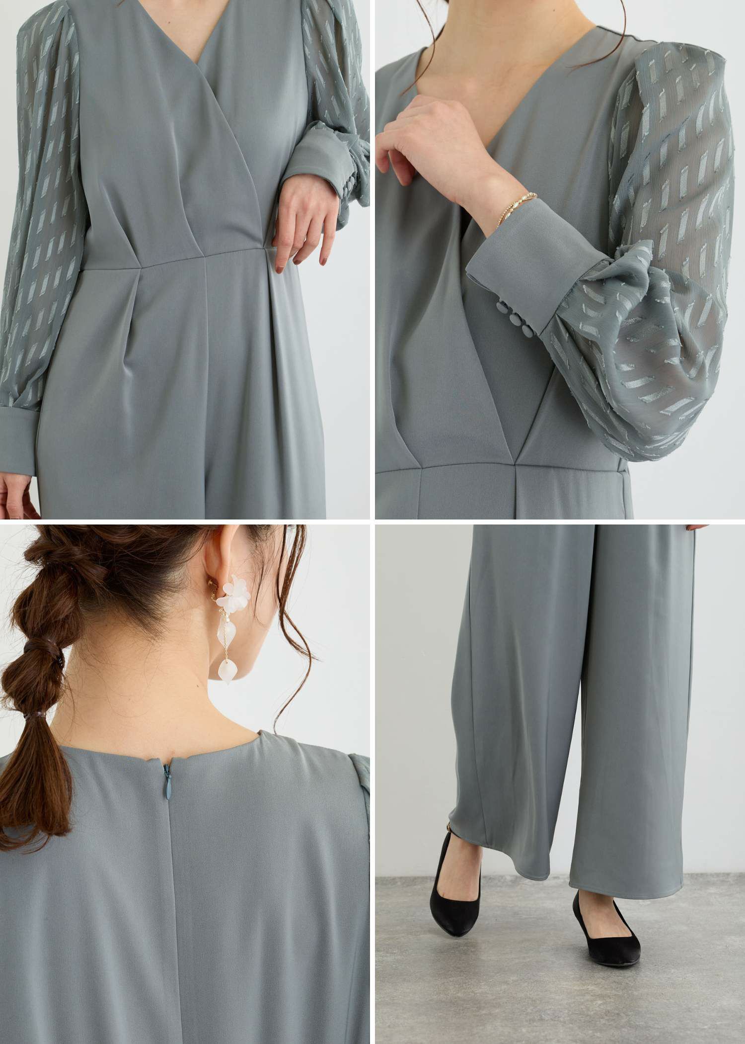 商品説明 女性らしさとクールな雰囲気の両方を兼ね備えたパンツドレス カシュクールデザインや程よいデコルテあきで上半身をすっきりと見せつつ、 女性らしさも漂うデザイン 袖部分には透け感のある素材を使用し、程よいゆとりを持たせるシルエットに仕上げました。 ここでも女性らしさをプラスし、二の腕も華奢みせしてくれるのも嬉しいポイント。 袖口は長めのカフスでキュッと引き締め、端正で洗練された印象に。 パンツのシルエットは程よい筒の太さで、きれいめに仕上げました。 身体のラインを拾わないのも嬉しいポイント 素材は、微光沢の中肉厚サテンで高級感を感じさせます。 ※商品画像は、光の当たり具合やパソコンなどの閲覧環境により、 実際の色味と異なって見える場合がございます。予めご了承ください。 外国人モデル着用サイズ 172cm/Mサイズ 日本人モデル着用サイズ 166cm/165㎝ Mサイズ(ミントグリーン) 日本人モデル着用サイズ 166cm/158㎝ Mサイズ(ブラック×ベージュ) 日本人モデル着用サイズ 160㎝ Mサイズ(チャコール) 日本人モデル着用サイズ 158㎝ Mサイズ(ブラック) おすすめのシーン 結婚式・披露宴・二次会・同窓会・謝恩会など 多様なシーンのコーディネートに使えます。 商品詳細 【備考】 ・裏地あり ・袖部分透け感あり ・伸縮性なし ・後ろウエストゴム入り ・後ろ中心ファスナー 洗濯方法:クリーニング店にご相談ください。 ※その他お取り扱いに関しましては、商品に付属のアテンションタグをご覧ください。 原産国:中国 お問い合わせ品番:24915 着用モデル身長170cm
