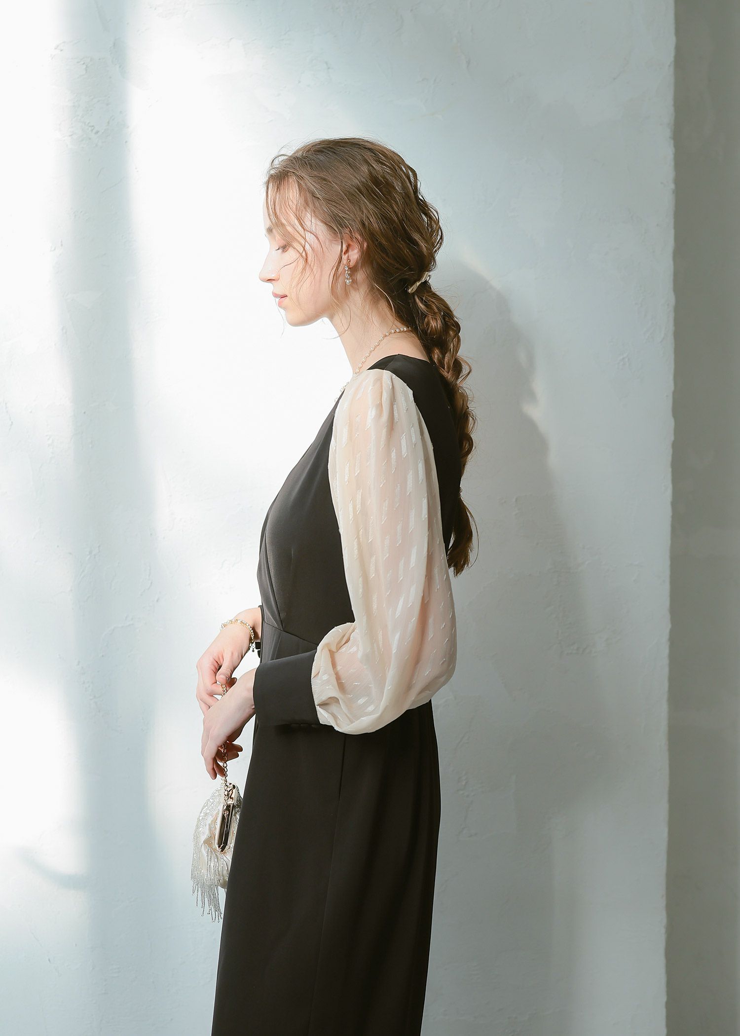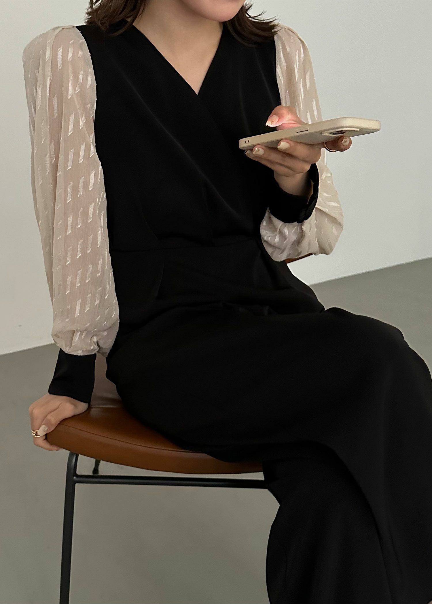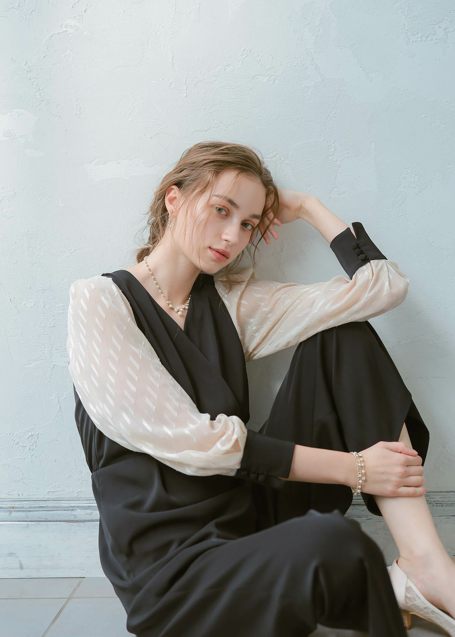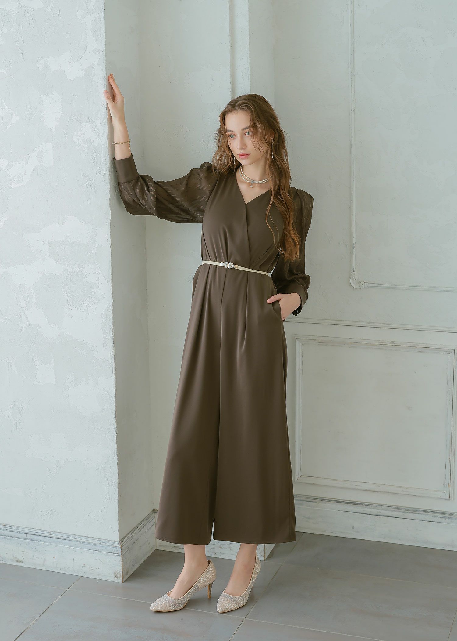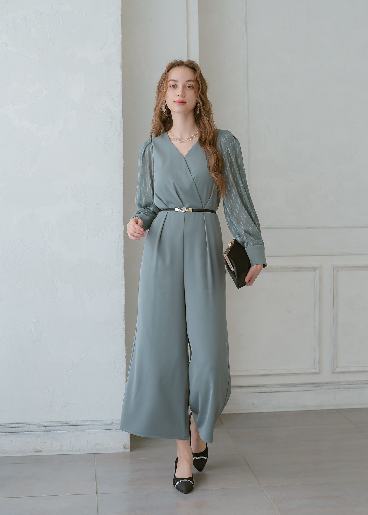 商品説明 女性らしさとクールな雰囲気の両方を兼ね備えたパンツドレス カシュクールデザインや程よいデコルテあきで上半身をすっきりと見せつつ、 女性らしさも漂うデザイン 袖部分には透け感のある素材を使用し、程よいゆとりを持たせるシルエットに仕上げました。 ここでも女性らしさをプラスし、二の腕も華奢みせしてくれるのも嬉しいポイント。 袖口は長めのカフスでキュッと引き締め、端正で洗練された印象に。 パンツのシルエットは程よい筒の太さで、きれいめに仕上げました。 身体のラインを拾わないのも嬉しいポイント 素材は、微光沢の中肉厚サテンで高級感を感じさせます。 ※商品画像は、光の当たり具合やパソコンなどの閲覧環境により、 実際の色味と異なって見える場合がございます。予めご了承ください。 外国人モデル着用サイズ 172cm/Mサイズ 日本人モデル着用サイズ 166cm/165㎝ Mサイズ(ミントグリーン) 日本人モデル着用サイズ 166cm/158㎝ Mサイズ(ブラック×ベージュ) 日本人モデル着用サイズ 160㎝ Mサイズ(チャコール) 日本人モデル着用サイズ 158㎝ Mサイズ(ブラック) おすすめのシーン 結婚式・披露宴・二次会・同窓会・謝恩会など 多様なシーンのコーディネートに使えます。 商品詳細 【備考】 ・裏地あり ・袖部分透け感あり ・伸縮性なし ・後ろウエストゴム入り ・後ろ中心ファスナー 洗濯方法:クリーニング店にご相談ください。 ※その他お取り扱いに関しましては、商品に付属のアテンションタグをご覧ください。 原産国:中国 お問い合わせ品番:24915 着用モデル身長170cm
