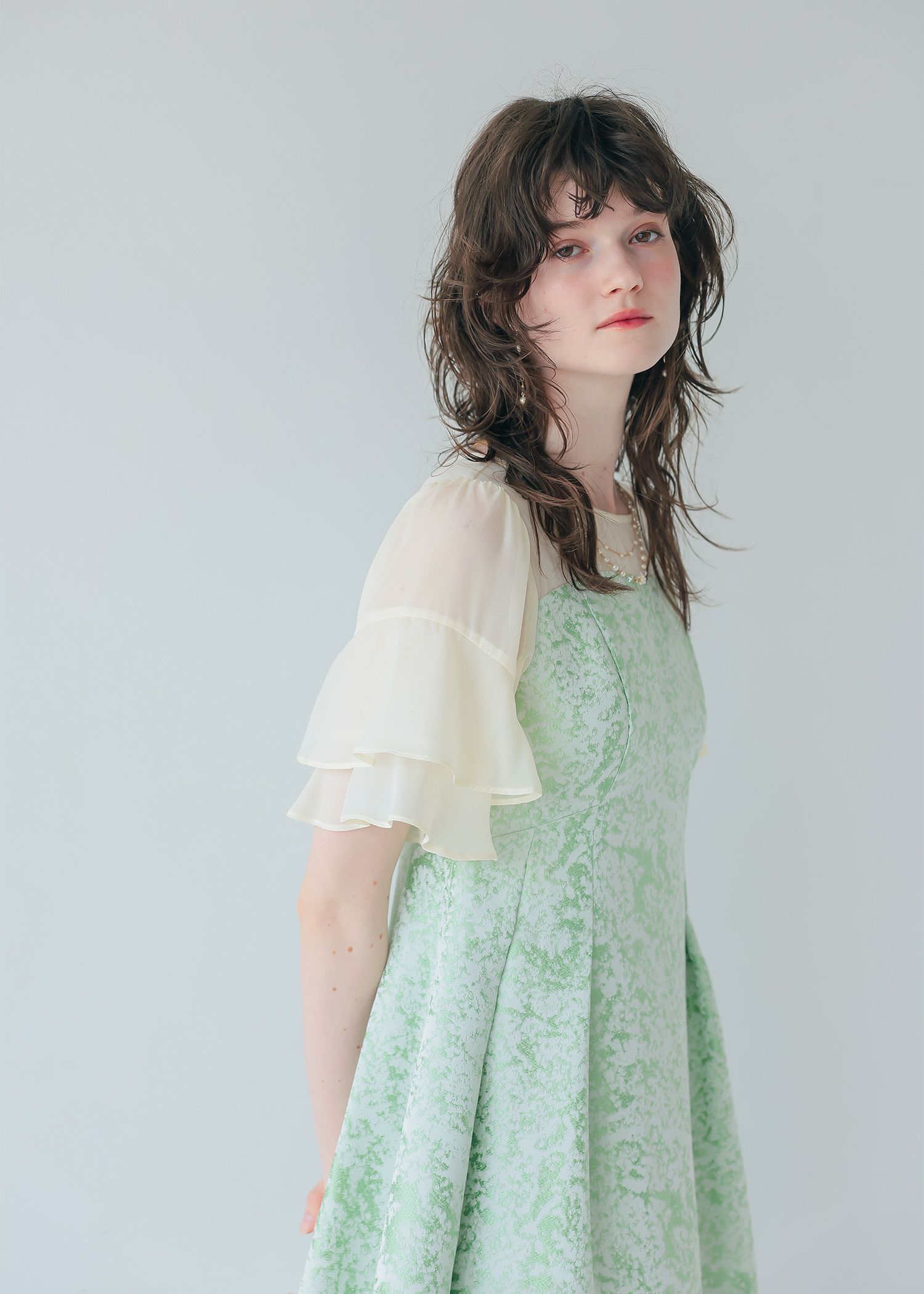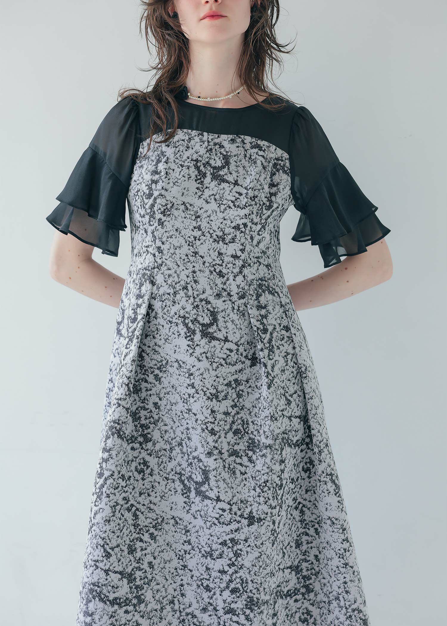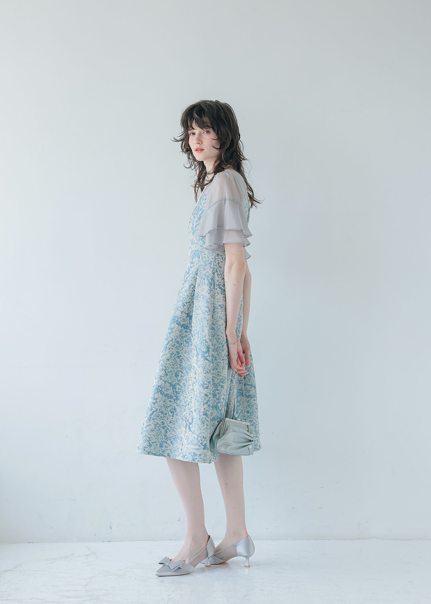 商品説明 モードライクな雰囲気のジャガード生地が目を引くオケージョンドレス。 デコルテと袖部分はシアー素材を使用し抜け感をプラス。 ラッフルスリーブがアクセントになり、肩周りをカバーしつつ 華奢見せさせてくれます。 程よい肌見せと袖のラッフルスリーブで女性らしく。 上半身映えするポイントをぎゅっと詰め込んだ一着。 フィット&フレアのシルエットでメリハリのあるスタイルに仕上がります。 少し短めの着丈なので、低身長の方にもおすすめです。 オケージョンシーンだけでなく、デイリーにも使いやすい大人のドレス。 結婚式や披露宴、二次会、ディナー、パーティー、お出かけなど幅広いシーンで大活躍してくれる一着です。 ※商品画像は、光の当たり具合やパソコンなどの閲覧環境により、 実際の色味と異なって見える場合がございます。予めご了承ください。 おすすめのシーン 結婚式・披露宴・二次会・同窓会・謝恩会など 多様なシーンのコーディネートに使えます。 商品詳細 【備考】 ・裏地あり ・伸縮性なし ・デコルテに透け感あり ・バックファスナー仕様 洗濯方法:クリーニング店にご相談ください。 ※その他お取り扱いに関しましては、商品に付属のアテンションタグをご覧ください。 原産国:中国