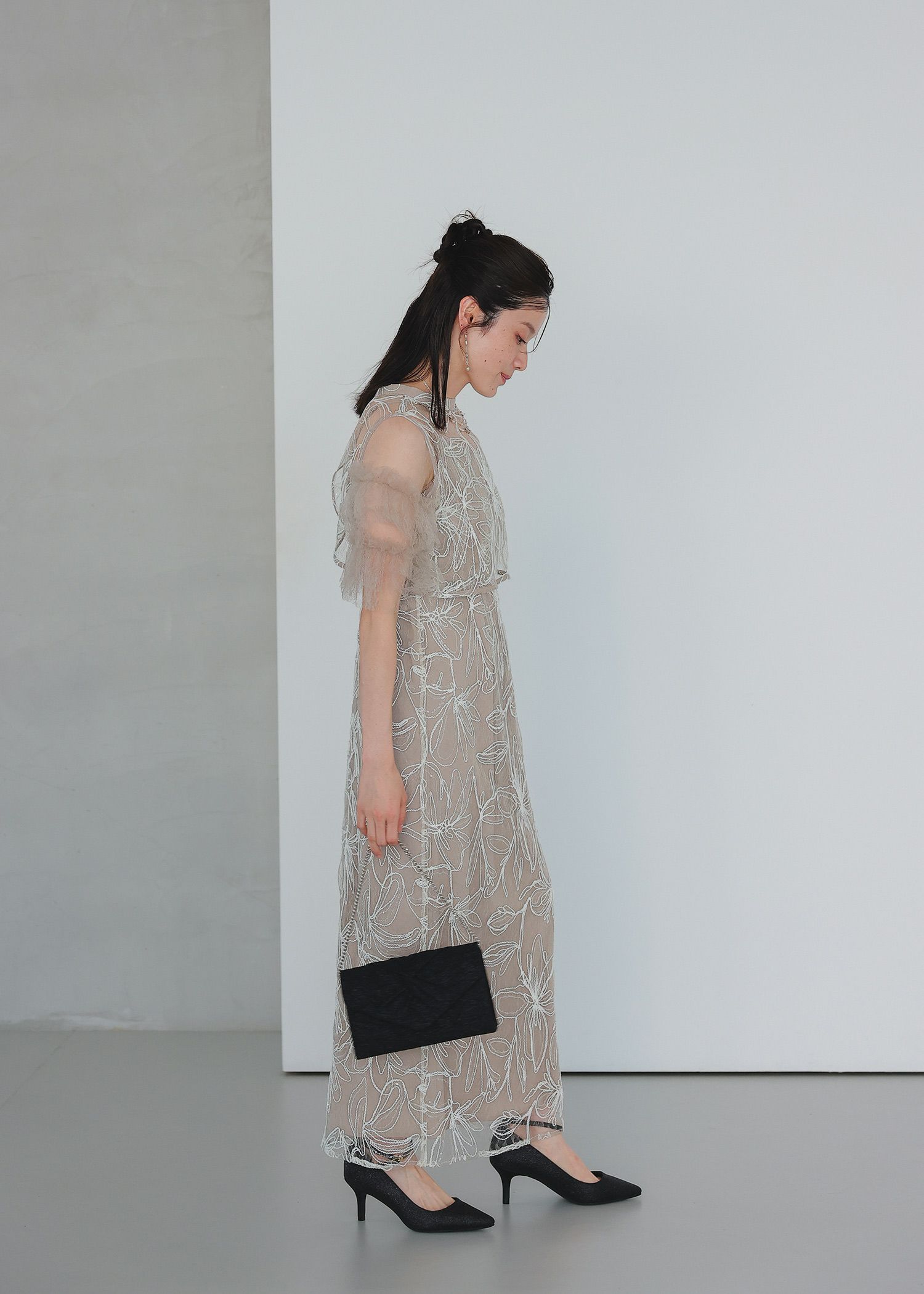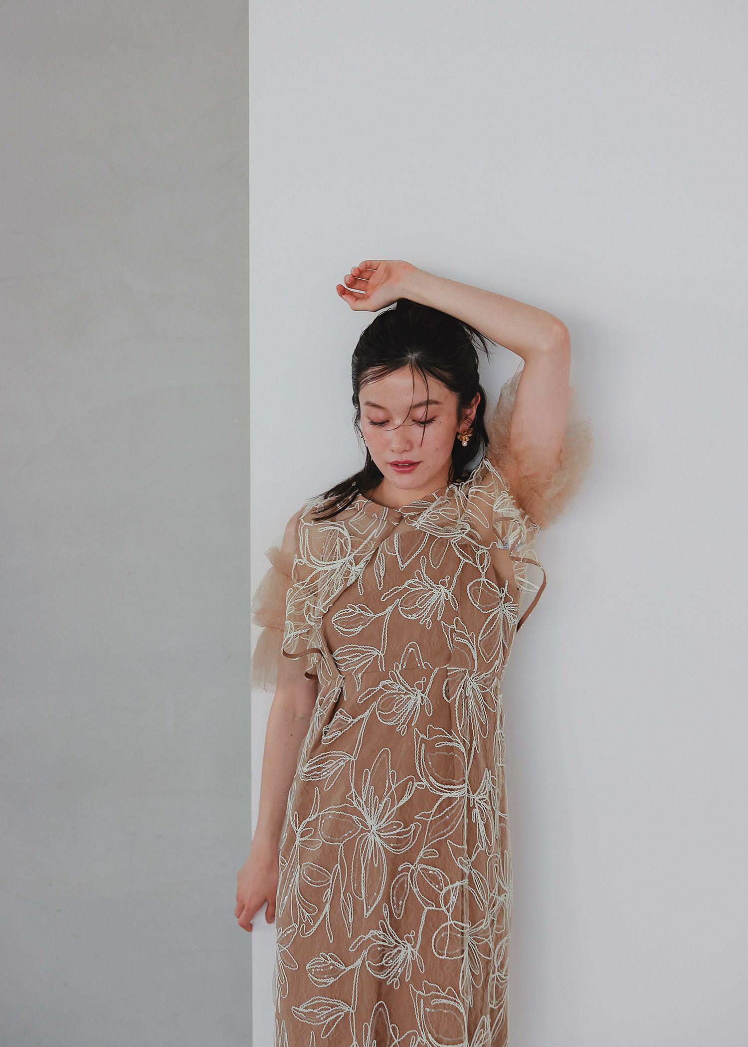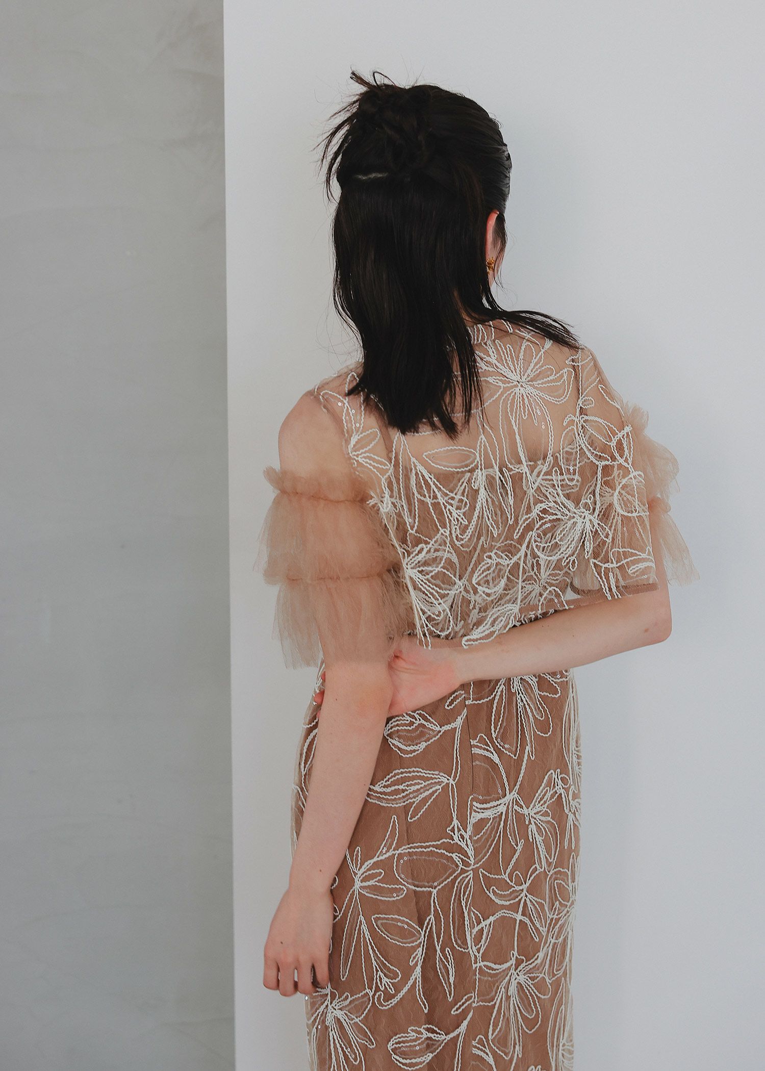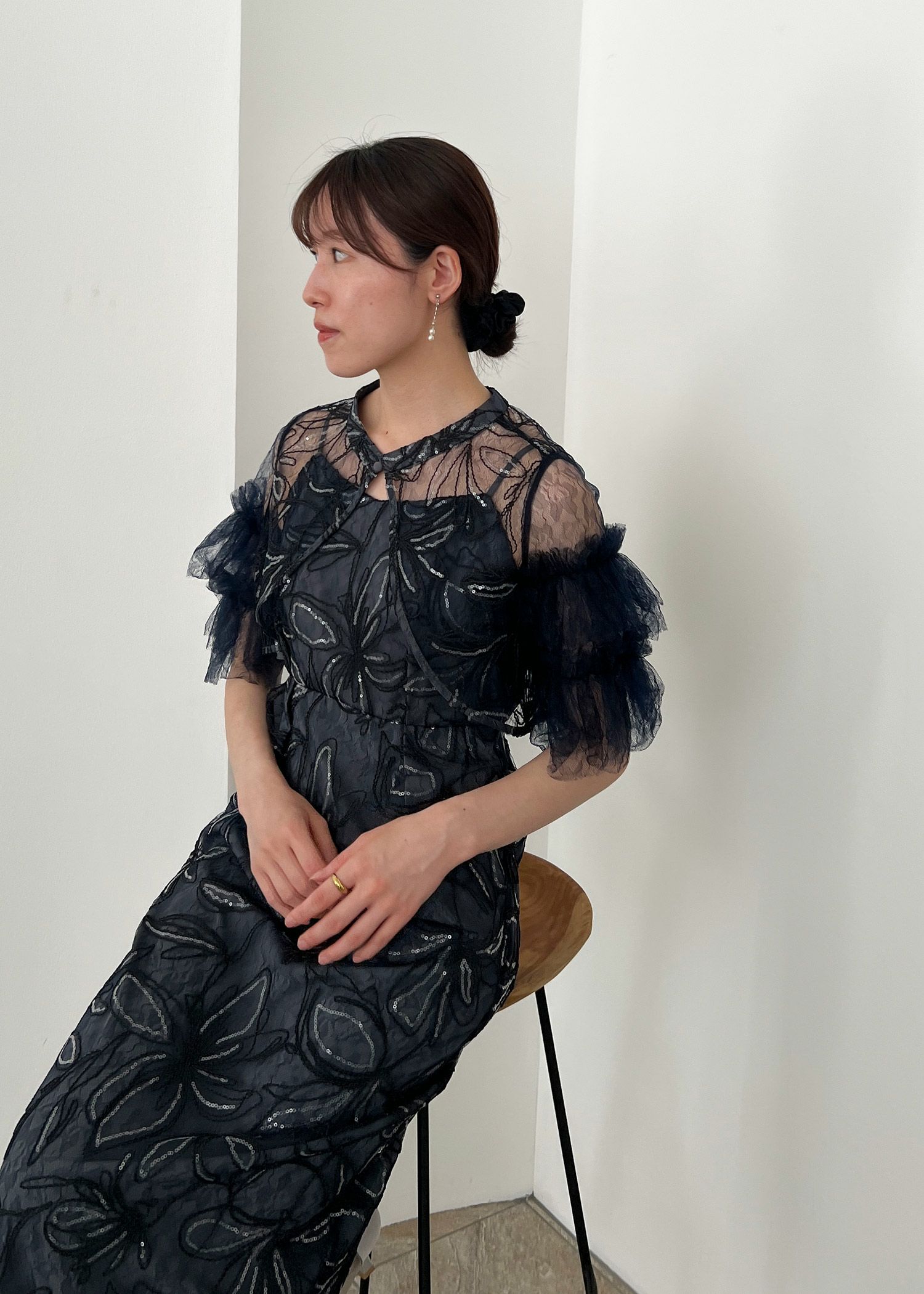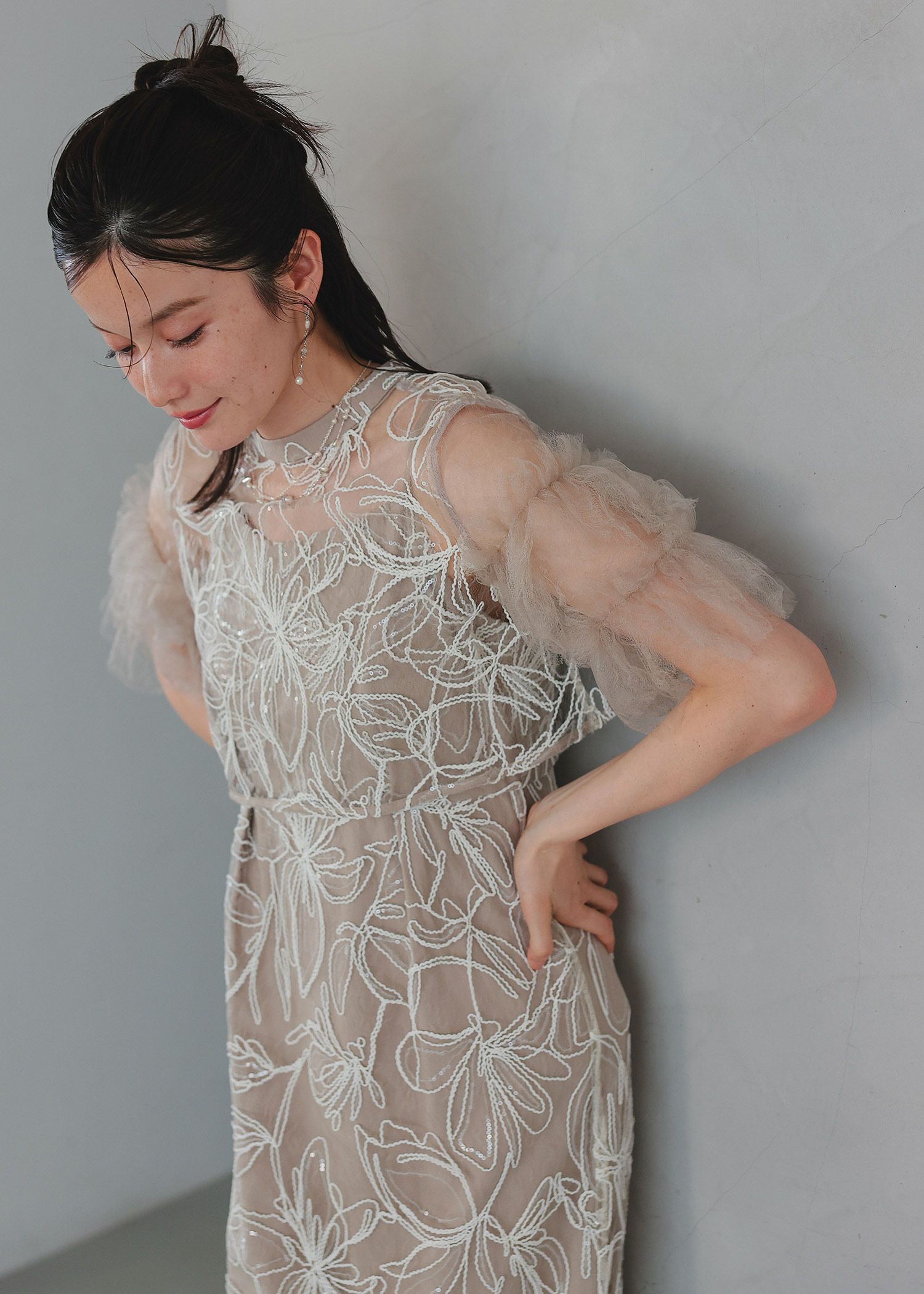 商品説明 ふわっとチュールとキラめくスパンコールの可愛さを詰め込んだドレス。 線で描いたような花柄刺繍が都会的な雰囲気を演出。 刺繍にはスパンコールが散りばめられており、 動くたびにさりげなくキラめくのがとっても綺麗。 短めのブラウス丈でスタイルアップも。 袖のふわっと柔らかいレースチュールが優しい印象をプラスします。 前後どちらをフロントにしても着られるタイプなので、 お好みに合わせて変えていただけます。 ワンピースはIラインのストレートなシルエットで大人っぽく。 スカートの前に入ったタックは、立体感を生み出すだけでなく ウエスト周りをスッキリと見せつつ、着心地にゆとりも与えてくれます。 タイムレスなデザインで長く着ていただける、 程よくシンプルで洗練された印象のお呼ばれドレスです。 ※商品画像は、光の当たり具合やパソコンなどの閲覧環境により、 実際の色味と異なって見える場合がございます。予めご了承ください。 おすすめのシーン 結婚式・披露宴・二次会・同窓会・謝恩会など 多様なシーンのコーディネートに使えます。 商品詳細 【備考】 ・裏地あり ・伸縮性なし ・後ろウエストゴム入り ・バックファスナー仕様 洗濯方法:クリーニング店にご相談ください。 ※その他お取り扱いに関しましては、商品に付属のアテンションタグをご覧ください。 原産国:中国 お問い合わせ品番:25637 着用モデル身長160cm