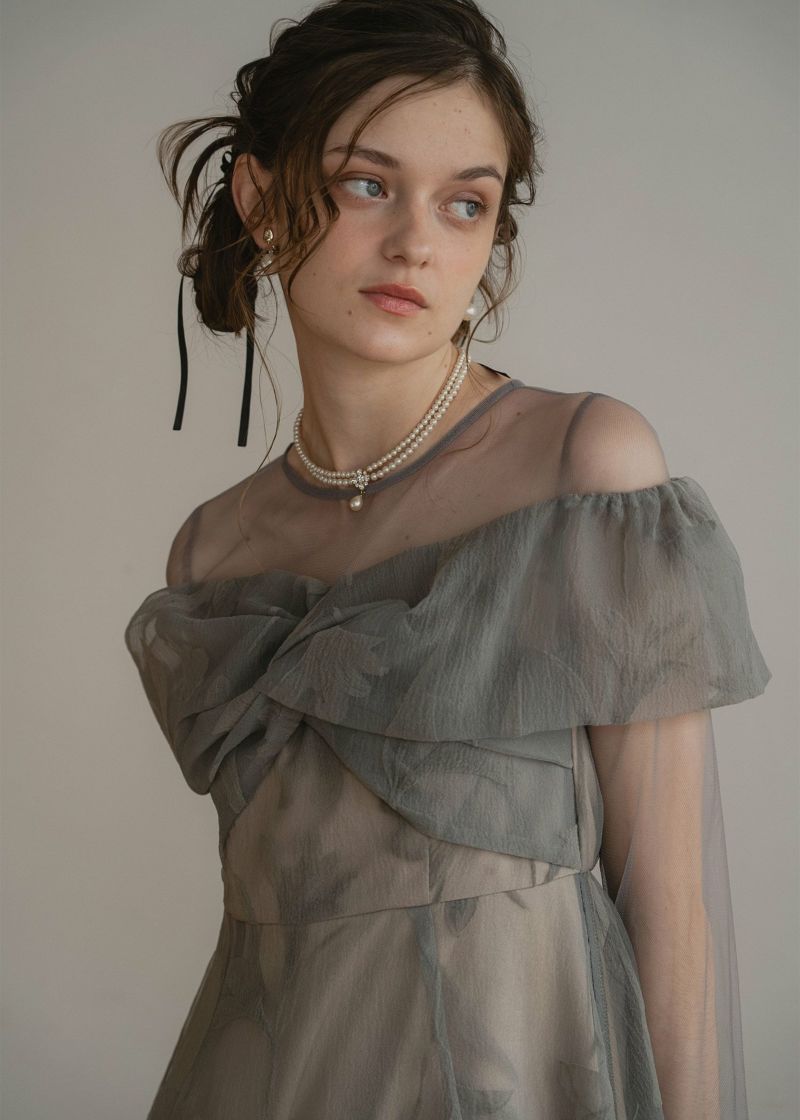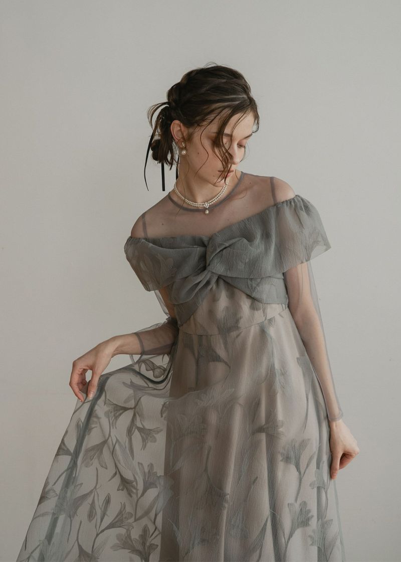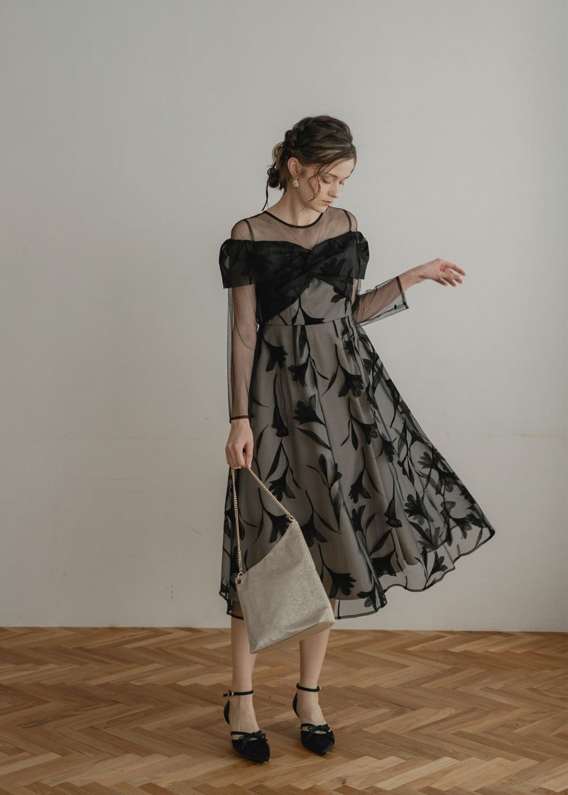 商品説明 繊細なチュールと立体的なリボンモチーフが目を惹く一着。 シアー素材がデコルテを美しく演出し、 ギャザーを寄せたボリューム感のある胸元が印象的。 フロッキー加工を施したオーガンジー地に上品なフラワー刺繍を重ね、 袖口まで透け感のあるスリーブが女性らしさと程よい抜け感をプラス。 甘すぎず気品のあるデザインで、パーティーや特別な日のお呼ばれスタイルにぴったりです。 ※ハンガー掛けの商品画像が実際の商品のお色味に近くなっております。 ※商品画像は、光の当たり具合やパソコンなどの閲覧環境により、 実際の色味と異なって見える場合がございます。予めご了承ください。 おすすめのシーン カジュアルな結婚式・二次会・お呼ばれ・成人式・同窓会・ 女子会・謝恩会 パーティー・演奏会・お食事会など多様なシーンのコーディネートに使えます。 商品詳細 【備考】 ・裏地あり ・バックファスナー仕様 ・伸縮性なし ・くるみボタン1つあり ・バックウエストゴム仕様(伸縮性あり) 洗濯方法:クリーニング店にご相談ください。 ※その他お取り扱いに関しましては、商品に付属のアテンションタグをご覧ください。 原産国:中国 お問い合わせ品番:25665