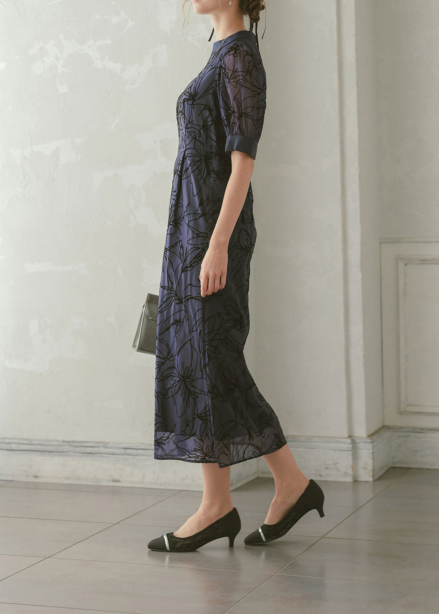 大人っぽい雰囲気の花柄Iラインドレス