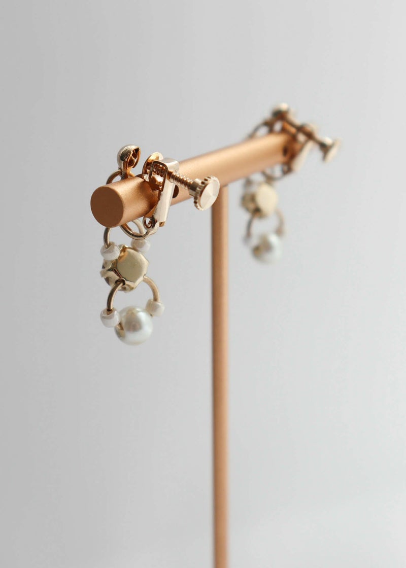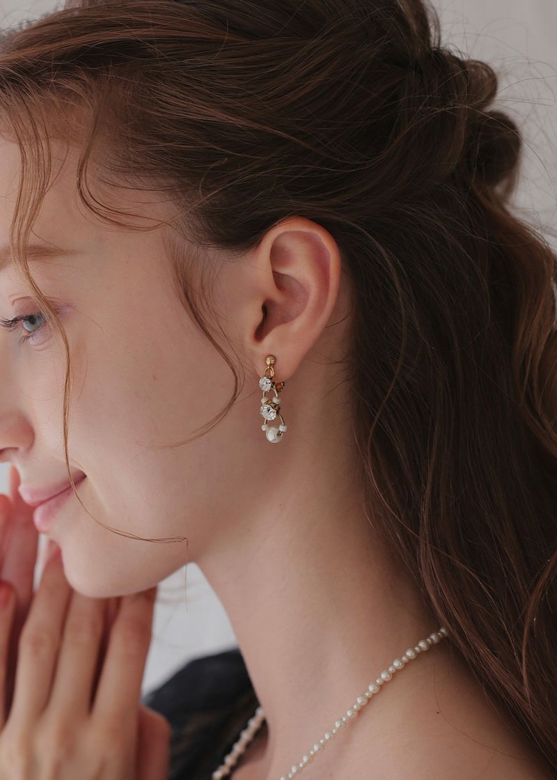 輝きのあるストーンとパールにミニリングを合わせた目を惹くイヤリング。