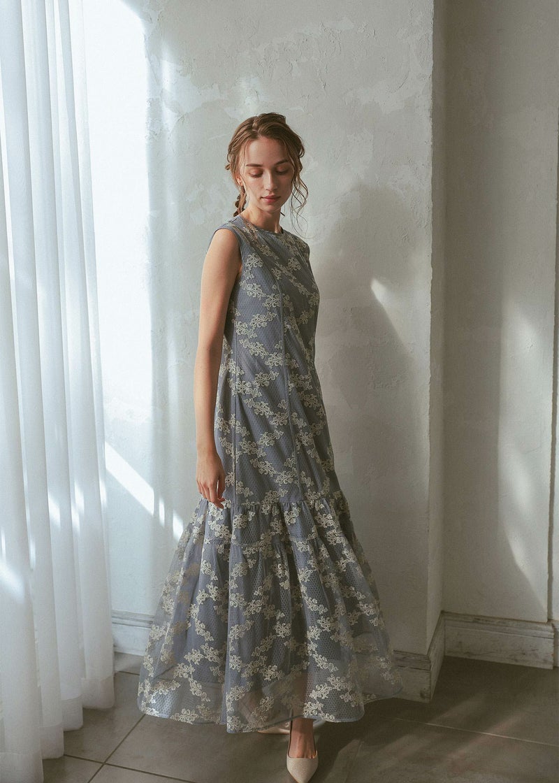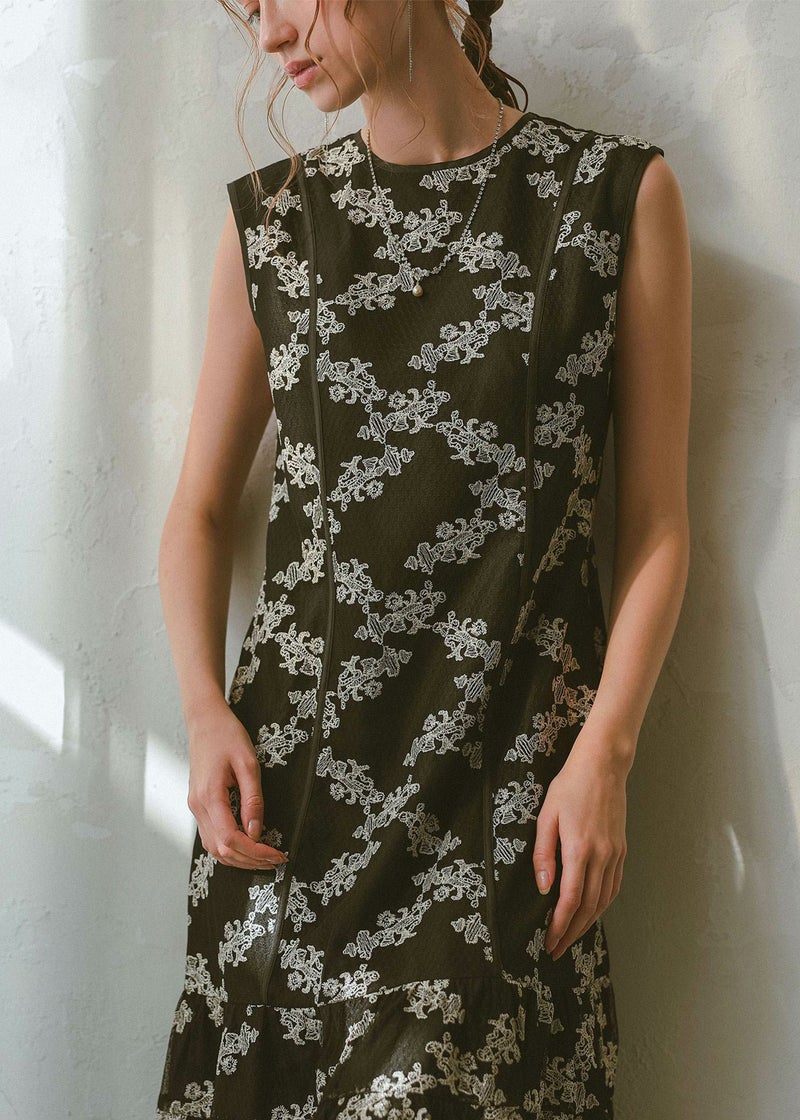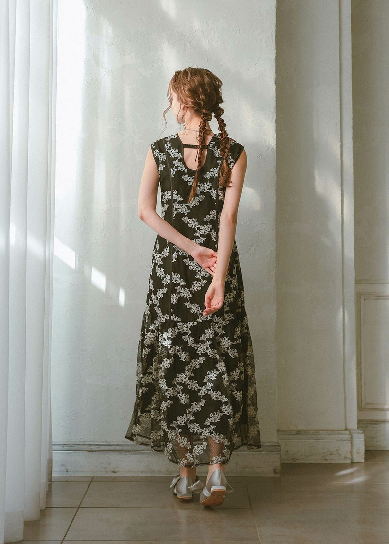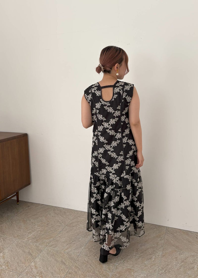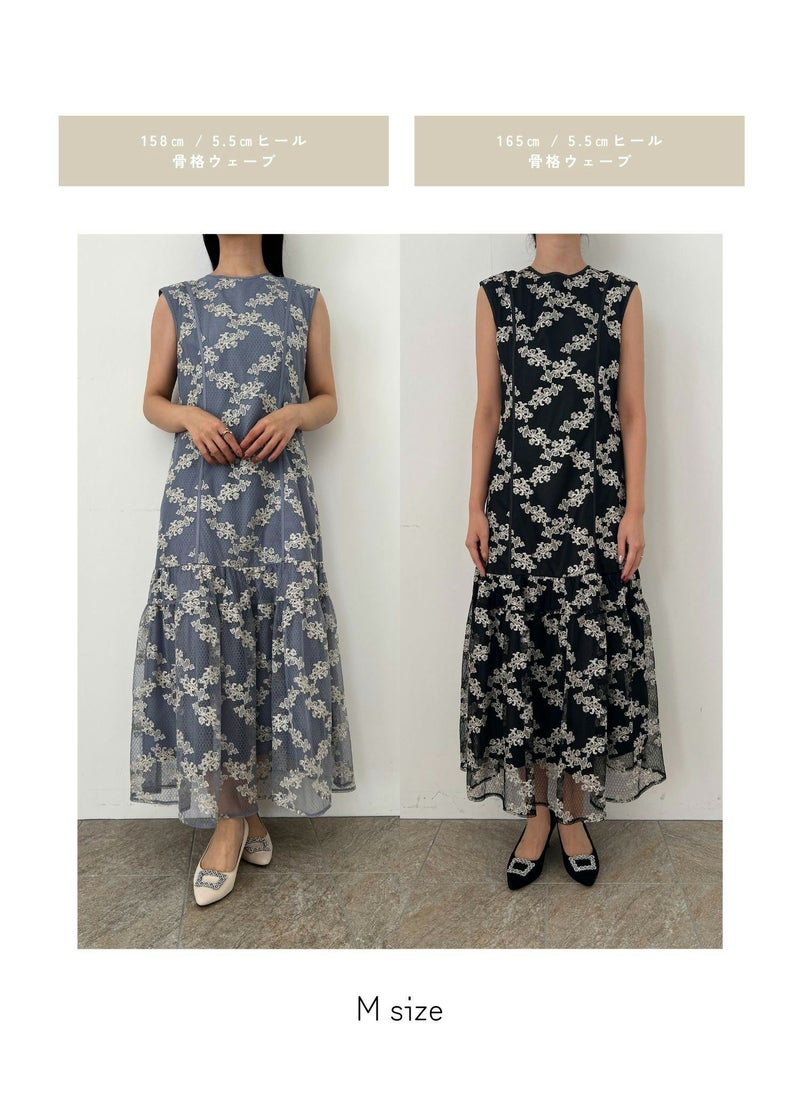 存在感のある刺繍が目を惹くドレス。 チュールレースも他ドレスとは違う生地を使用することで、ひとクセ加えた華やかなパーティースタイルに。 刺繍糸には光沢のある糸を使用し、高級感かつ華やさを感じさせます。 バックデザインは緩やかな深めのUネックラインにすることで程よい抜け感と、後ろから見た際のエレガントさにも拘りました。 スカート部分は広がり過ぎない程よいフレアでお作り。 動くたびふわりと揺れることでエレガントさを演出します。 カジュアルなパーティーシーンだけでなく、デイリーにも使える大人のドレス。 デートやホカンスなど普段使いにもオススメ。 ※ノースリーブデザインでお作りしている為、結婚式の場合は、羽織りなどで肩を隠してご着用ください。 ※ハンガー掛けの商品画像が実際の商品のお色味に近くなっております。 ※商品画像は、光の当たり具合やパソコンなどの閲覧環境により、 実際の色味と異なって見える場合がございます。予めご了承ください。 モデル着用サイズ 172cm/Mサイズ