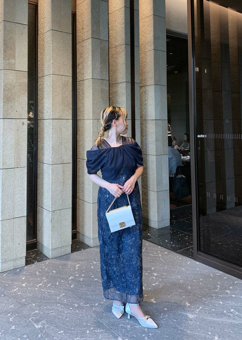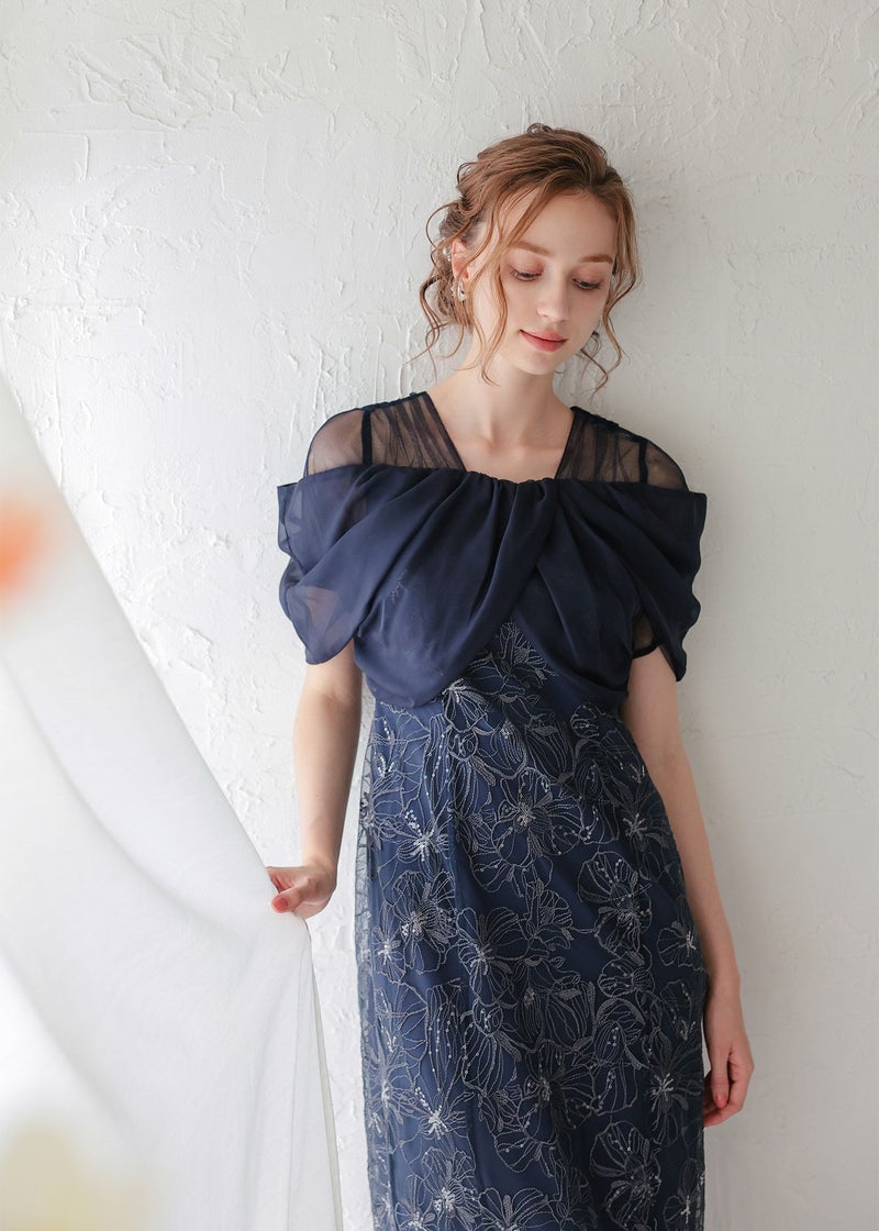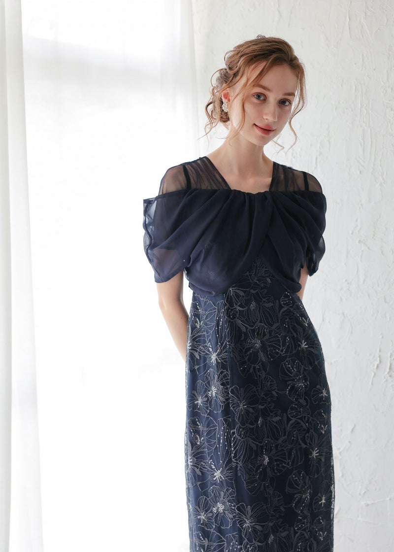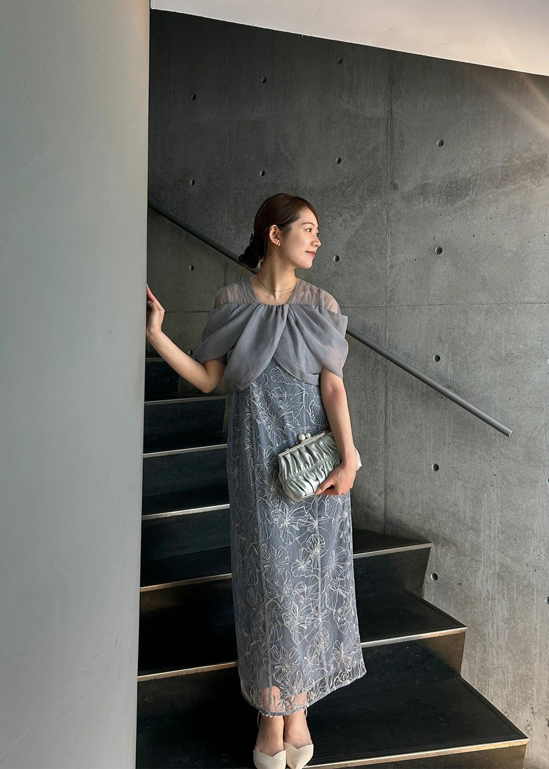 繊細なリーフ刺繍と輝きのあるスパンコールが施された 華やかで洗練されたデザインのIラインドレス。 デコルテ部分から切り替えた程よい透け感のオーガンジーを使用することで 抜け感がありスタイリッシュな印象になります。 オフショルっぽいデザインが肩回りをより華奢見えする効果もあります。 ワンピースは花柄刺繍とスパンコールが施され、動くたび上品に輝く煌びやかなデザインに。 バックスリットが抜け感をプラスし、程よいフェミニンさを引き立ててくれます。 Iラインシルエットは縦のラインをすっきりと見せてくれ、スタイルアップ効果も。 ※ハンガー掛けの商品画像が実際の商品のお色味に近くなっております。 ※商品画像は、光の当たり具合やパソコンなどの閲覧環境により、 実際の色味と異なって見える場合がございます。予めご了承ください。