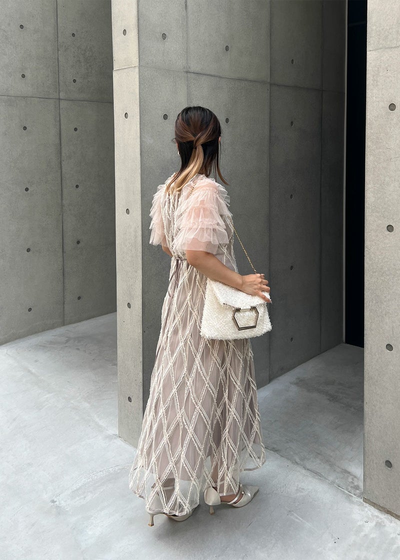 チュールフリルを重ねたふんわりとした袖も、華やかさをプラスしてくれる要素です。
