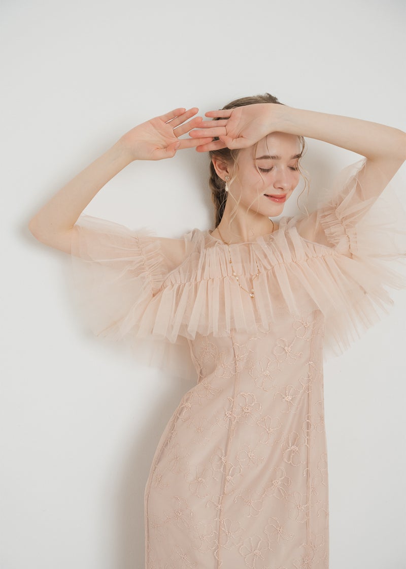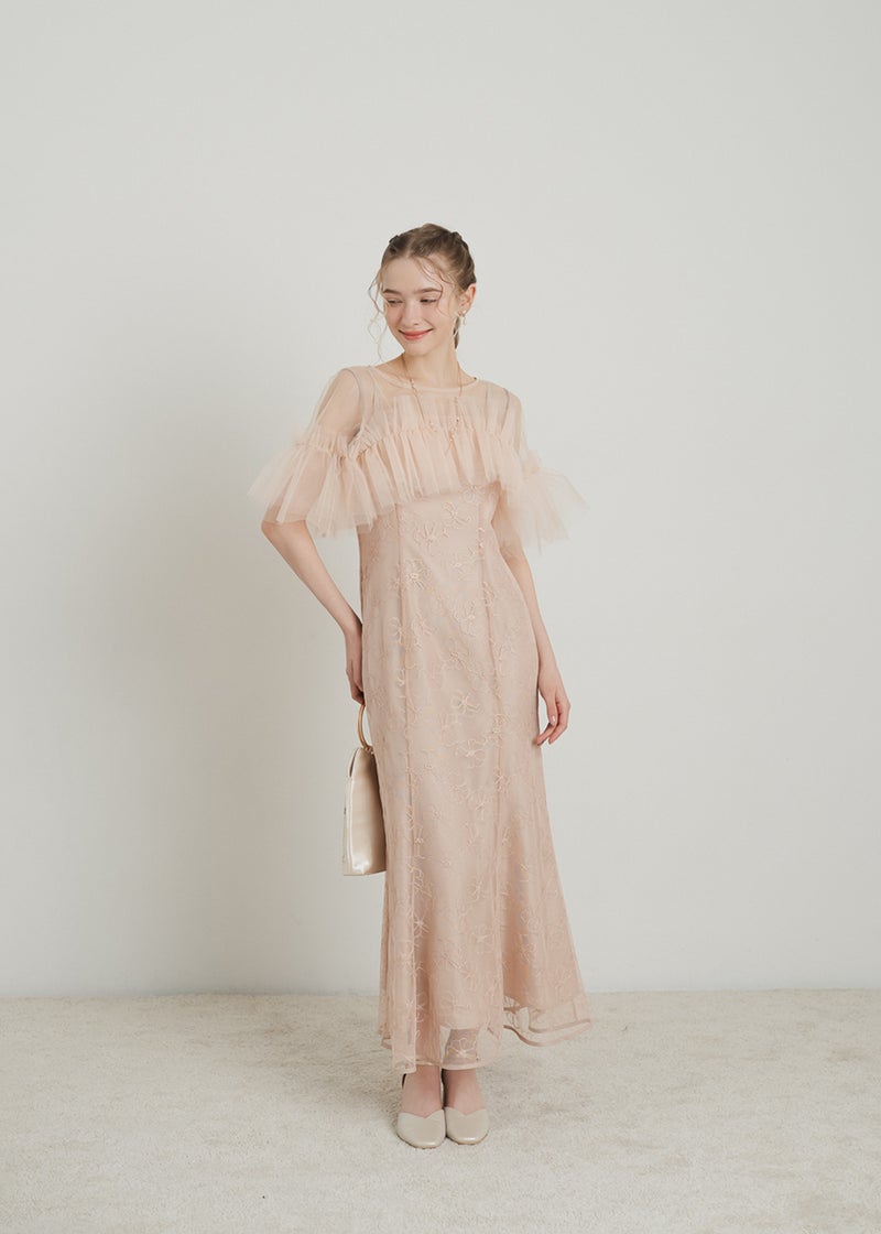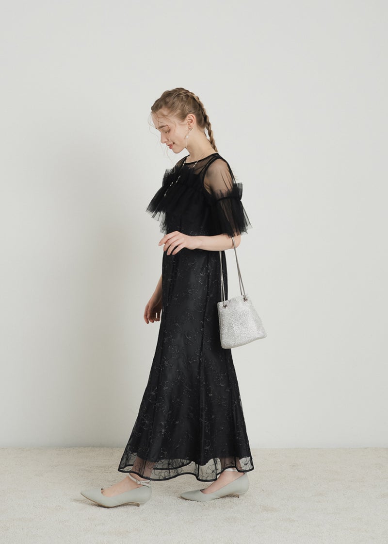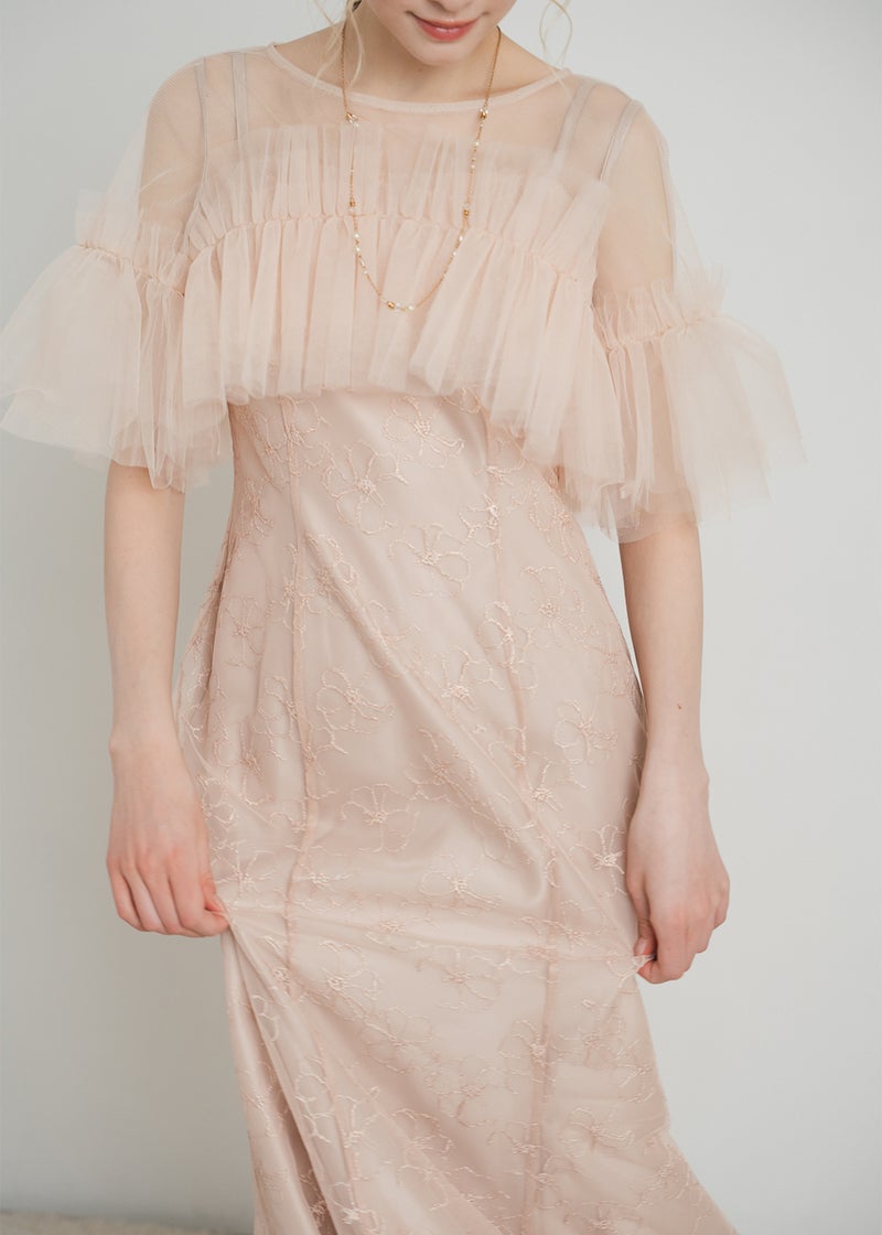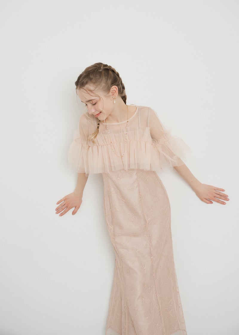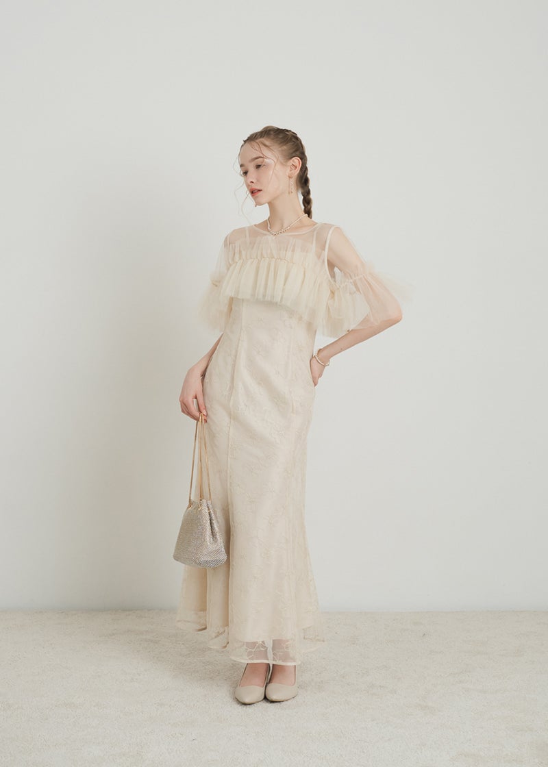 繊細なレース素材に、チュールボレロを重ねた華やかなセットドレス。 胸元にたっぷりとあしらったチュールフリルが 顔まわりを華やかに彩り、印象的なスタイリングを叶えます。 ボディラインを美しく引き立てるマーメイドシルエットで、 女性らしい曲線を上品に演出。 結婚式や二次会、パーティーなど 特別なシーンにふさわしい一着です。 ※商品画像は光の当たり具合や端末など、閲覧環境により、 実際の色味と異なって見える場合がございます。予めご了承ください。
