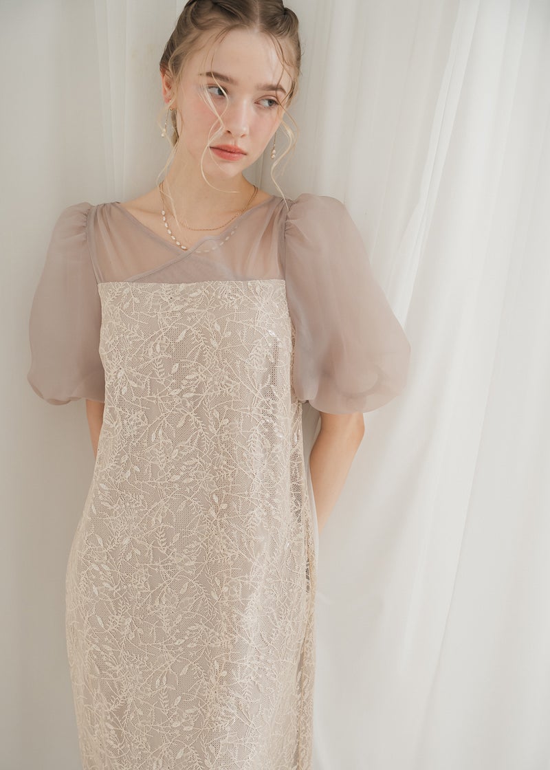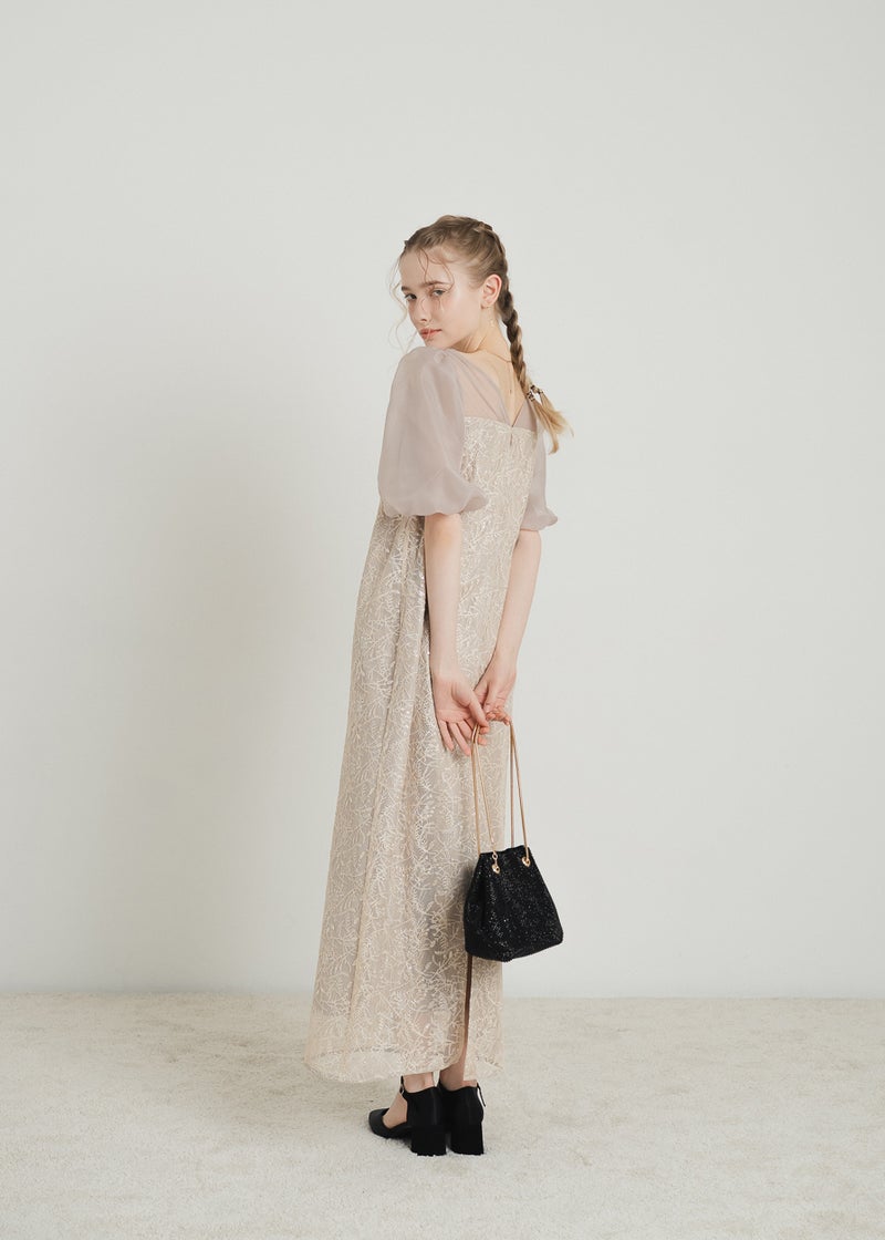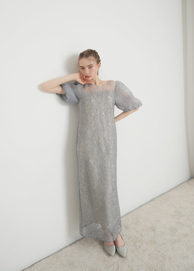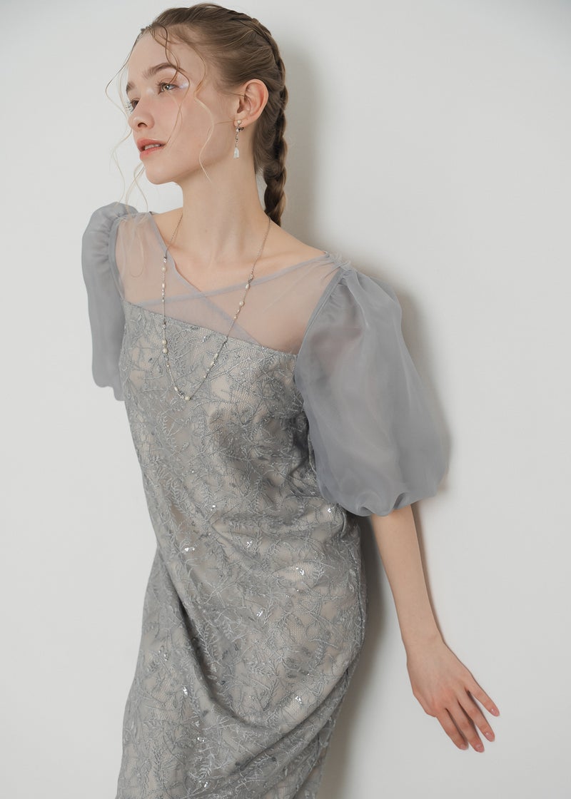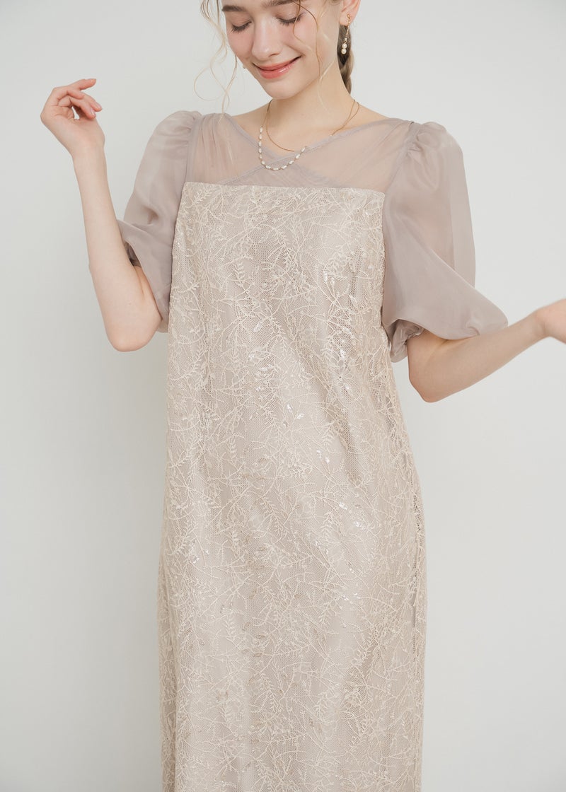 繊細なリーフ柄刺繍とふんわりパフスリーブが目を引く、上品さと可憐さを兼ね備えたドレス。 全体に施された刺繍の中に、さりげなくきらめくスパンコールがアクセントに。 デコルテ部分は程よいシアー感とクロスデザインのVネックですっきりとした印象を与えます。 シアー素材を重ねた、ぽわんとボリューム感が可愛いパフスリーブには、 洗練されたIラインシルエットのワンピースで可愛らしさの中に上品さもある佇まいに。 配色にこだわって選んだ、地と刺繍レース地のバランス感もポイントです。 それぞれのカラーに合うよう、カラーごとに裏地の色を変えています。 ベビーピンクのような、ふんわりとした印象のベージュ 少しくすみのあるニュアンス感が可愛いブルー 引き締まって見えて、より大人っぽく決まるブラック カラーを選ぶのも、ついときめいてしまうカラー展開です。 甘すぎない、大人可愛い一着をお探しの方にぜひ。 ※商品画像は、光の当たり具合やパソコンなどの閲覧環境により、 実際の色味と異なって見える場合がございます。予めご了承ください。