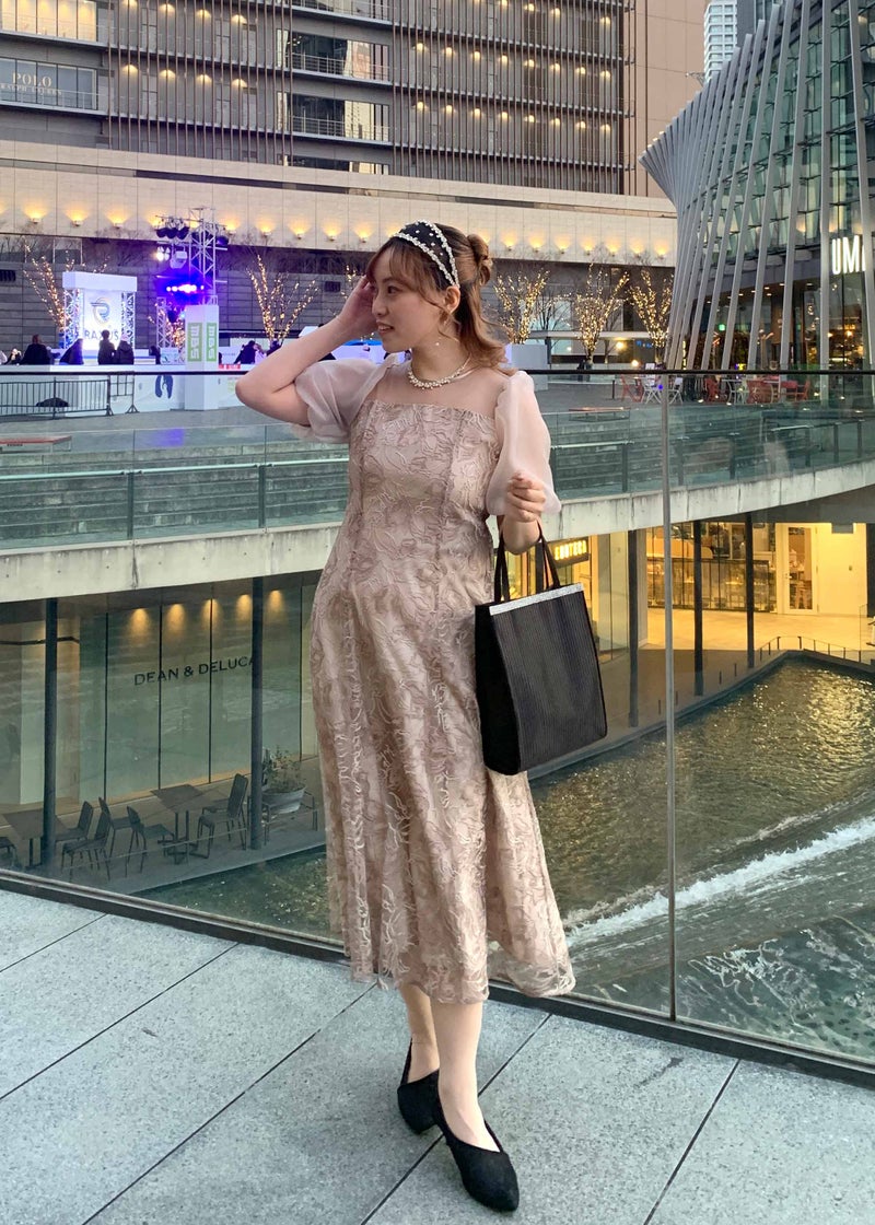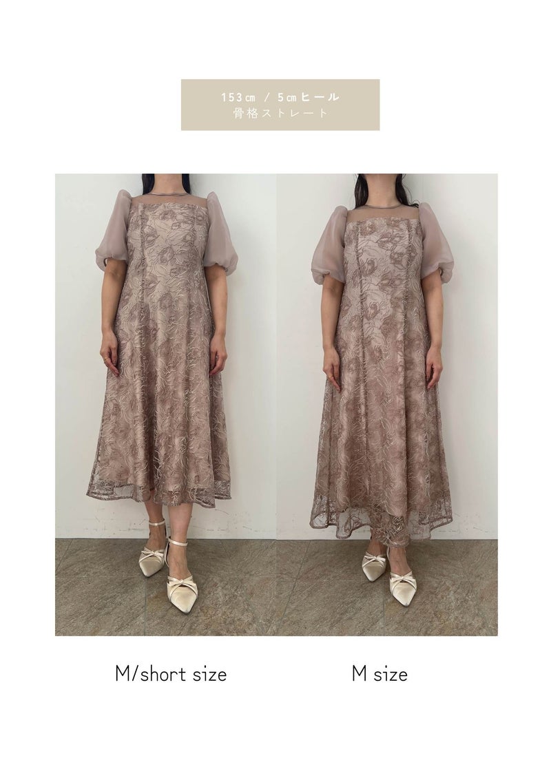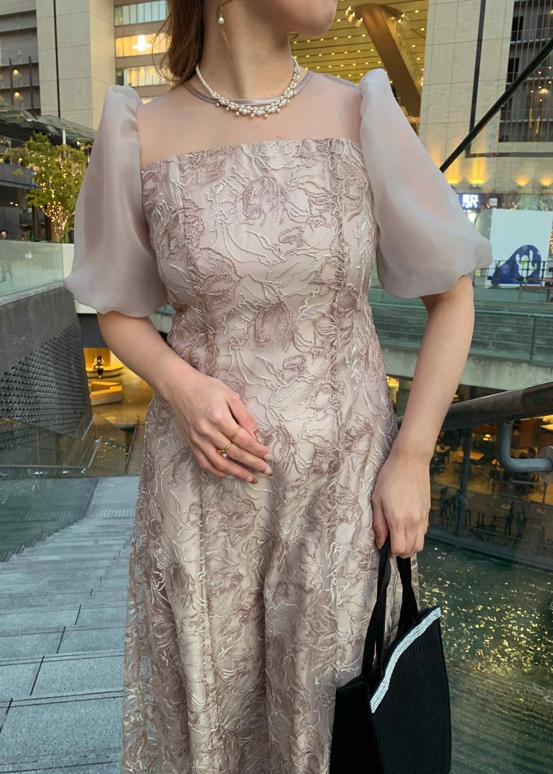 ニュアンスカラーで刺繍された花柄が目を惹く華やかなドレス。