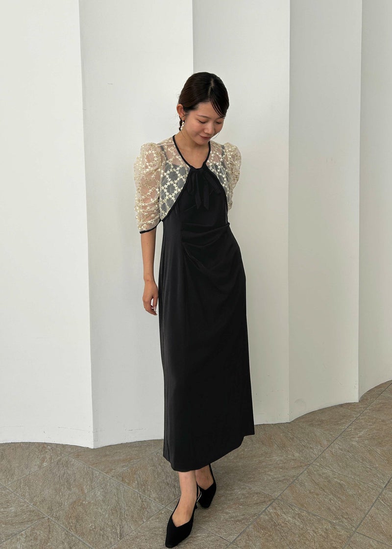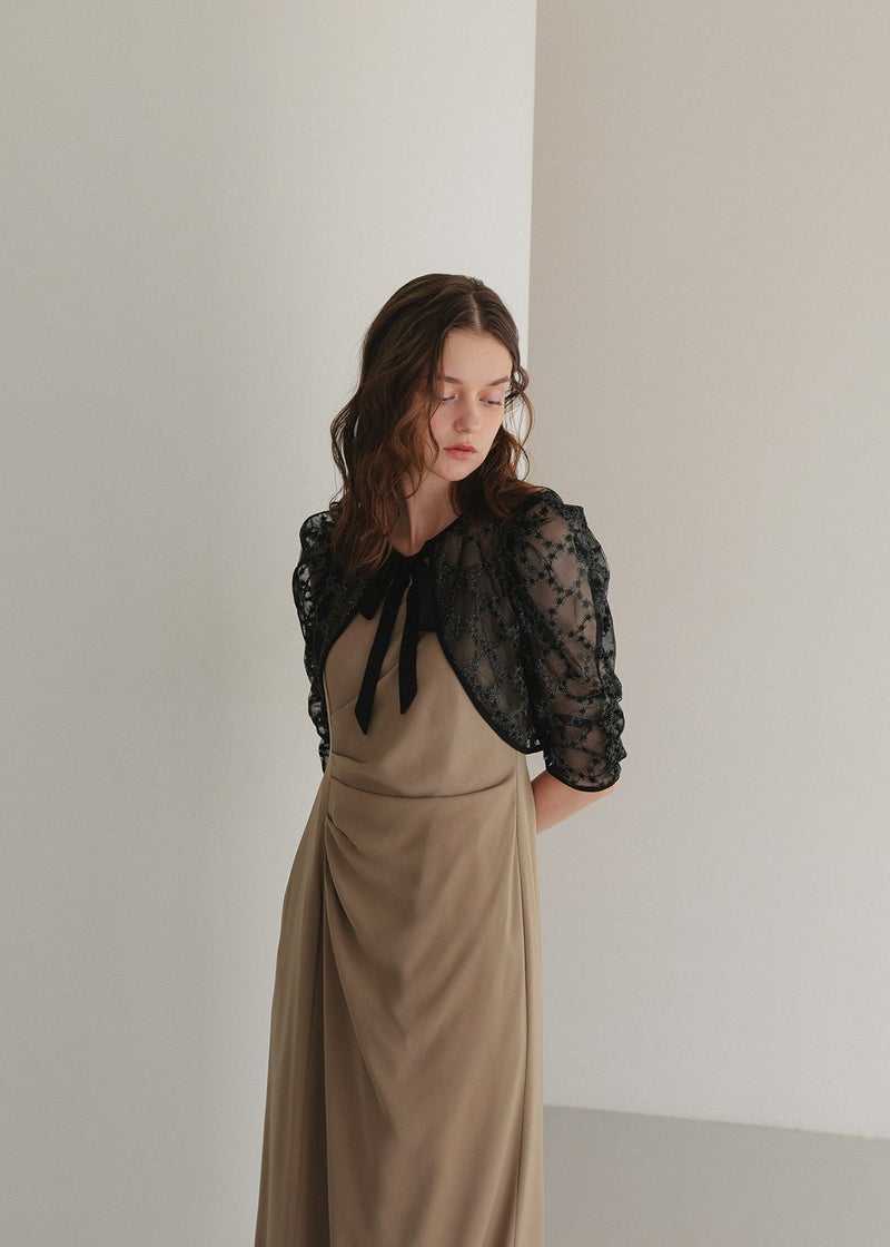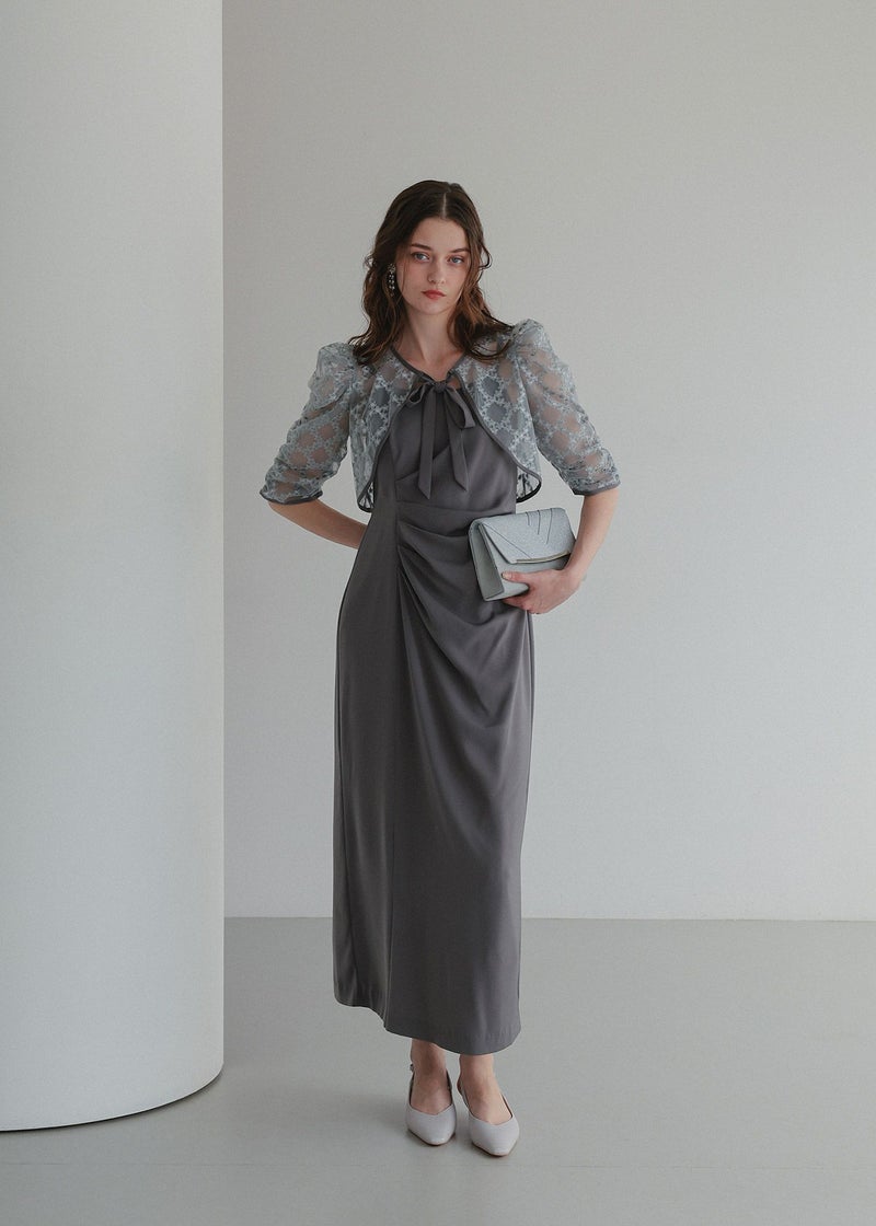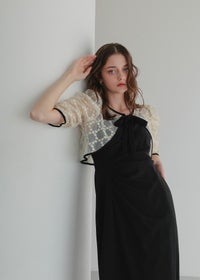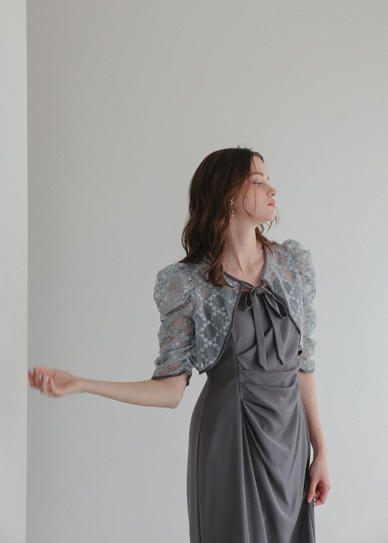 ダイヤ柄のレースボレロとドレープ感が美しいドレスのセットアイテム