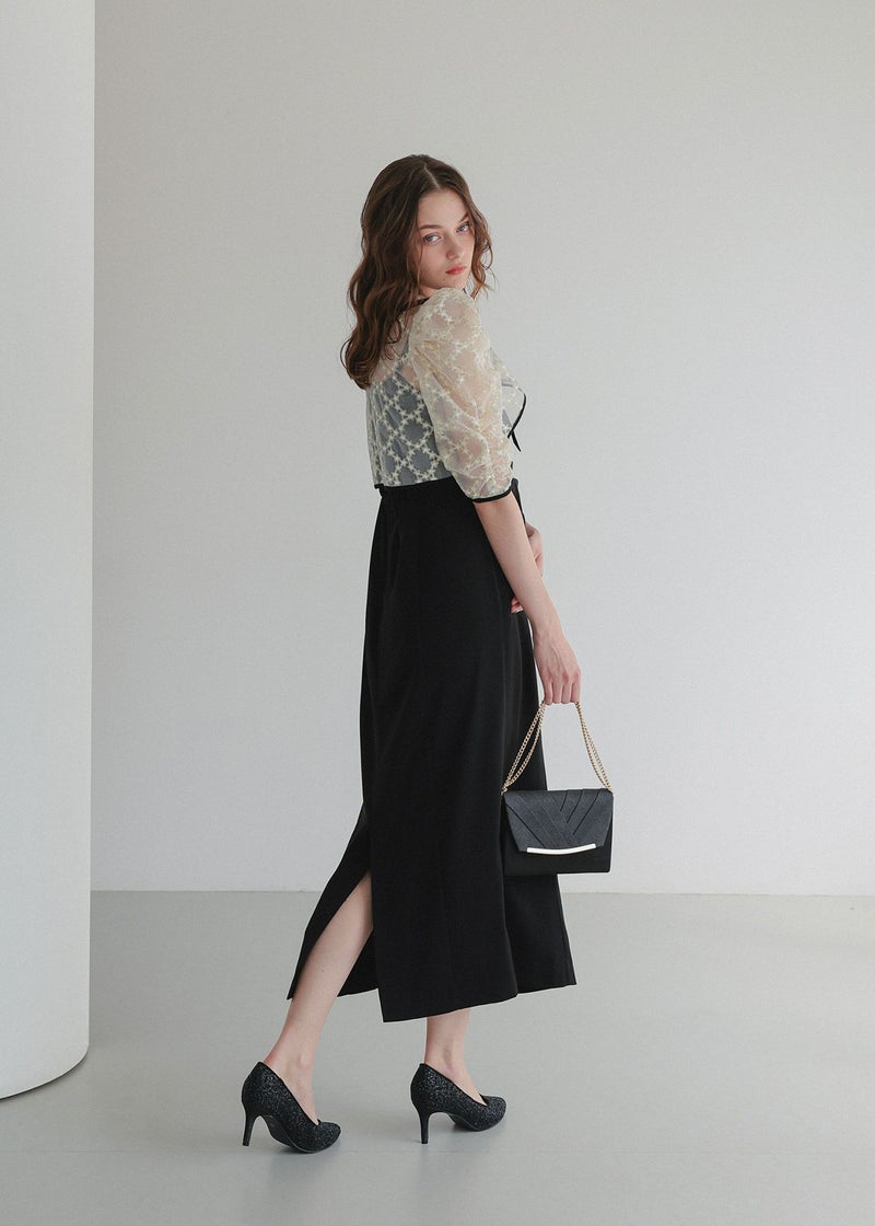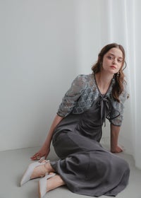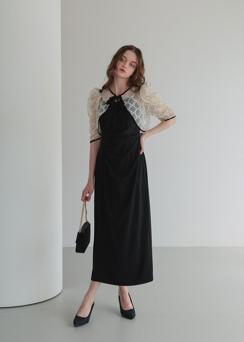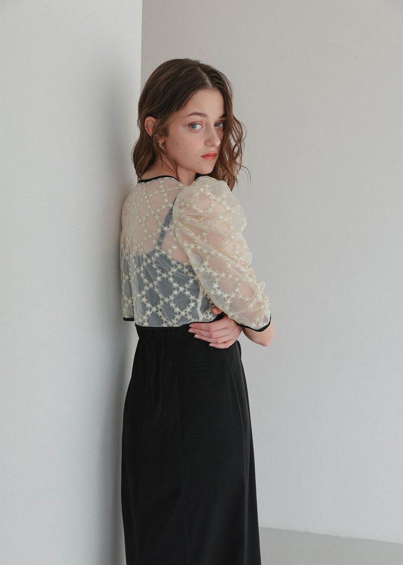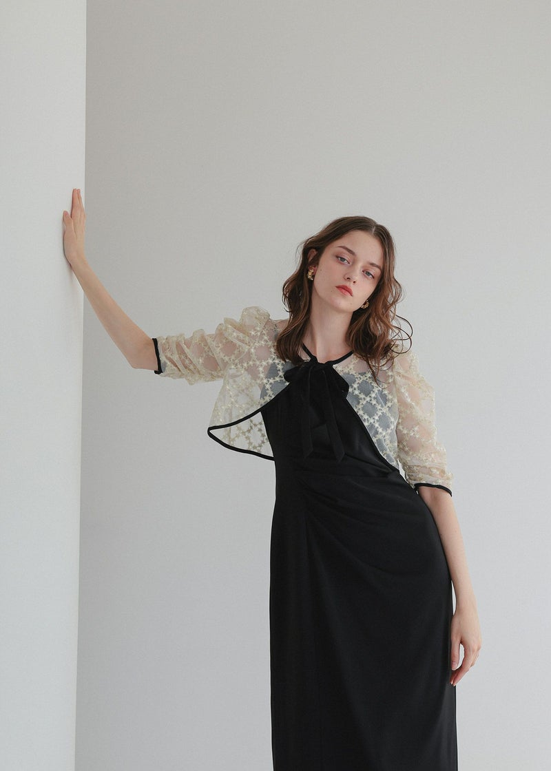 ダイヤ柄のレースボレロとドレープ感が美しいドレスのセットアイテム