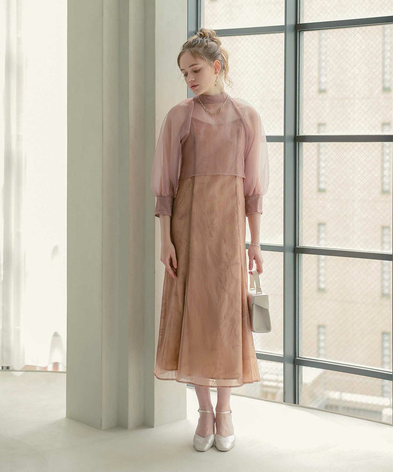 ボリュームのあるボレロに対して、ワンピースはすっきりとしたシルエットでメリハリを持たせ、