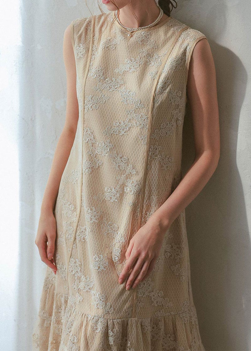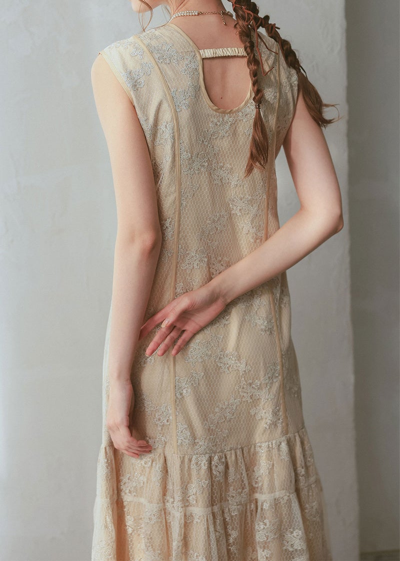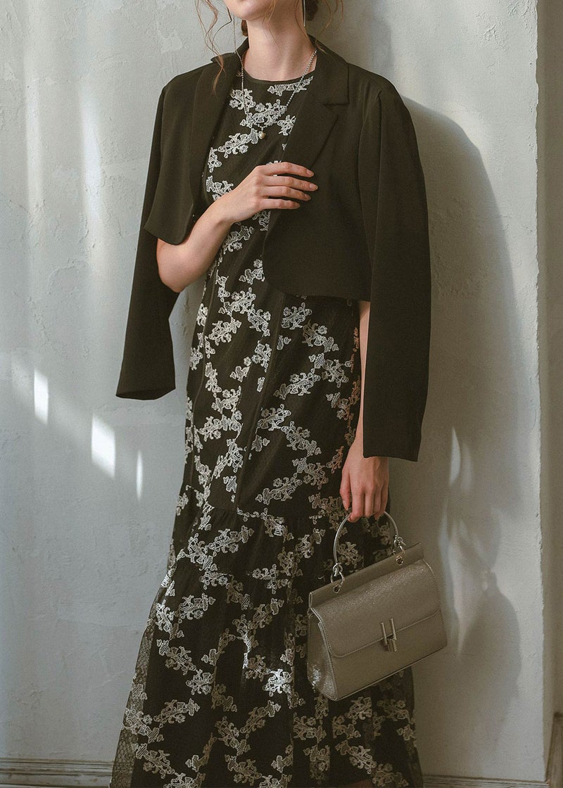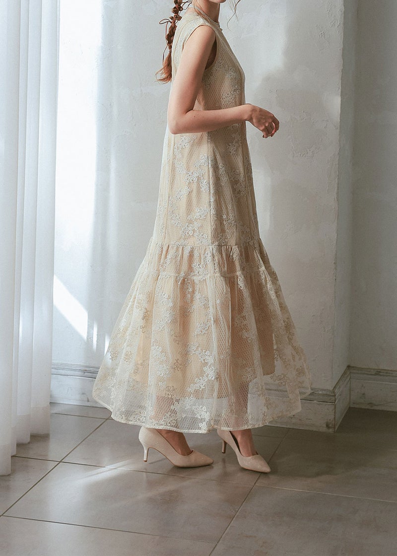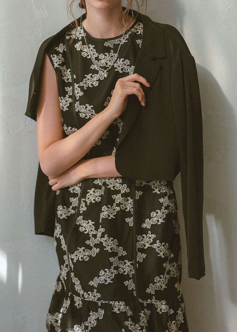 存在感のある刺繍が目を惹くドレス。 チュールレースも他ドレスとは違う生地を使用することで、ひとクセ加えた華やかなパーティースタイルに。 刺繍糸には光沢のある糸を使用し、高級感かつ華やさを感じさせます。 バックデザインは緩やかな深めのUネックラインにすることで程よい抜け感と、後ろから見た際のエレガントさにも拘りました。 スカート部分は広がり過ぎない程よいフレアでお作り。 動くたびふわりと揺れることでエレガントさを演出します。 カジュアルなパーティーシーンだけでなく、デイリーにも使える大人のドレス。 デートやホカンスなど普段使いにもオススメ。 ※ノースリーブデザインでお作りしている為、結婚式の場合は、羽織りなどで肩を隠してご着用ください。 ※ハンガー掛けの商品画像が実際の商品のお色味に近くなっております。 ※商品画像は、光の当たり具合やパソコンなどの閲覧環境により、 実際の色味と異なって見える場合がございます。予めご了承ください。 モデル着用サイズ 172cm/Mサイズ