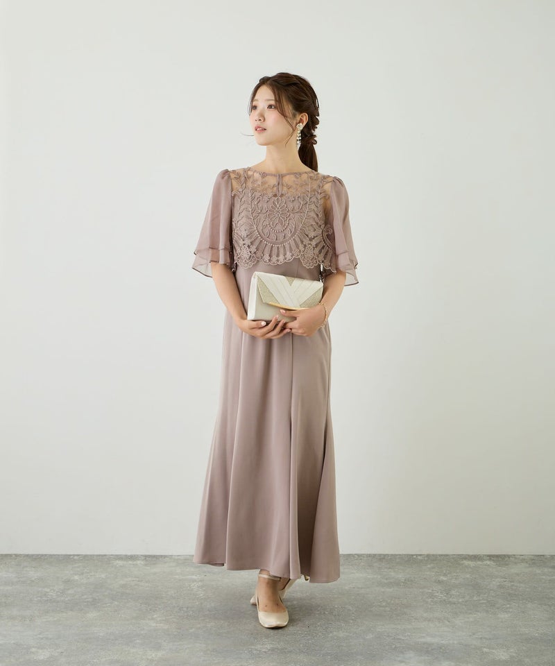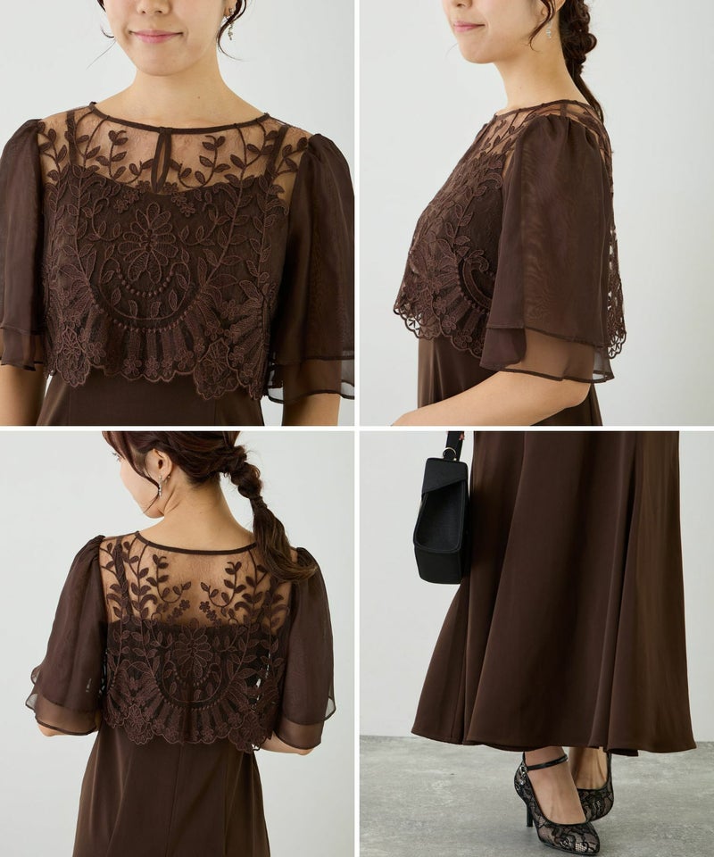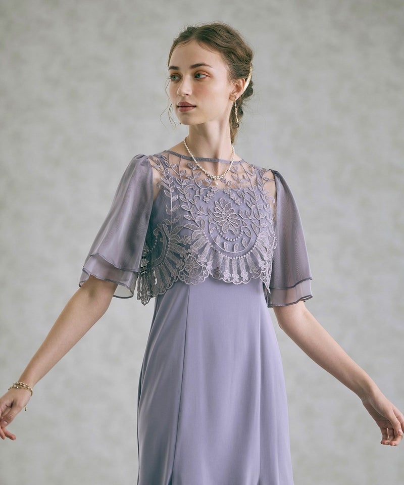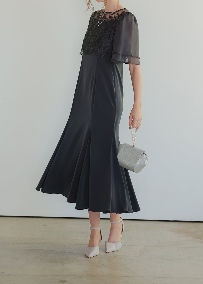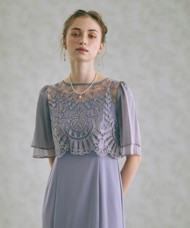 大胆な刺繍レースを使用したブラウスとキャミワンピースが セットになったエレガントな印象のドレス。 ブラウスは短めの丈でメリハリをつけスタイルアップ効果が◎ 袖はオーガンジーを2枚合わせの五分袖の肘上丈で、 裾に向かうにつれ広がりを持たせているので二の腕カバーも安心。 華やかなシーンではボレロの羽織りがなくても一枚で着用いただけるのも魅力です。 キャミドレスは好評頂いている美シルエットマーメイドの ボディラインを拾いすぎないソフトマーメイドシルエットです。 歩く度に揺れ、上品な華やかさを演出します。 キャミワンピースは1枚ではもちろん、ジャケット合わせもおすすめです。 インナーを合わせれば普段使いにもおすすめな1着です。 ※こちらの商品はWeb限定商品でございます。 ※商品画像は、光の当たり具合やパソコンなどの閲覧環境により、 実際の色味と異なって見える場合がございます。予めご了承ください。 モデル着用サイズ 172cm/Mサイズ