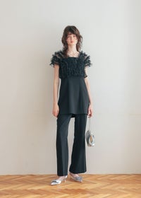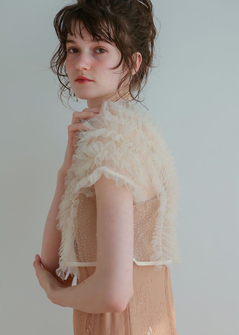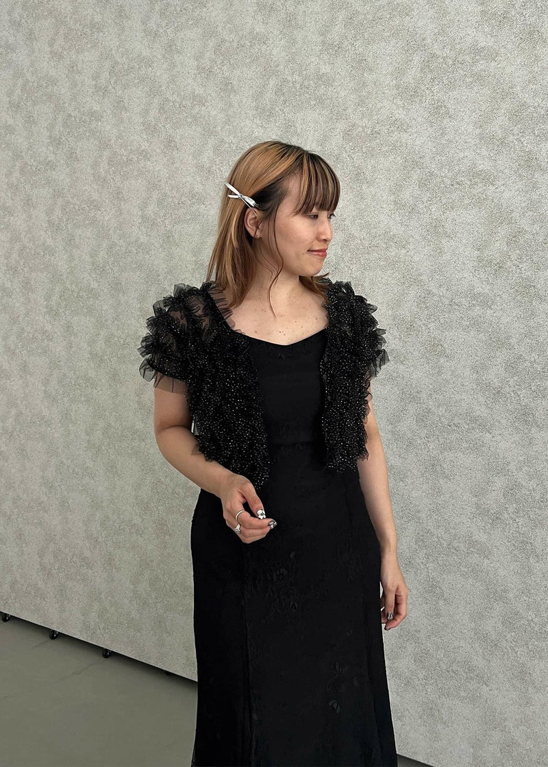 前後2way仕様のラメチュールをふんだんに使用したボレロ。 軽やかな透け感が上品な抜け感を与え、エレガントな雰囲気に。 グリッター感のあるラメがアクセントのチュールボレロは 光の角度によってさりげなく煌めくため、派手になりすぎず上品な印象を保ちます。 くるみボタンを開け、羽織としての着用もオススメです♪ 身頃は伸縮性があり柔らかく程よいフィット感でご着用していただけます。 また、シンプルなスタイリングに重ね着するだけでぐっとこなれた印象に仕上がります。 【コーディネートアイテム】 ・ボレロレイヤードレースドレス(82528) ・3pieceパンツドレス(25638) ※商品画像は、光の当たり具合やパソコンなどの閲覧環境により、 実際の色味と異なって見える場合がございます。予めご了承ください。