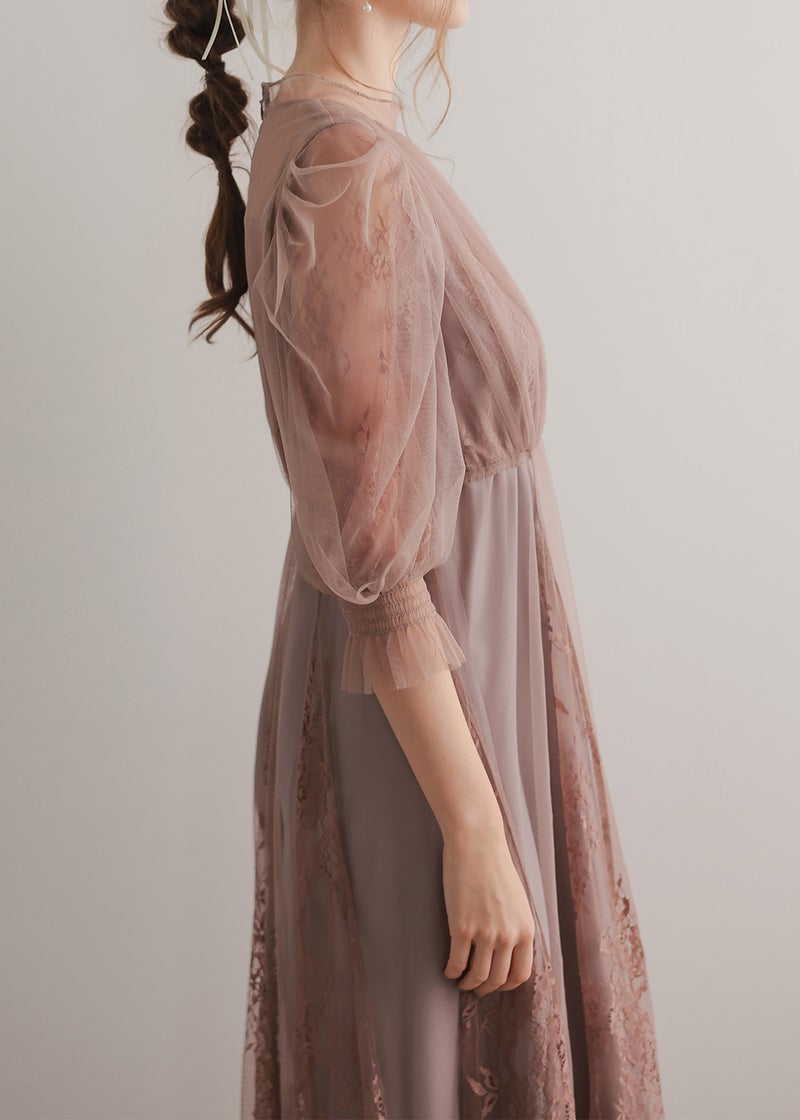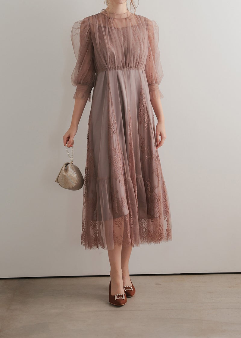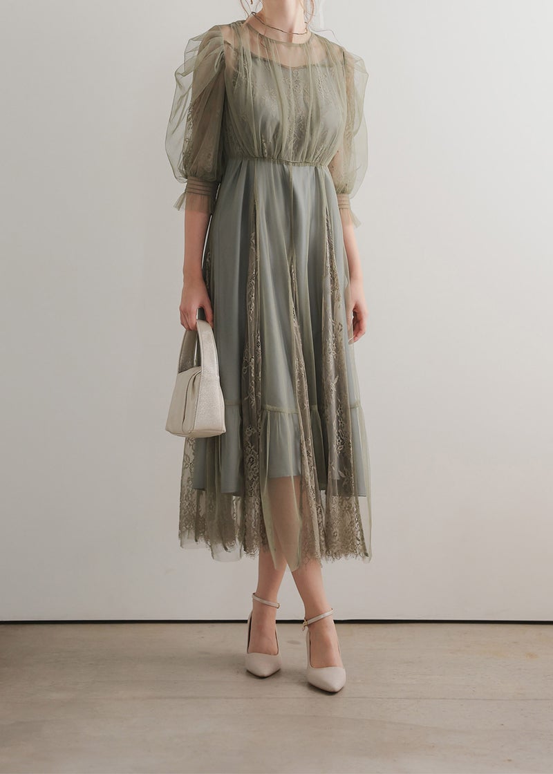 柔らかなフラワーモチーフレースとチュール素材を組み合わせたドレス。 チュールがエアリーに広がりきるだけで華やかな印象になります。 レースの切り替えや胸元のピンタック、レディライクなパフスリーブなど、 360℃どこから見ても絵になるクラシカルなディティールを贅沢に詰め込みました。 動くたびにスカートが広がるシルエットで、まるで花弁をその身に纏うかのようなドレスです。 裾のスカラップカットは上品さを演出。 気になる二の腕をおしゃれにカバーし、ウエスト周り全体にゴムが入っていてストレスフリーも実現。 ※ハンガー掛けの商品画像が実際の商品のお色味に近くなっております。 ※商品画像は、光の当たり具合やパソコンなどの閲覧環境により、 実際の色味と異なって見える場合がございます。予めご了承ください。 外国人着用モデル身長172cm グリーン着用SNAP身長158cm ブラック着用SNAP身長158cm モカチャ着用SNAP身長153cm チャコール着用SNAP身長153cm