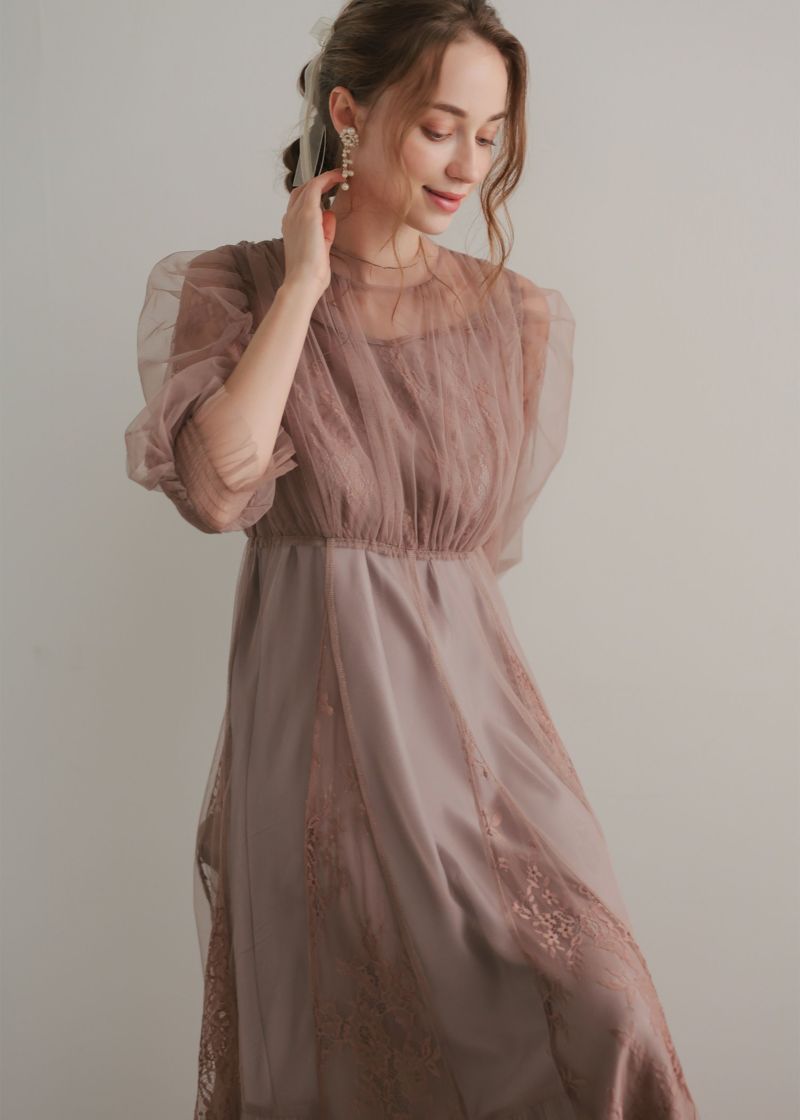 柔らかなフラワーモチーフレースとチュール素材を組み合わせたドレス。