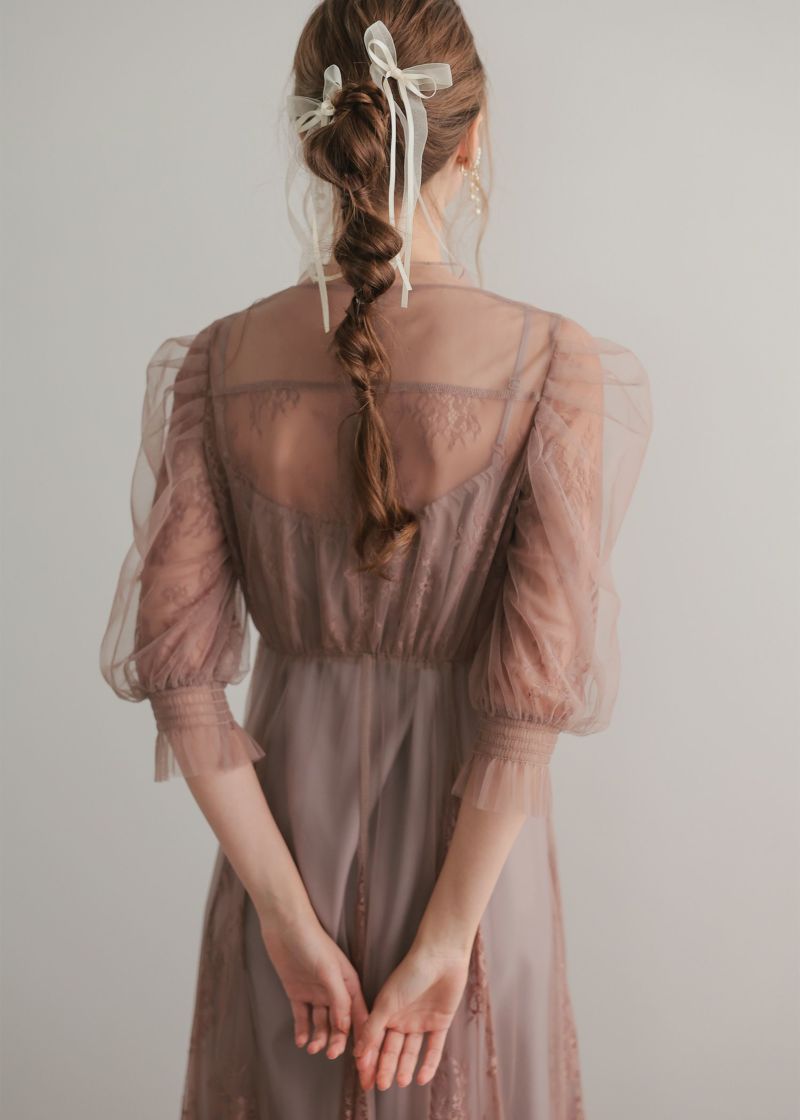レースの切り替えや胸元のピンタック、レディライクなパフスリーブなど、