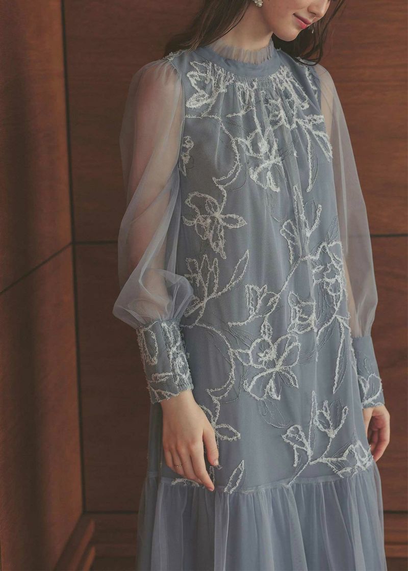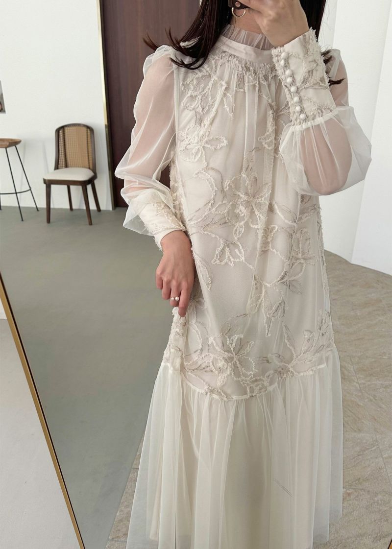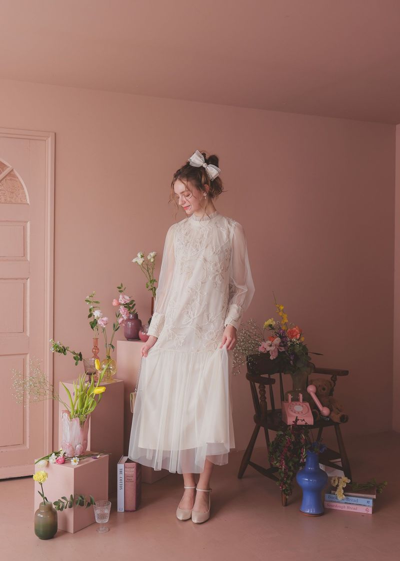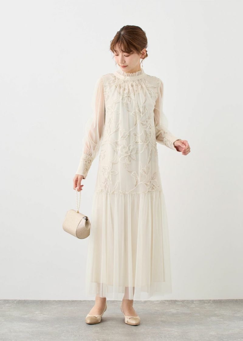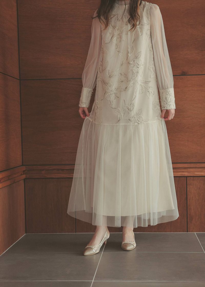 商品説明 立体感のあるフェザー糸とラメ糸を組み合わせたフラワー刺繍がポイントのドレス。 袖部分は無地のチュールを使用することで 上品な透け感を。女性らしさが引き立ち他とは被らない一枚に。 ロングカフスにはフラワー刺繍とクルミボタンを施すことで アンティークなイメージに仕上げました。 動くたびにふんわり広がるスカートに ストンとしたAラインシルエットなので体型をカバーし 着心地も楽ちんです。 シルエットや素材、ディティール一つ一つに拘りが詰まったアイテム。 結婚式や披露宴、二次会など幅広いシーンで大活躍してくれる一着です。 ※エクリュは白っぽいお色味のため、結婚式お呼ばれ以外のシーンにおすすめです。 ※花嫁さんの二次会などにもおすすめです? ※商品画像は、光の当たり具合やパソコンなどの閲覧環境により、 実際の色味と異なって見える場合がございます。予めご了承ください。 おすすめのシーン 結婚式・披露宴・二次会・同窓会・謝恩会など 多様なシーンのコーディネートに使えます。 商品詳細 【備考】 ・裏地あり ・伸縮性なし ・光沢なし ・袖に透け感 ・後ろ中心ファスナー 洗濯方法:クリーニング店にご相談ください。 ※その他お取り扱いに関しましては、商品に付属のアテンションタグをご覧ください。 原産国:中国 グレー着用SNAP身長165cm ブラック着用SNAP身長158cm エクリュ着用SNAP身長158cm