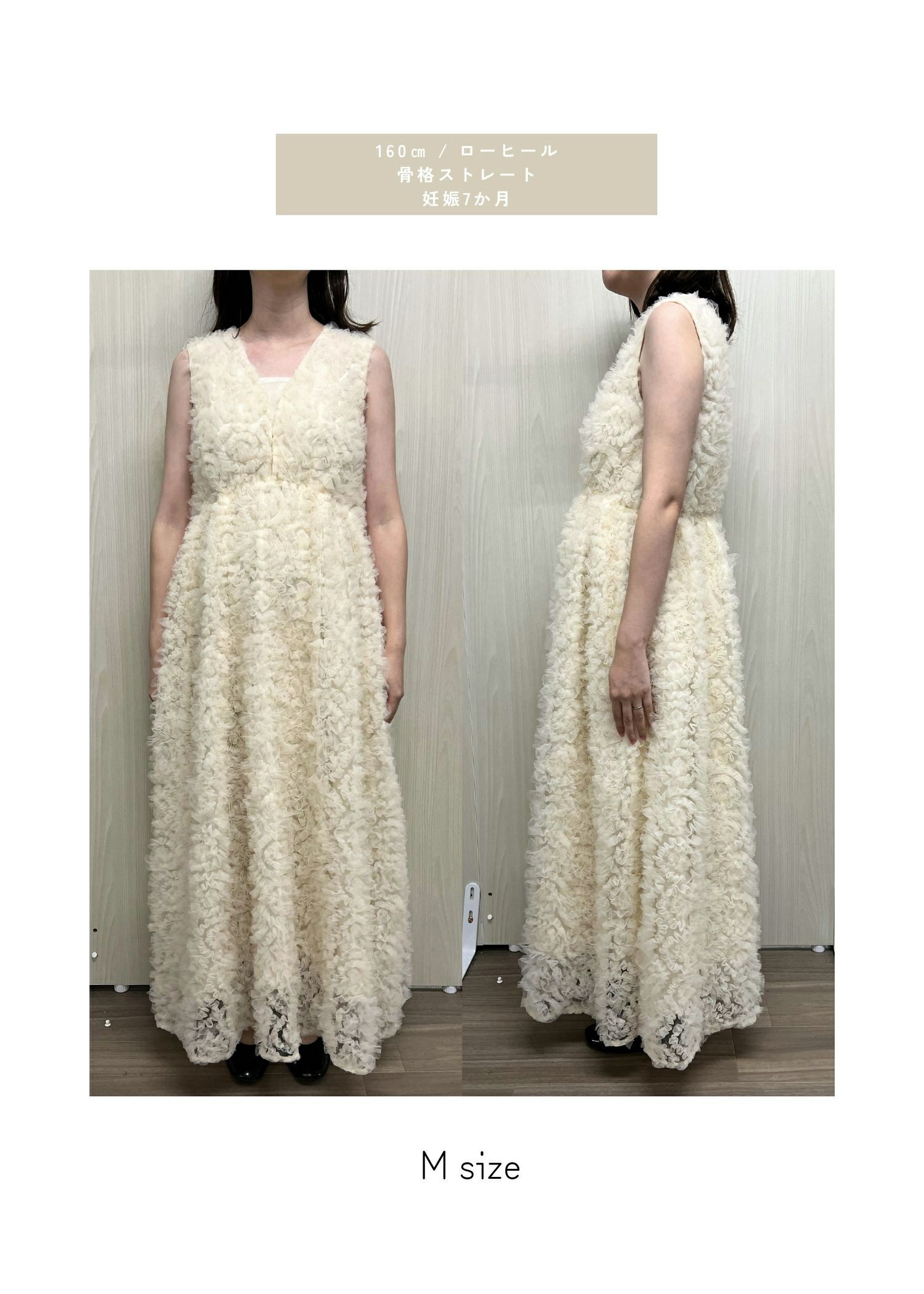 商品説明 全面にフリルをあしらった上品かつ可愛らしさを兼ね備えたホワイトドレス。 フリルチュールレースは他ドレスとは違う生地を使用することで、 他とは被りにくいひとクセ加えた華やかなパーティースタイルに。 Vネック仕様にすることで、程良い抜け感を演出。 インナー付きの為、安心してご着用いただけます。 ファスナーなしで被って着脱できるのでらくちん。 裾に向かってボリューム感が出るデザインでお作りしている為、 着用した際にふんわりと可愛らしく見せることができます。 またウエストゴム入りの為、ストレスフリーなのも拘りぬいた点。 妊娠中(妊娠7ヶ月頃)でも着用可能でございます♡ マタニティフォトなどにもお使い可能です。 エクリュは花嫁さんの二次会や前撮りなどご自身が主役のシーンで。 ブラックはナイトウェディングやディナーシーンに映えるドレスです。 ※ノースリーブデザインでお作りしている為、結婚式の場合は、羽織りなどで肩を隠してご着用ください。 ※ハンガー掛けの商品画像が実際の商品のお色味に近くなっております。 ※商品画像は、光の当たり具合やパソコンなどの閲覧環境により、 実際の色味と異なって見える場合がございます。予めご了承ください。 モデル着用サイズ 172cm/Mサイズ おすすめのシーン カジュアルな結婚式・二次会・お呼ばれ・成人式・同窓会・ 女子会・謝恩会 パーティー・演奏会・お食事会など多様なシーンのコーディネートに使えます。 商品詳細 【備考】 ・インナー付き ・透け感なし ・ウエストゴム入り ・伸縮性あり 洗濯方法:クリーニング店にご相談ください。 ※その他お取り扱いに関しましては、商品に付属のアテンションタグをご覧ください。 原産国:中国 お問い合わせ品番:25564 着用モデル身長172cm