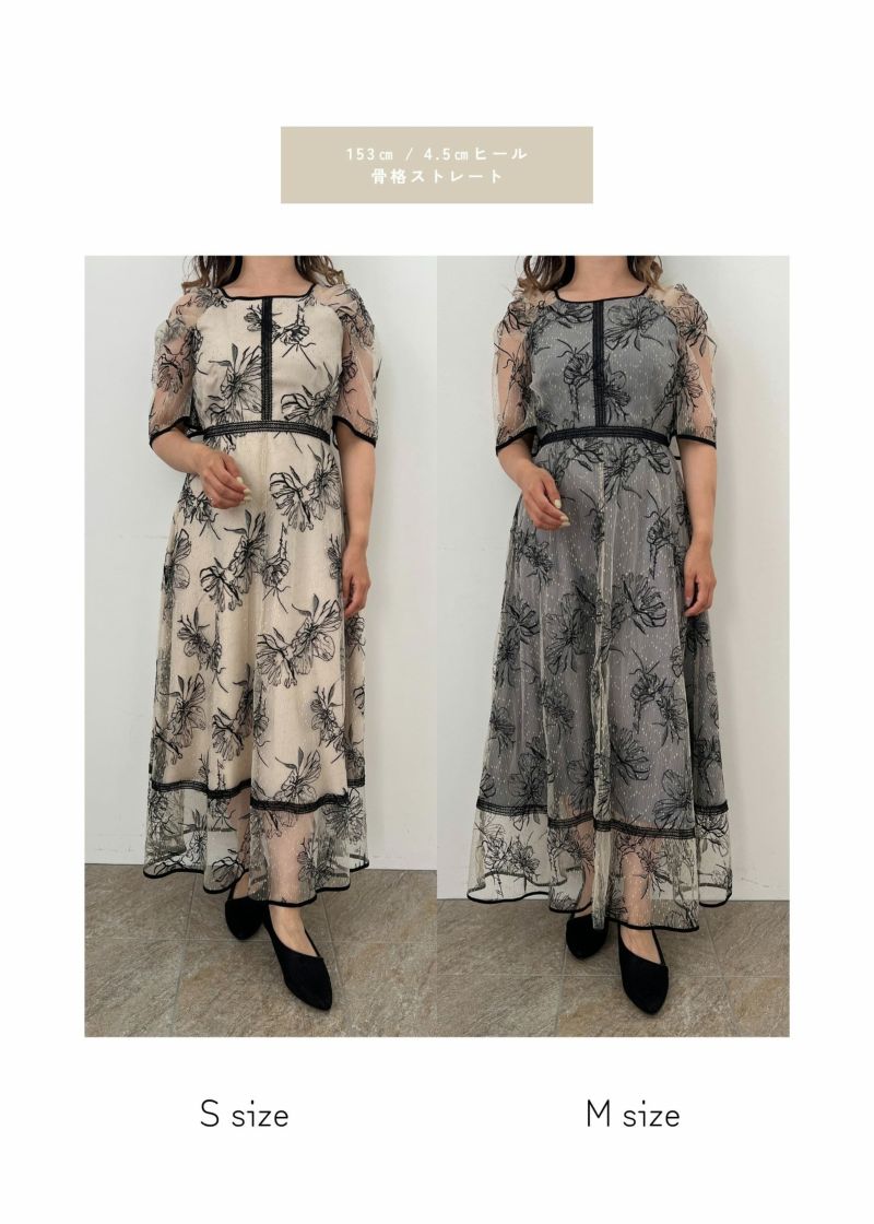 商品説明 大人気のオリジナル花柄刺繍デザインドレス。 全体に施された繊細な線画フラワー刺繍がアクセントとなり 動くたびにキラキラと煌めくダイヤモンドカット柄が甘すぎず上品な印象に。 さらに、ウエスト部分とスカートの裾にレースの配色パイピングを施し バランスよく自然なメリハリを演出。 高めの位置から切り替えることでスタイルアップと華奢見せ効果を叶えることができます。 裾にかけて緩やかに広がるAラインシルエットのフレア感と インナーを透け感のあるチュール生地より長くすることで 軽さを出しつつ足元に抜け感をプラス。 背面はファスナー仕様で、着脱も簡単。特別な日にも、シーンを選ばず華やかさをプラスしてくれる一枚です。 ※ハンガー掛けの商品画像が実際の商品のお色味に近くなっております。 ※商品画像は、光の当たり具合やパソコンなどの閲覧環境により、 実際の色味と異なって見える場合がございます。予めご了承ください。 おすすめのシーン 結婚式・披露宴・二次会・同窓会・謝恩会など 多様なシーンのコーディネートに使えます。 商品詳細 【備考】 ・裏地あり ・伸縮性なし ・後ろウエストゴム入り ・バックファスナー仕様 洗濯方法:クリーニング店にご相談ください。 ※その他お取り扱いに関しましては、商品に付属のアテンションタグをご覧ください。 原産国:中国 お問い合わせ品番:25617