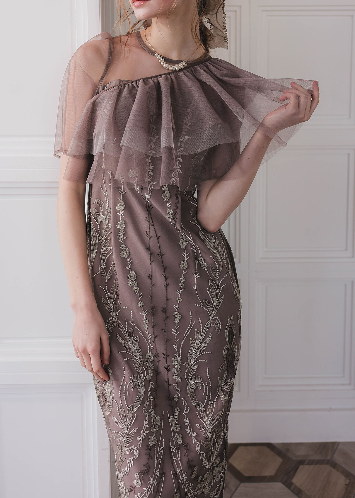 ケープなしのワンピース単体でご着用いただいても、成立する華やかさも嬉しいポイント。