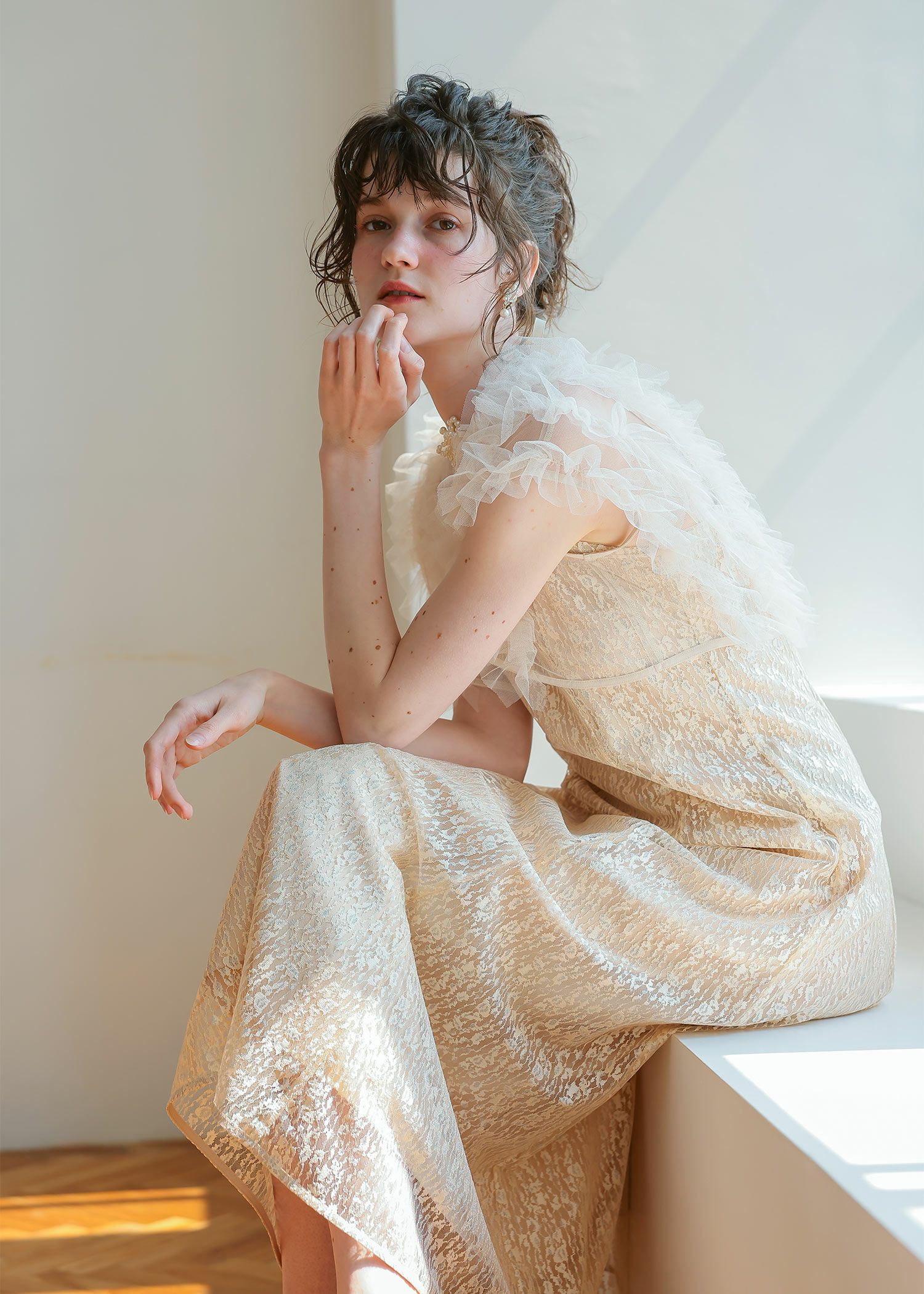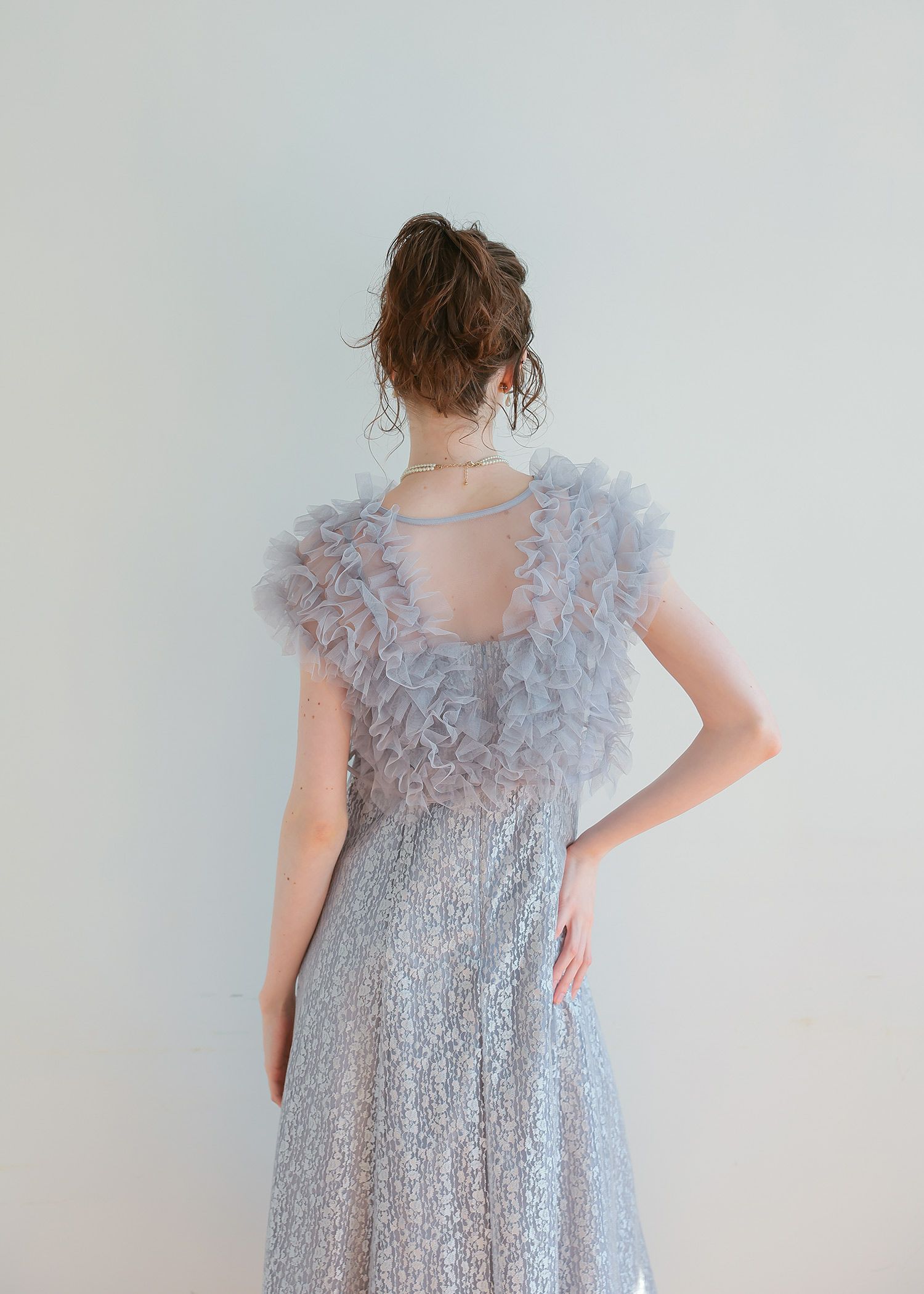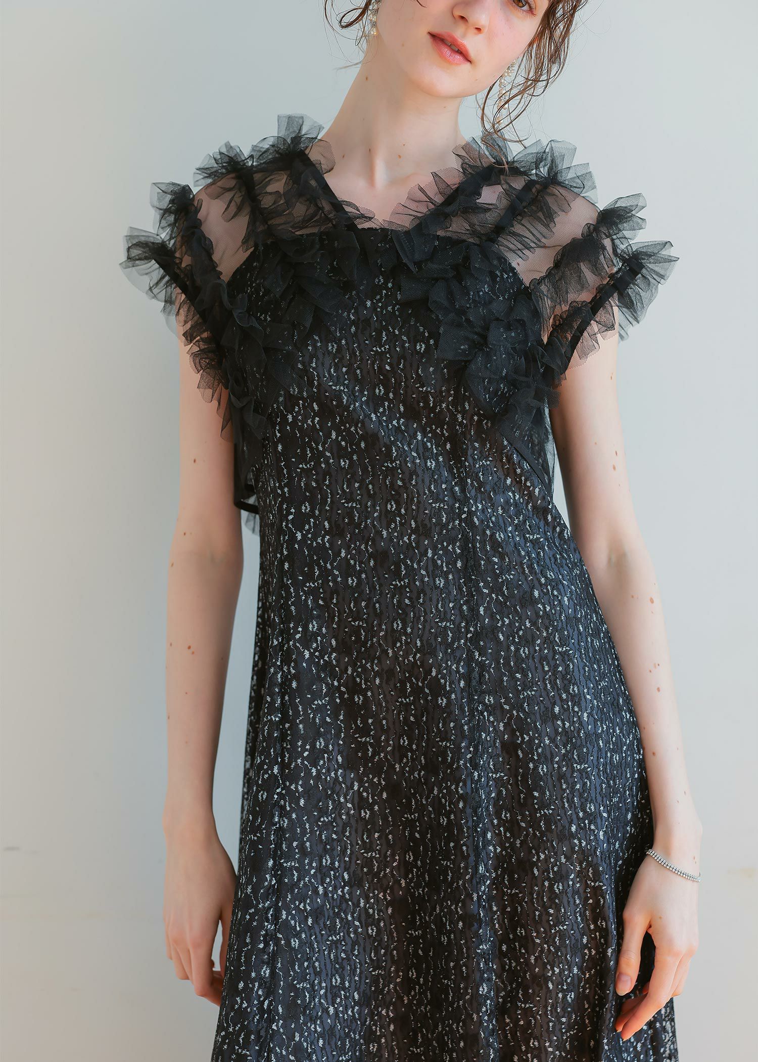 商品説明 ボリュームのあるフリルデザインと繊細なディテールが魅力の ボレロとワンピースがセットになったドレス。 フロントに施された繊細なチュールフリルがふんわりと肩を包み込み 二の腕をさりげなくカバー。 軽やかな透け感が上品な抜け感を与え、エレガントな雰囲気に。 ワンピースは抽象的な珍しい柄がアクセントとなり 光の角度によってラメがさりげなく煌めくため、派手になりすぎないデザインに。 身体のラインを拾いすぎず縦のラインをスッキリ見せてくれるため、脚長効果も期待できます。 ワンピースとボレロは分かれており、それぞれ単体での着用が可能です。 ※商品画像は、光の当たり具合やパソコンなどの閲覧環境により、 実際の色味と異なって見える場合がございます。予めご了承ください。 屋外の写真は通常より明るく見えています。 おすすめのシーン 結婚式・1.5次会・二次会・披露宴・お呼ばれ・成人式・同窓会 女子会・2次会謝恩会・パーティー・デート・演奏会・お食事会・ 発表会など多様なシーンのコーディネートに使えます。 商品詳細 【備考】 〈ボレロ〉 ・裏地なし ・透け感あり 〈ワンピース〉 ・裏地あり ・伸縮性なし ・後ろ背中部分ゴム入り ・背中心ファスナー 原産国:中国 お問い合わせ品番:25628 着用モデル身長176cm