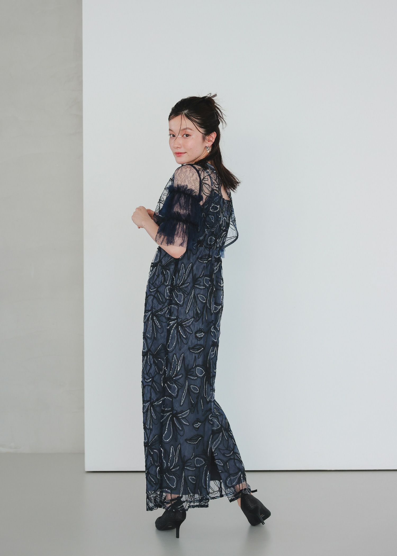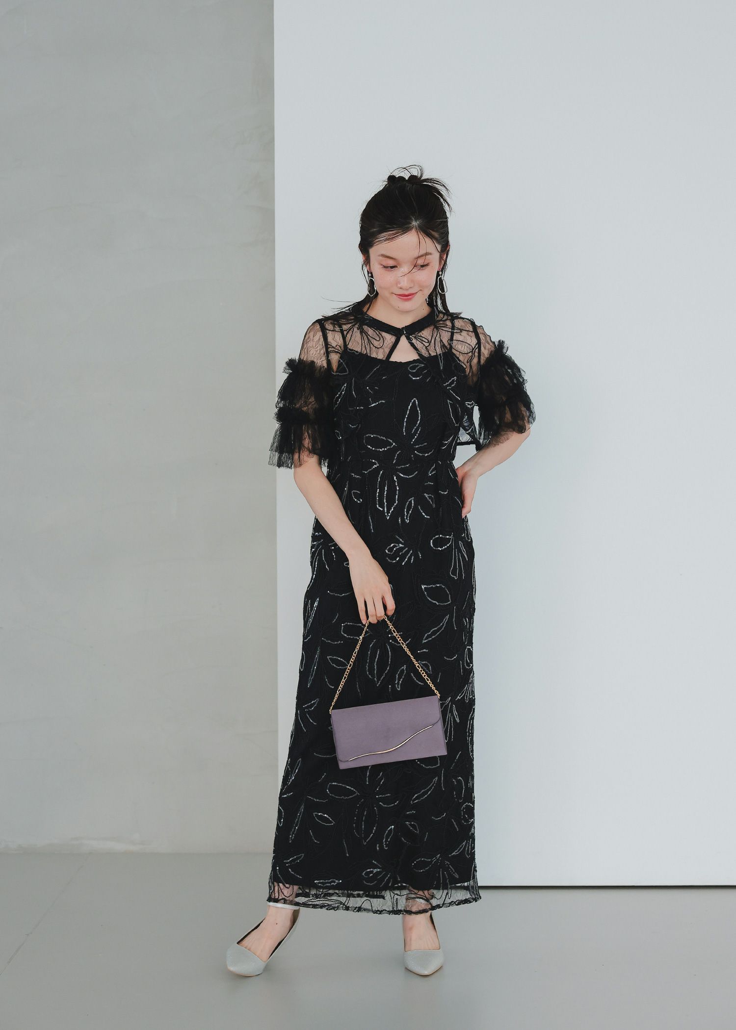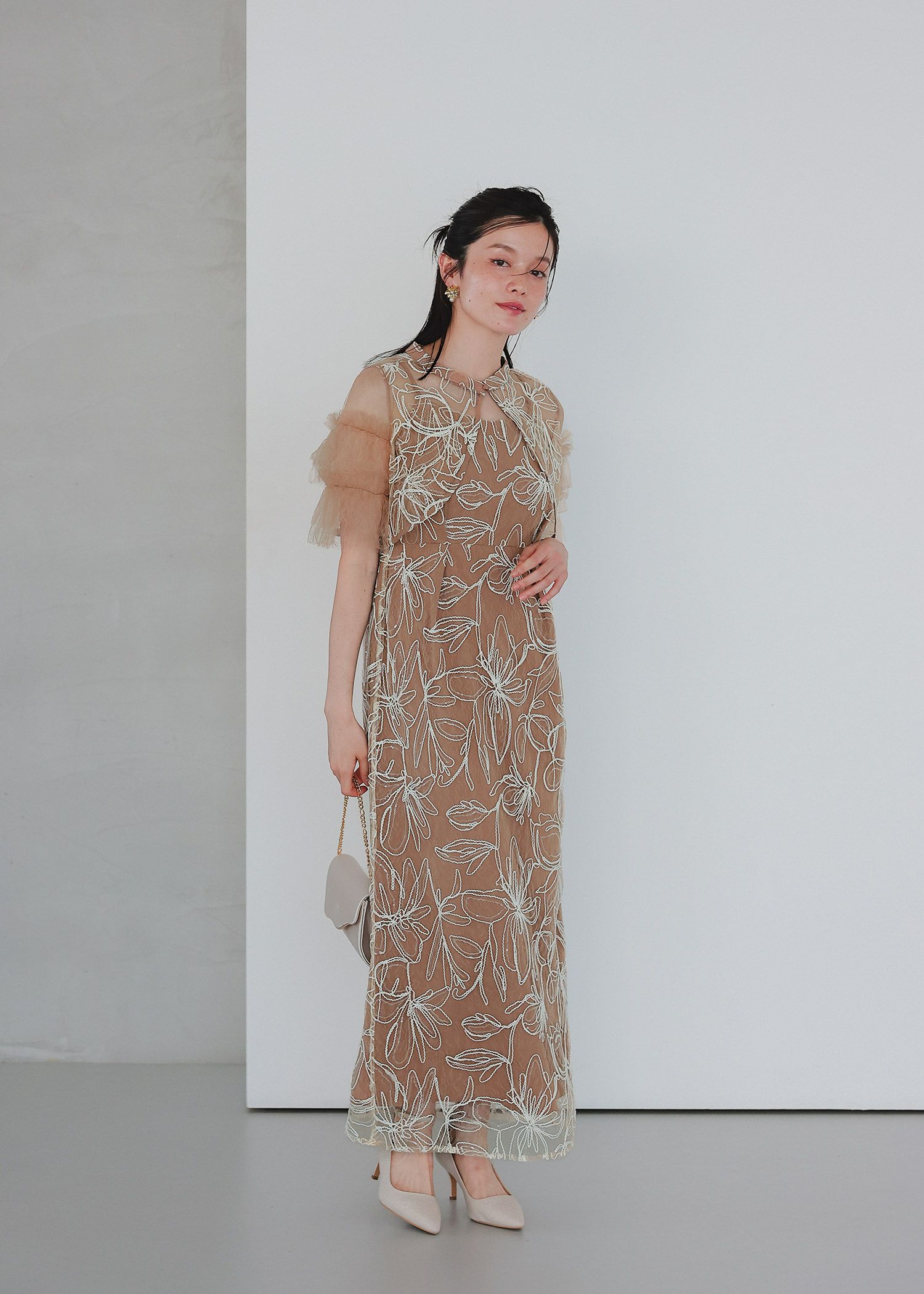 商品説明 ふわっとチュールとキラめくスパンコールの可愛さを詰め込んだドレス。 線で描いたような花柄刺繍が都会的な雰囲気を演出。 刺繍にはスパンコールが散りばめられており、 動くたびにさりげなくキラめくのがとっても綺麗。 短めのブラウス丈でスタイルアップも。 袖のふわっと柔らかいレースチュールが優しい印象をプラスします。 前後どちらをフロントにしても着られるタイプなので、 お好みに合わせて変えていただけます。 ワンピースはIラインのストレートなシルエットで大人っぽく。 スカートの前に入ったタックは、立体感を生み出すだけでなく ウエスト周りをスッキリと見せつつ、着心地にゆとりも与えてくれます。 タイムレスなデザインで長く着ていただける、 程よくシンプルで洗練された印象のお呼ばれドレスです。 ※商品画像は、光の当たり具合やパソコンなどの閲覧環境により、 実際の色味と異なって見える場合がございます。予めご了承ください。 おすすめのシーン 結婚式・披露宴・二次会・同窓会・謝恩会など 多様なシーンのコーディネートに使えます。 商品詳細 【備考】 ・裏地あり ・伸縮性なし ・後ろウエストゴム入り ・バックファスナー仕様 洗濯方法:クリーニング店にご相談ください。 ※その他お取り扱いに関しましては、商品に付属のアテンションタグをご覧ください。 原産国:中国 お問い合わせ品番:25637 着用モデル身長160cm