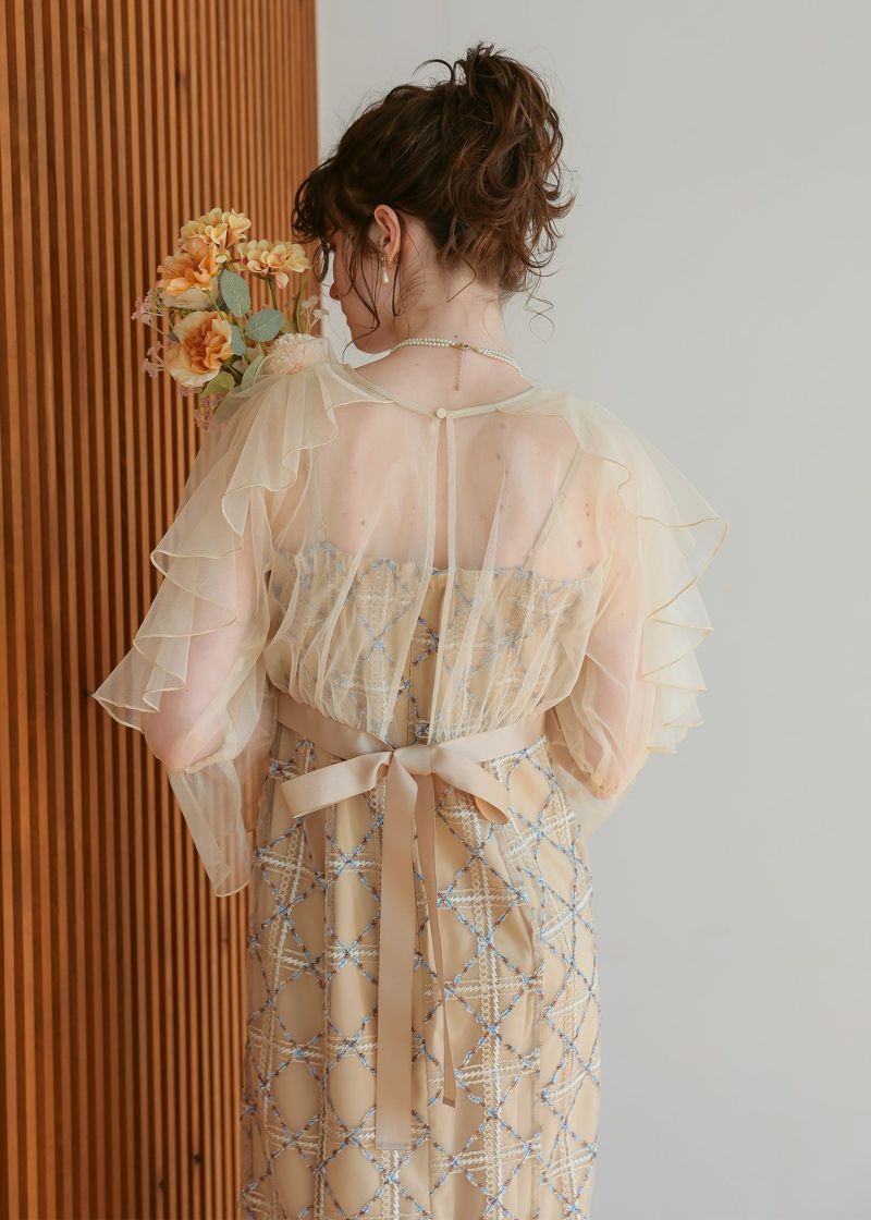 商品説明 透け感とお袖が特徴のボレロ×動くたびに光り輝く上品なデザインのIラインドレス ユニークなデザインのフリルボレロに、 ワンピースにはチェック柄ときらきらと輝くモール糸を施し 華やかさと立体感を演出。 透け感のあるシアー素材を使用したフレアスリーブは、手元まで美しく華やかに。 バックスタイルのリボンが後ろ姿も抜かりなく女性らしさを演出してくれます。 ワンピースはアジャスター付きなので長さの調整もでき、バックスリットが入っているので 足さばきもよく歩きやすい一着です。 それぞれ単体で使用することができるので、レイヤードスタイルやジャケット合わせ等幅広いスタイルを楽しんでいただけます。 結婚式のおよばれや、卒業パーティーなど華やかなシーンにぴったりなドレスです。 ※ハンガー掛けの商品画像が実際の商品のお色味に近くなっております。 ※商品画像は、光の当たり具合やパソコンなどの閲覧環境により、 実際の色味と異なって見える場合がございます。予めご了承ください。 おすすめのシーン 結婚式・披露宴・二次会・同窓会・謝恩会など 多様なシーンのコーディネートに使えます。 商品詳細 【備考】 ・裏地あり ・伸縮性なし ・後ろウエストゴム入り ・バックファスナー仕様 洗濯方法:クリーニング店にご相談ください。 ※その他お取り扱いに関しましては、商品に付属のアテンションタグをご覧ください。 原産国:中国 お問い合わせ品番:25639