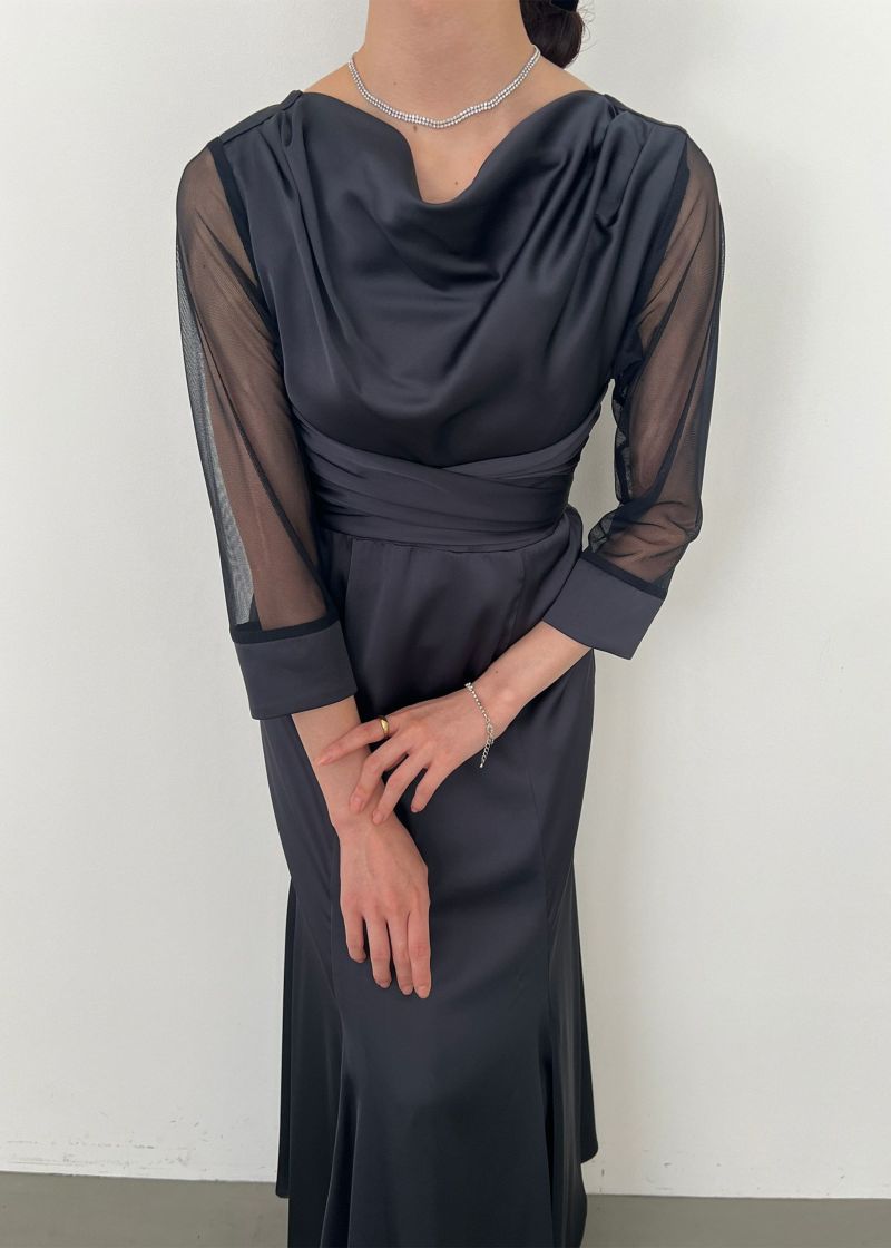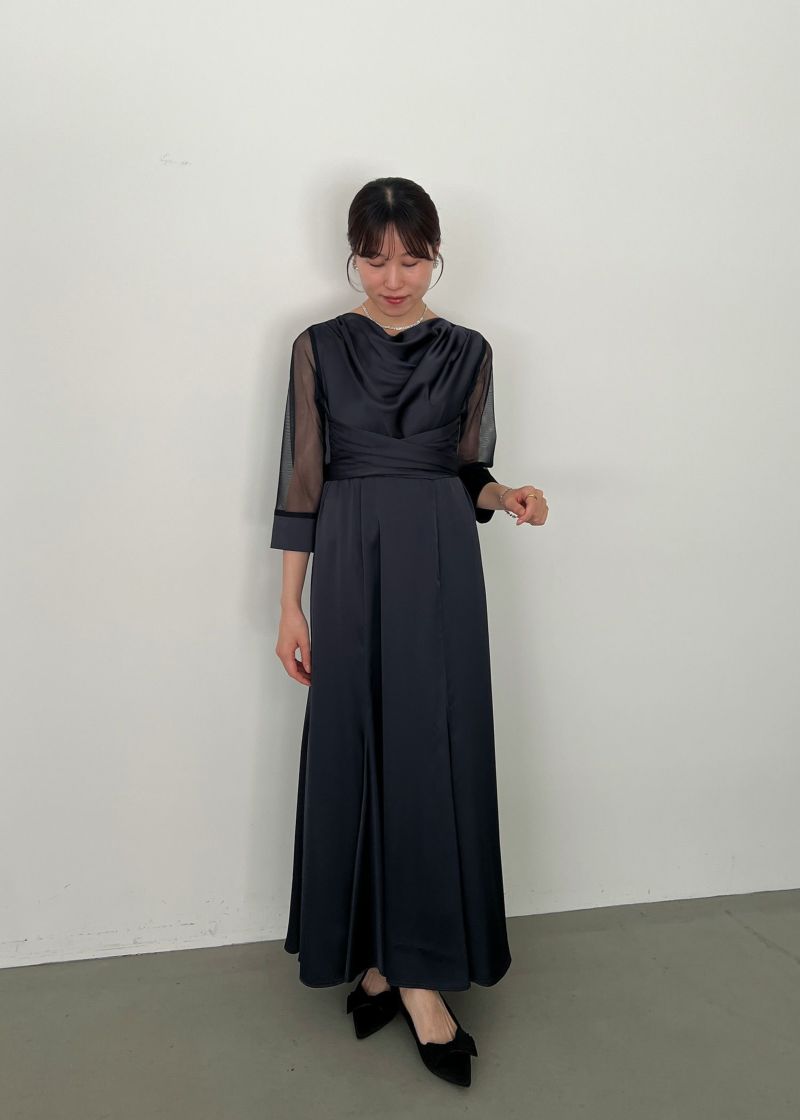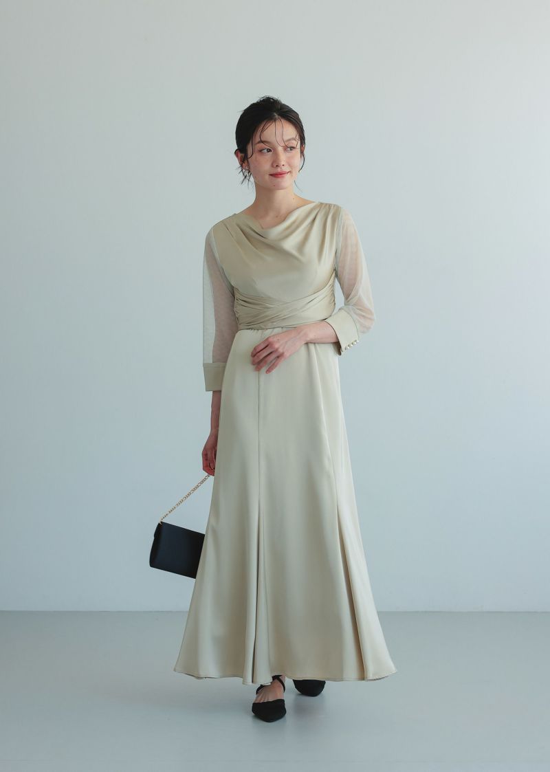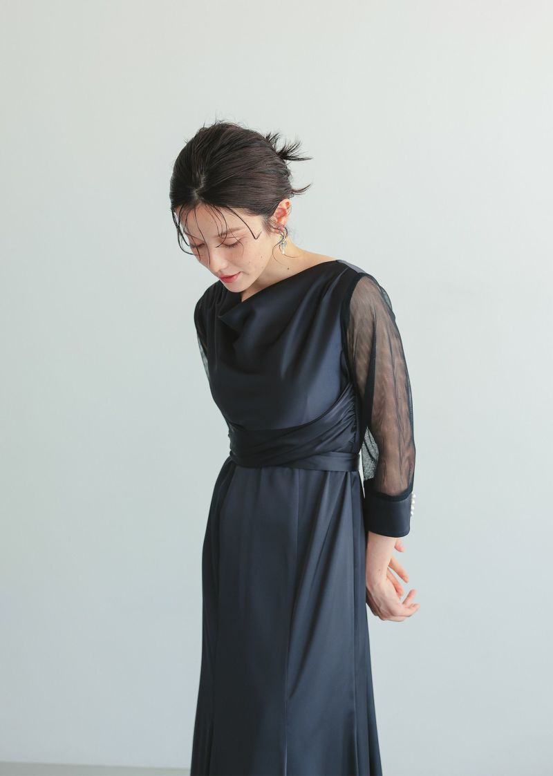 緩やかなドレープデザインと、サテン生地を掛け合わせ