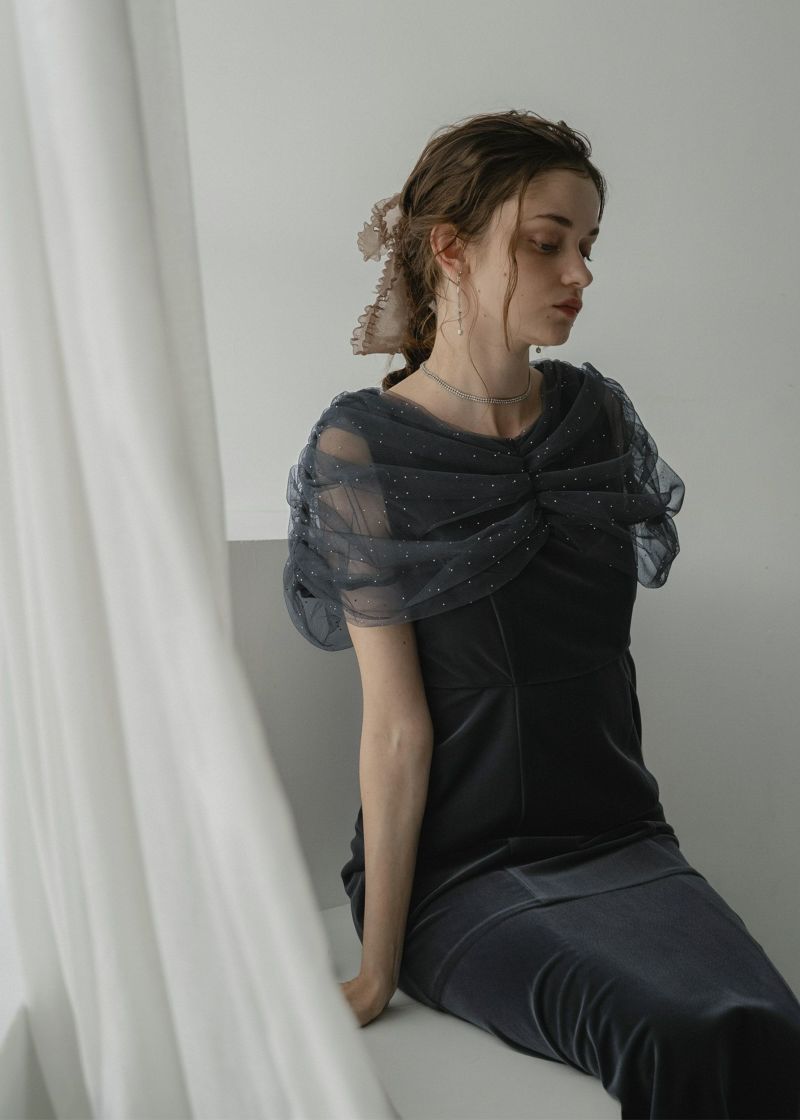 控えめなラメのドットが映える繊細なチュールが肩をふんわりと包み込み、
