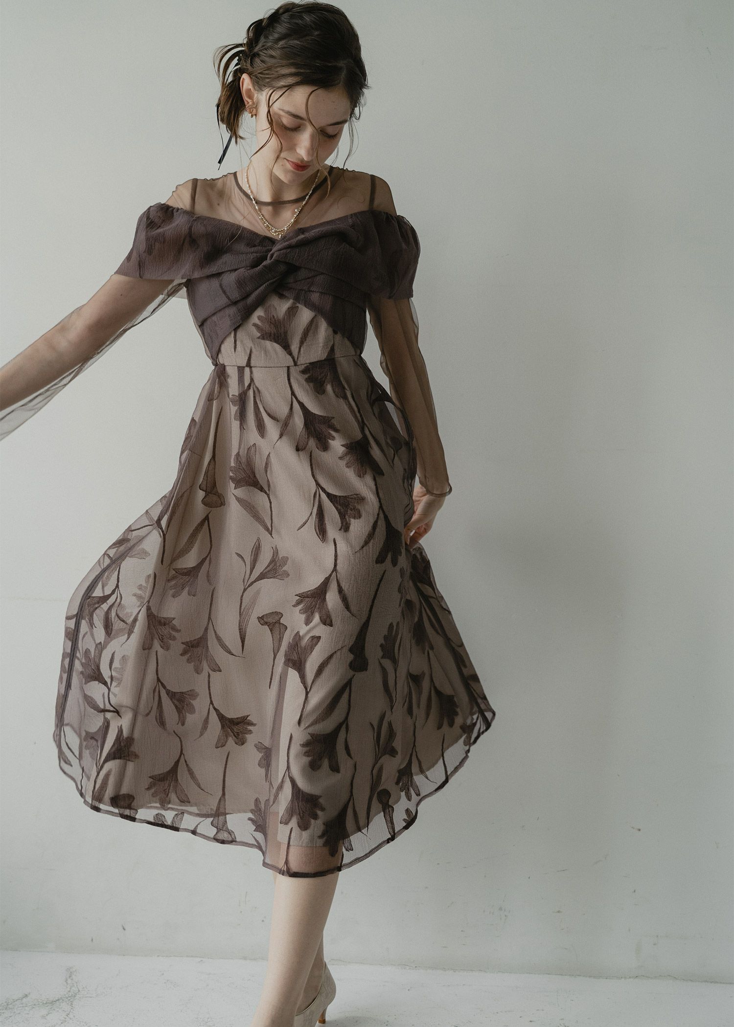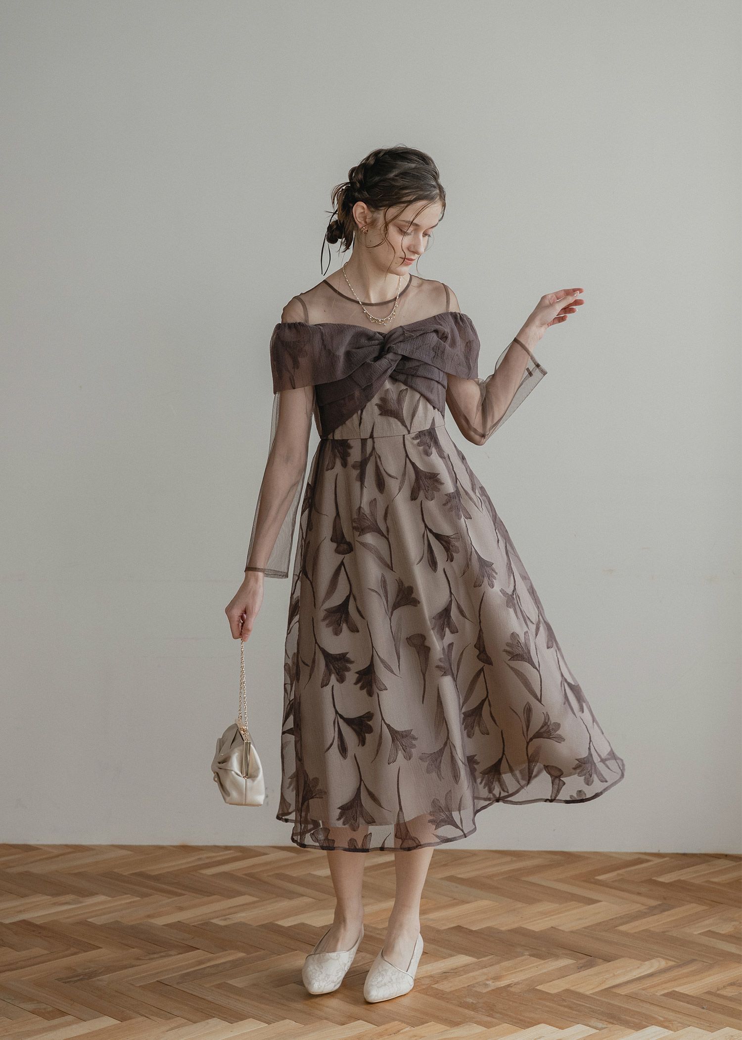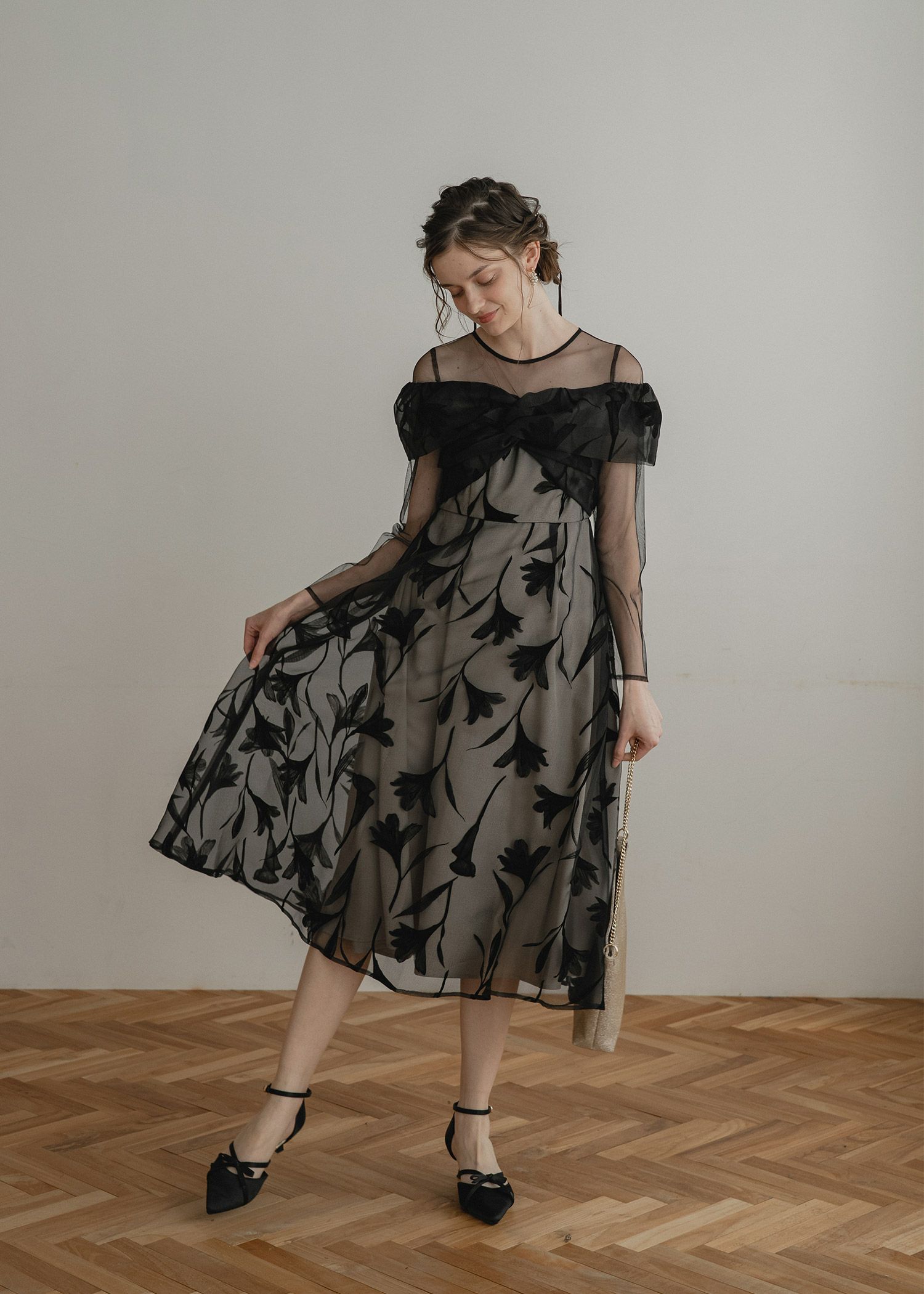 商品説明 繊細なチュールと立体的なリボンモチーフが目を惹く一着。 シアー素材がデコルテを美しく演出し、 ギャザーを寄せたボリューム感のある胸元が印象的。 フロッキー加工を施したオーガンジー地に上品なフラワー刺繍を重ね、 袖口まで透け感のあるスリーブが女性らしさと程よい抜け感をプラス。 甘すぎず気品のあるデザインで、パーティーや特別な日のお呼ばれスタイルにぴったりです。 ※ハンガー掛けの商品画像が実際の商品のお色味に近くなっております。 ※商品画像は、光の当たり具合やパソコンなどの閲覧環境により、 実際の色味と異なって見える場合がございます。予めご了承ください。 おすすめのシーン カジュアルな結婚式・二次会・お呼ばれ・成人式・同窓会・ 女子会・謝恩会 パーティー・演奏会・お食事会など多様なシーンのコーディネートに使えます。 商品詳細 【備考】 ・裏地あり ・バックファスナー仕様 ・伸縮性なし ・くるみボタン1つあり ・バックウエストゴム仕様(伸縮性あり) 洗濯方法:クリーニング店にご相談ください。 ※その他お取り扱いに関しましては、商品に付属のアテンションタグをご覧ください。 原産国:中国 お問い合わせ品番:25665