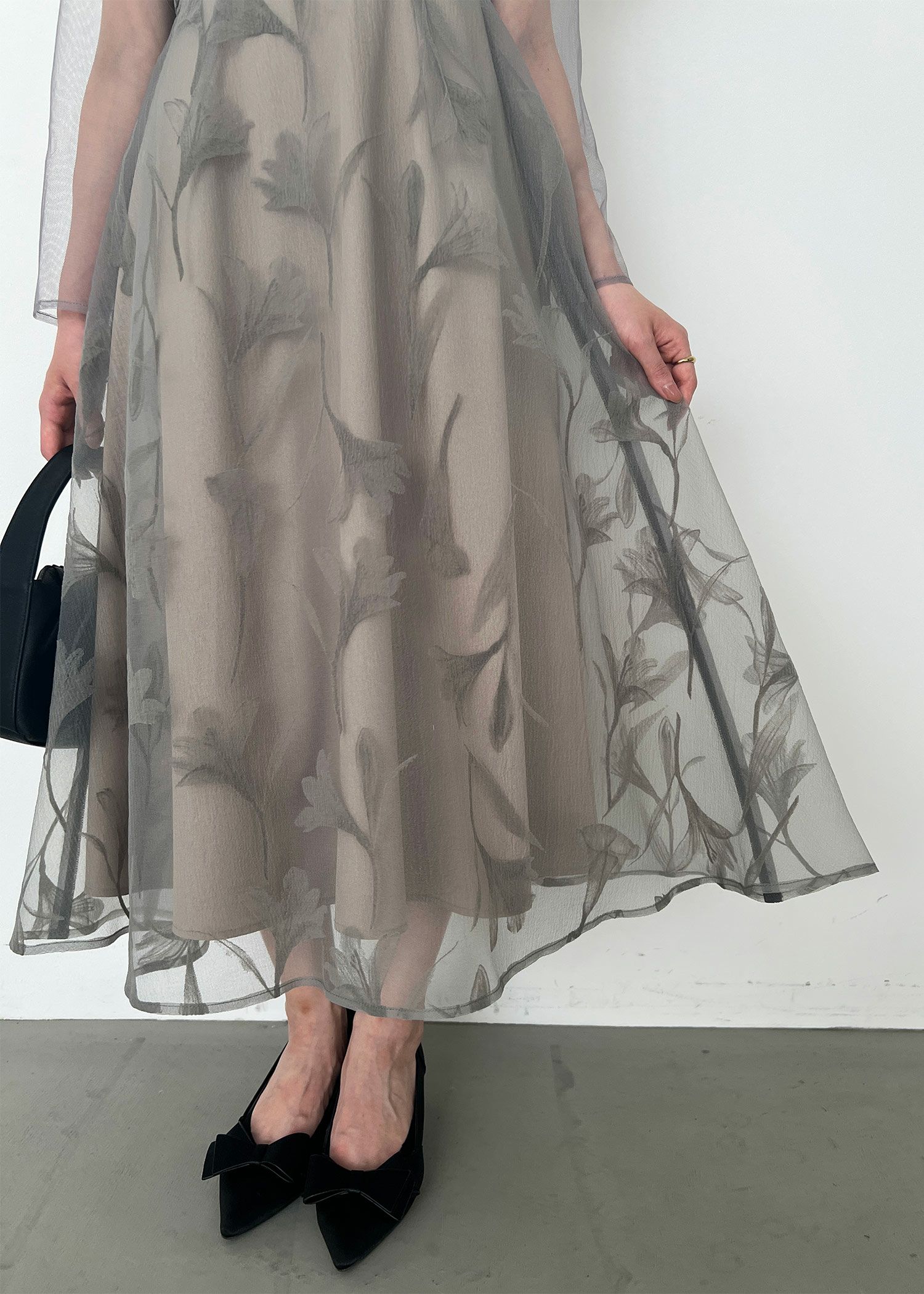 材質 ・フロッキーオーガンジー地 : ナイロン100% ・チュール地 : ポリエステル100% ・裏地 : ポリエステル95% / ポリウレタン5% 厚地 薄地 透ける 透けない 柔らかい 固い 光沢 マット 洗濯方法:クリーニング店にご相談ください。 ※その他お取り扱いに関しましては、商品に付属のアテンションタグをご覧ください。