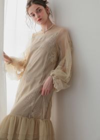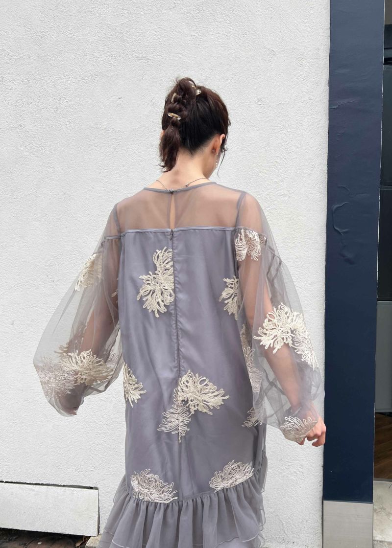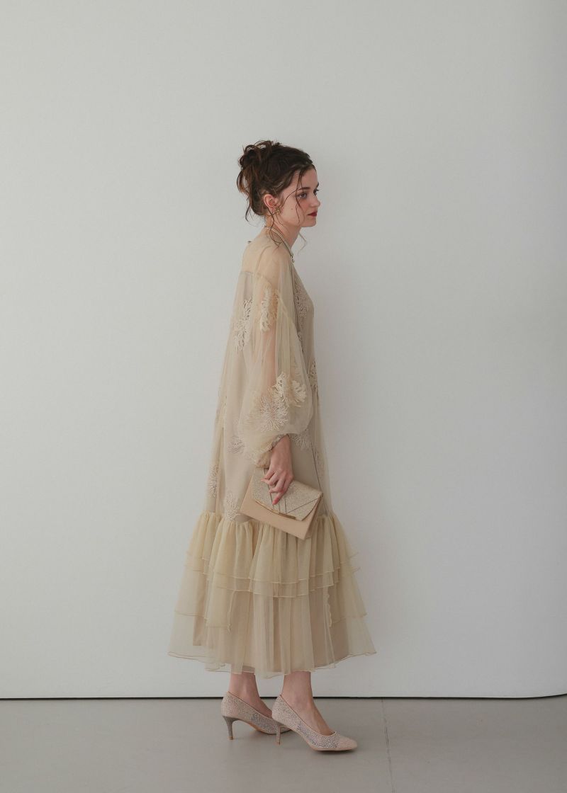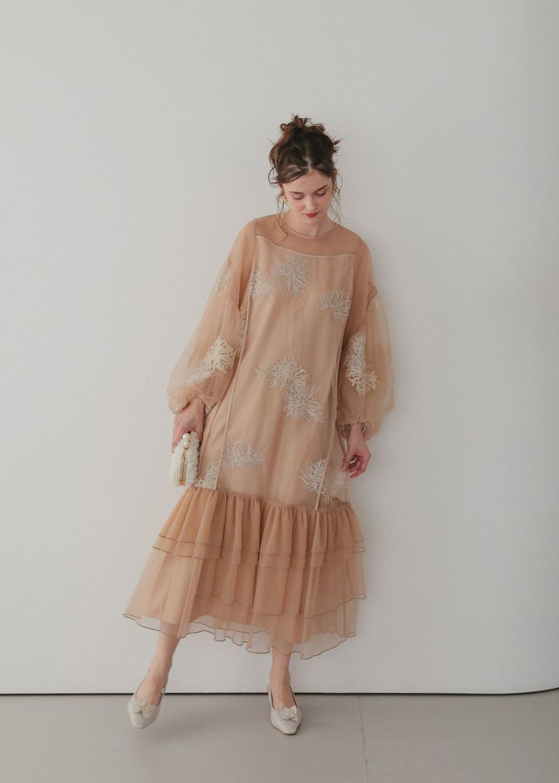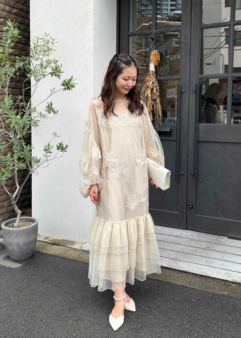 商品説明 ふわふわなシルエットや素材感がかわいいドレス。 身頃部分や袖に施された繊細な花柄刺繍も目を惹くポイントです。 チュール生地と、裏地を微配色にすることでメリハリ感がうまれ、ふんわりとしたシルエットながらも着ぶくれしない仕上がりに。 バルーンタイプの袖で、気になる肩幅や二の腕もさりげなくカバーしてくれます。 他にはないデザインで、人と被りたくない方におすすめな個性の光る1点です ※ハンガー掛けの商品画像が実際の商品のお色味に近くなっております。 ※商品画像は、光の当たり具合やパソコンなどの閲覧環境により、 実際の色味と異なって見える場合がございます。予めご了承ください。 おすすめのシーン カジュアルな結婚式・二次会・お呼ばれ・成人式・同窓会・ 女子会・謝恩会 パーティー・演奏会・お食事会など多様なシーンのコーディネートに使えます。 商品詳細 【備考】 ・裏地付き ・後ろ中心ファスナー ・お袖やデコルテ部分透け感あり ・伸縮性なし ・袖口ゴムなし 洗濯方法:クリーニング店にご相談ください。 ※その他お取り扱いに関しましては、商品に付属のアテンションタグをご覧ください。 原産国:中国 お問い合わせ品番:25671 着用モデル身長174cm