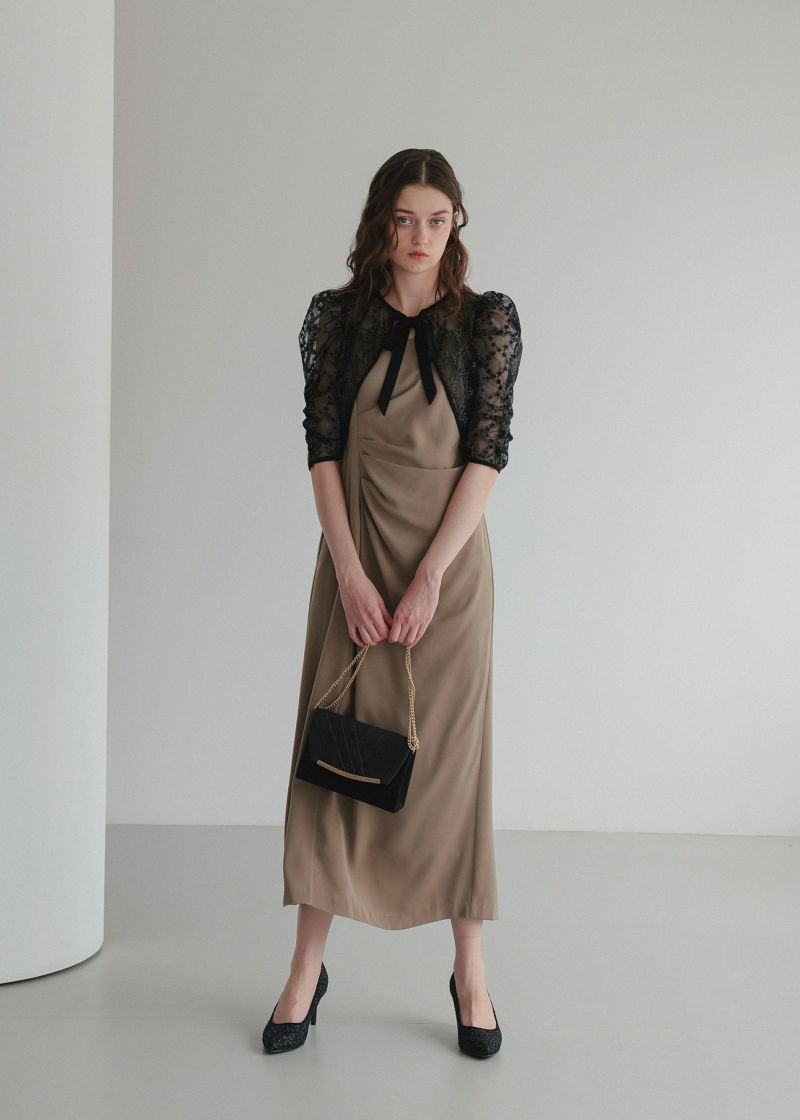 ワンピースはすっきりとしたIラインに、ドレープを施し高級感を演出。