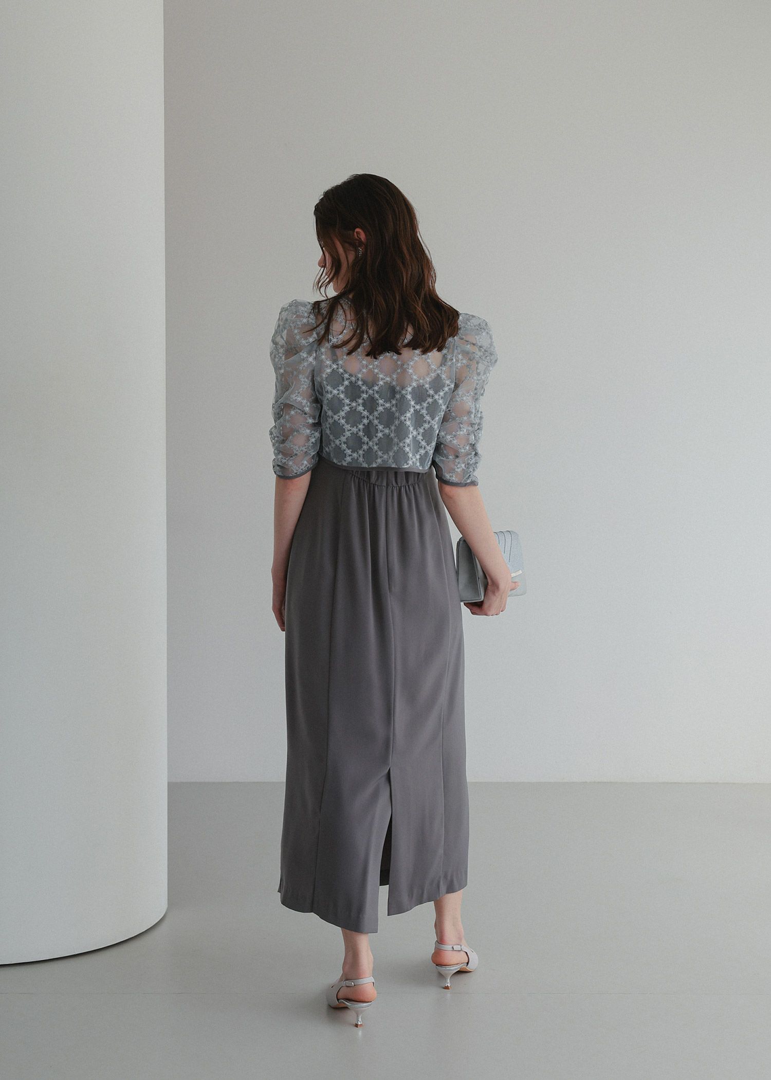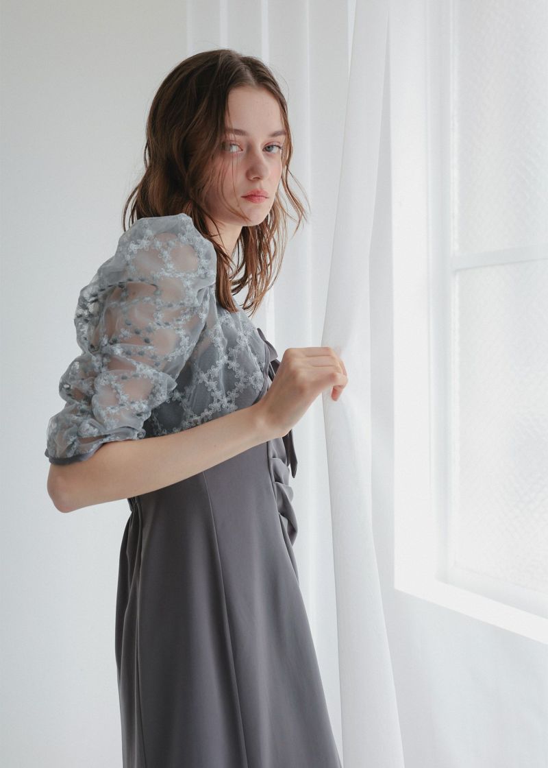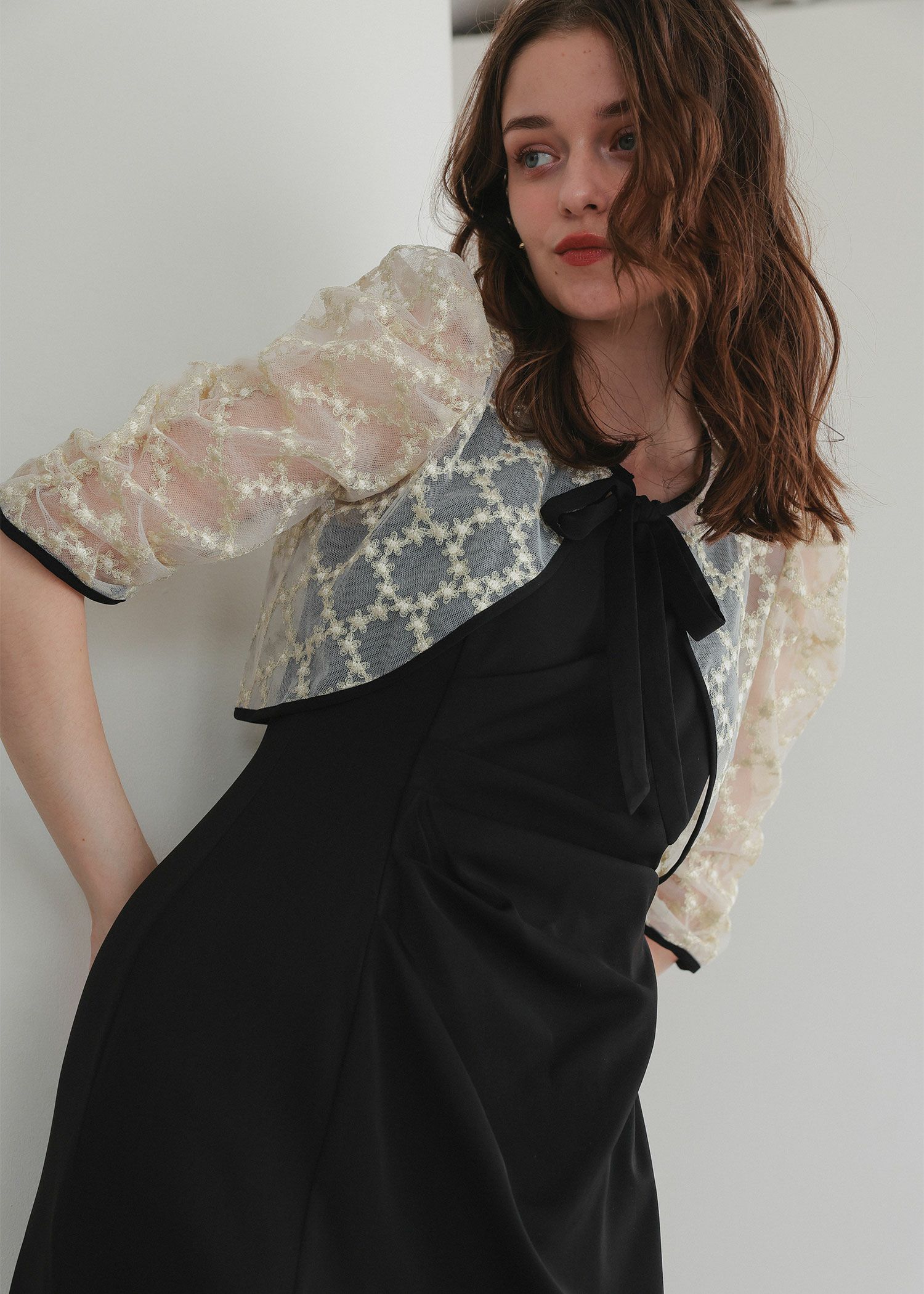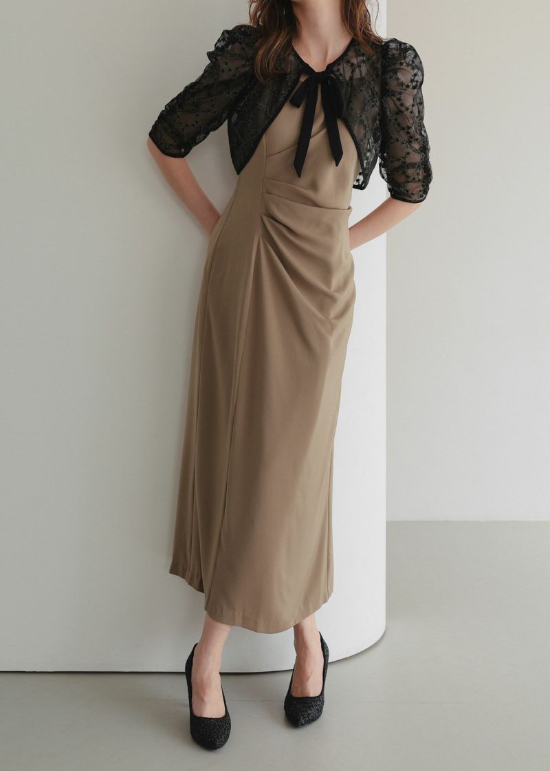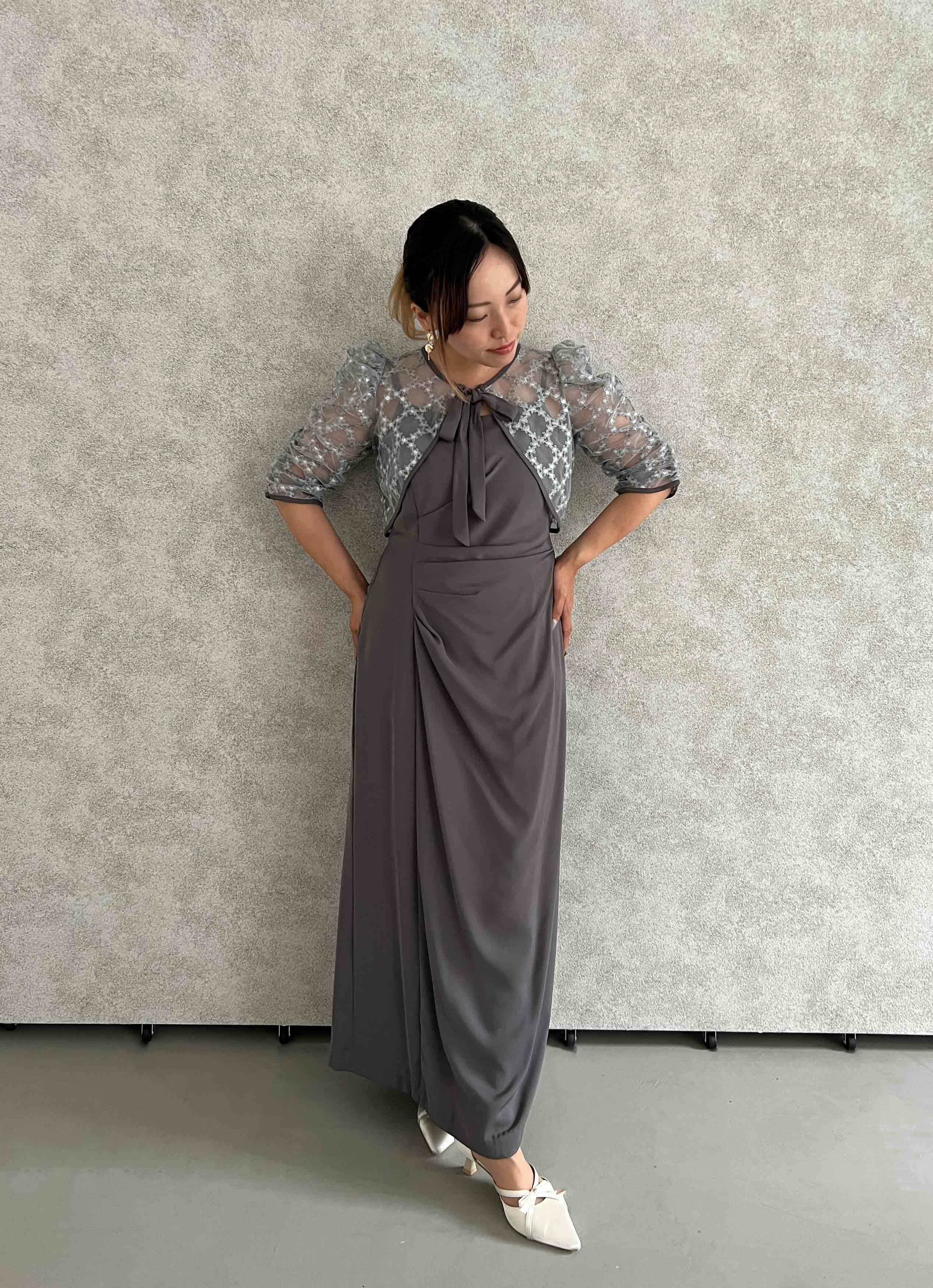 ダイヤ柄のレースボレロとドレープ感が美しいドレスのセットアイテム