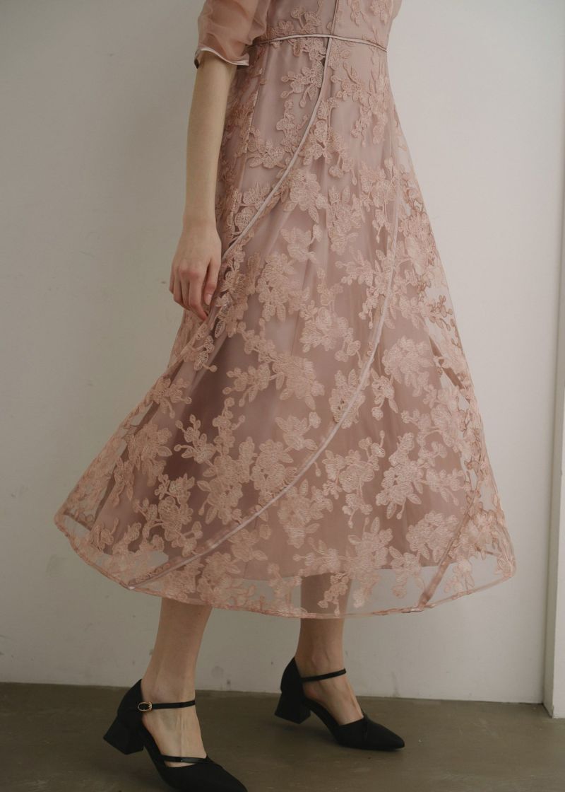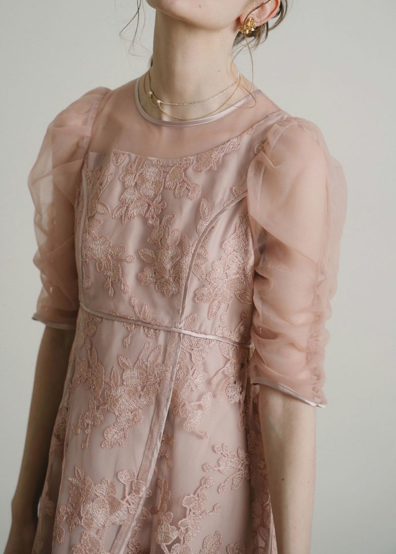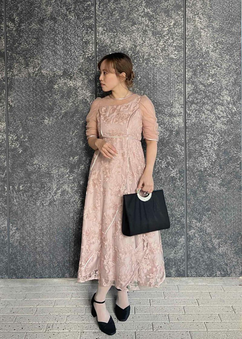 キラリとした花柄刺繍が目を引く華やかなお呼ばれドレス。