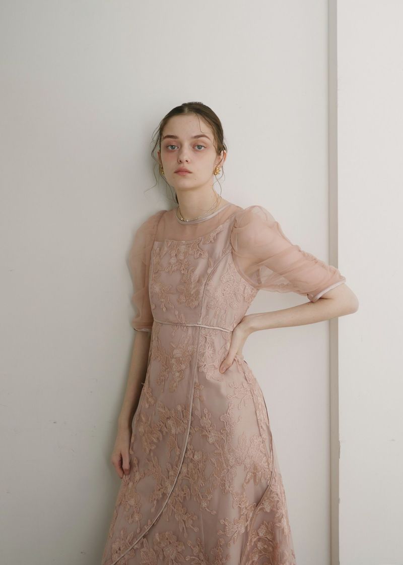 肩の部分や袖には、シアーなチュール素材を使用し、抜け感をプラス。